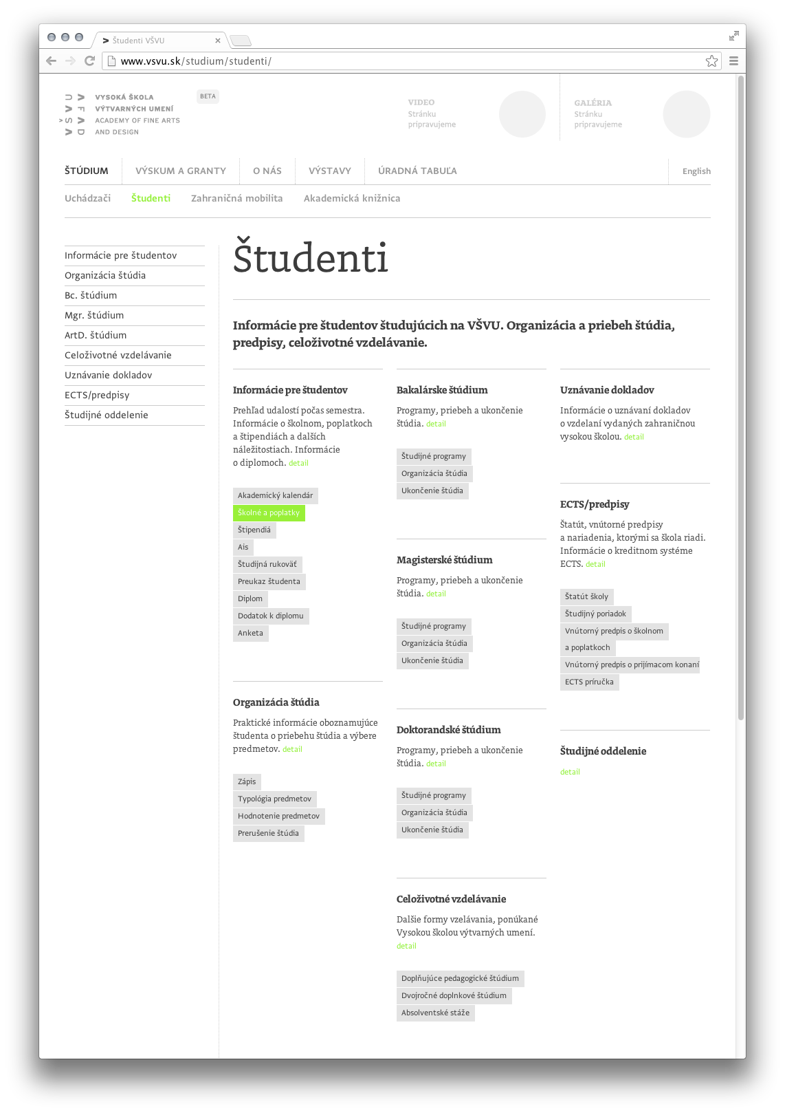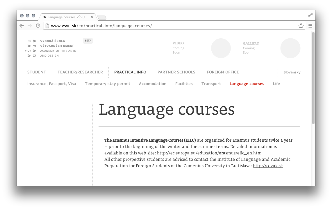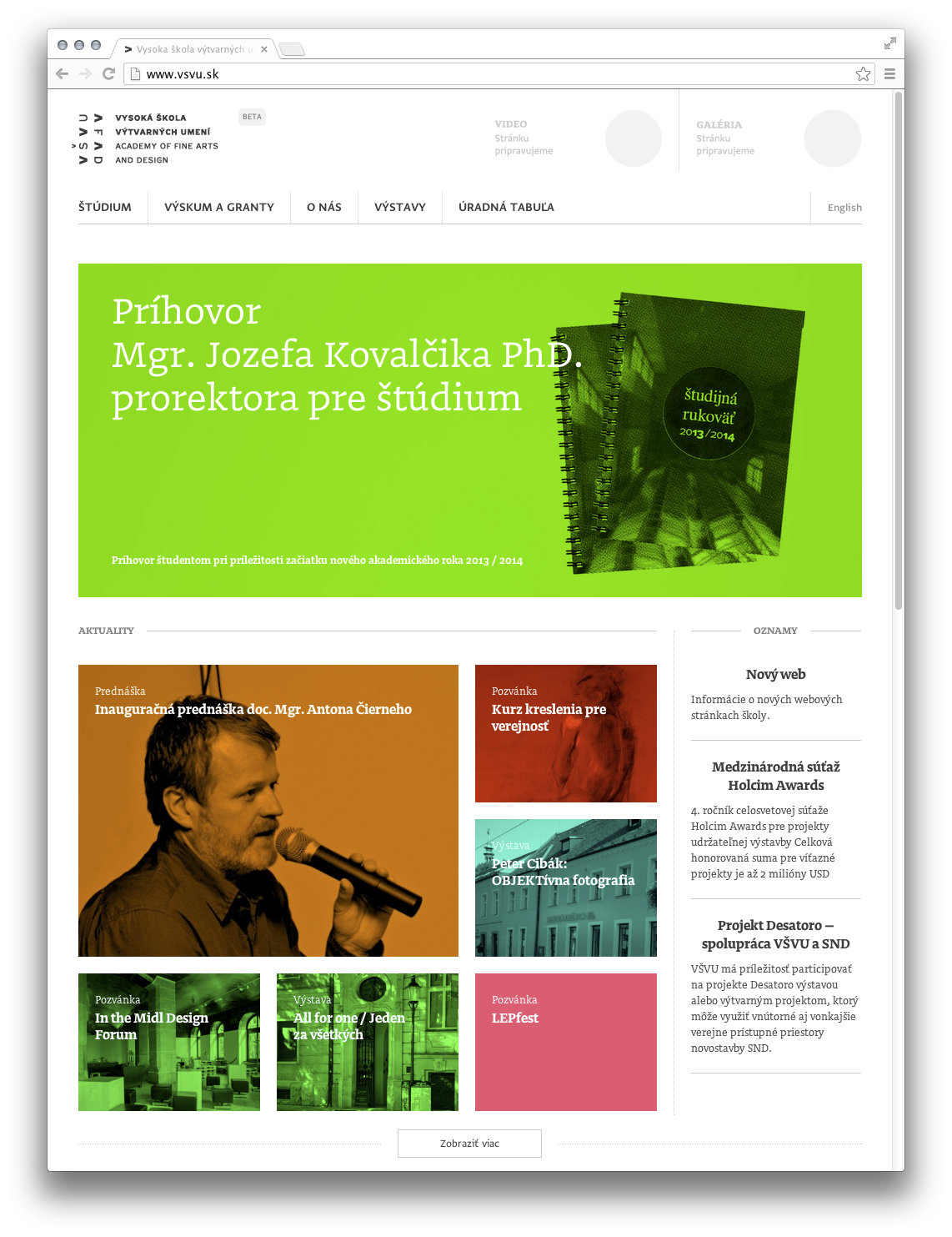 The redesigned website of Vysoká škola výtvarných umení, the Academy of Fine Arts and Design in Bratislava, Slovakia, uses typefaces by two of the school’s alumni: Doko by Ondrej Jób (2011) and Greta Sans by Peter Biľak (2012, together with Nikola Djurek).