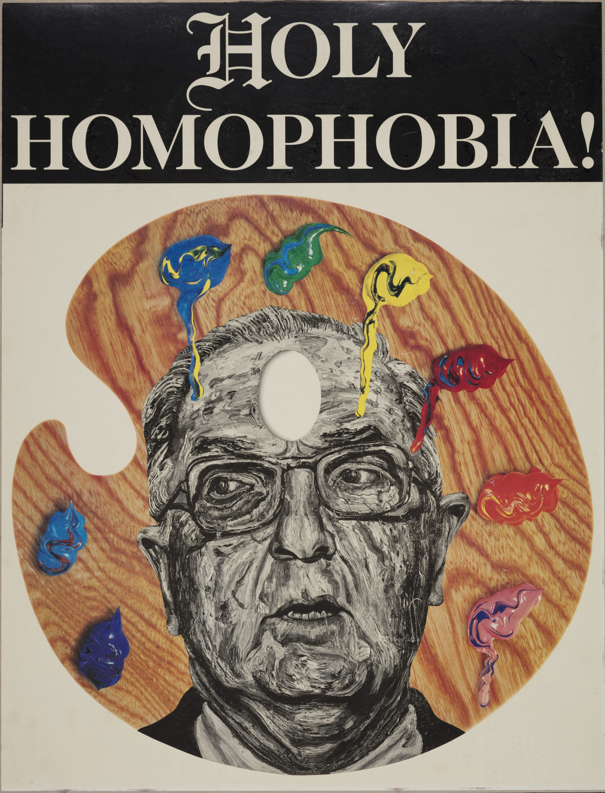 As one of the mainstays of the Los Angeles street art scene in the 1980s and 1990s, Robbie Conal was known for his satirical images calling out hypocrisy and skewering right-leaning political figures. Here he has reproduced the visage of Jesse Helms—a republican senator from North Carolina, and a leading figure in a years-long charge to severely restrict, if not outright eliminate, arts funding for artists addressing LGBTQ themes or stories in their work—creating a damning portrait of the sanctimonious language the legislator used to agitate for his homophobic worldview. As Conal told the L.A. Times: “[Helms is] an icon for the mean spirit that’s sweeping the country. We in the arts community are just getting a dose of it now, but poor people—and people of color—have been suffering through it for the past 10 years.” The image of Helms superimposed on an artist’s palette (where the thumb-hole creates a void in the senator’s head) was also produced as a billboard, which was located in West Hollywood and initially carried the tagline of “Artificial Art Official,” (Conal’s plan was to change the caption multiple times over the course of three months).