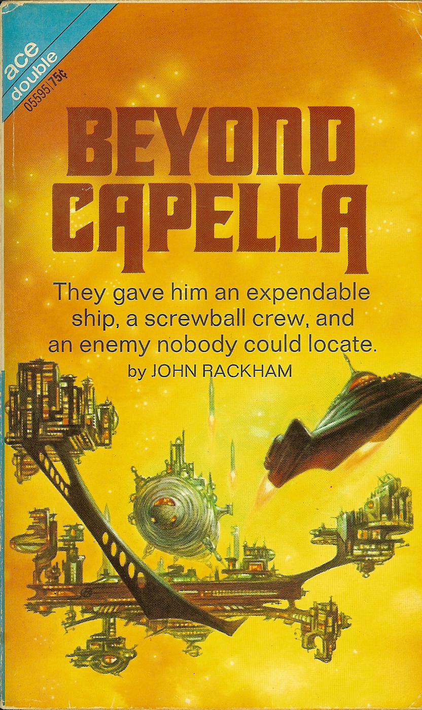 Science fiction novel by John T. Phillifent, written under his pen name John Rackham, and published in 1971 as Ace Double #05595. The font used for the title of this book is Davison Bolero, which includes numerous descending alternates for several characters. The smaller text appears to be set in Folio, with a short J in the author’s name. Cover art by Frank Kelly Freas.