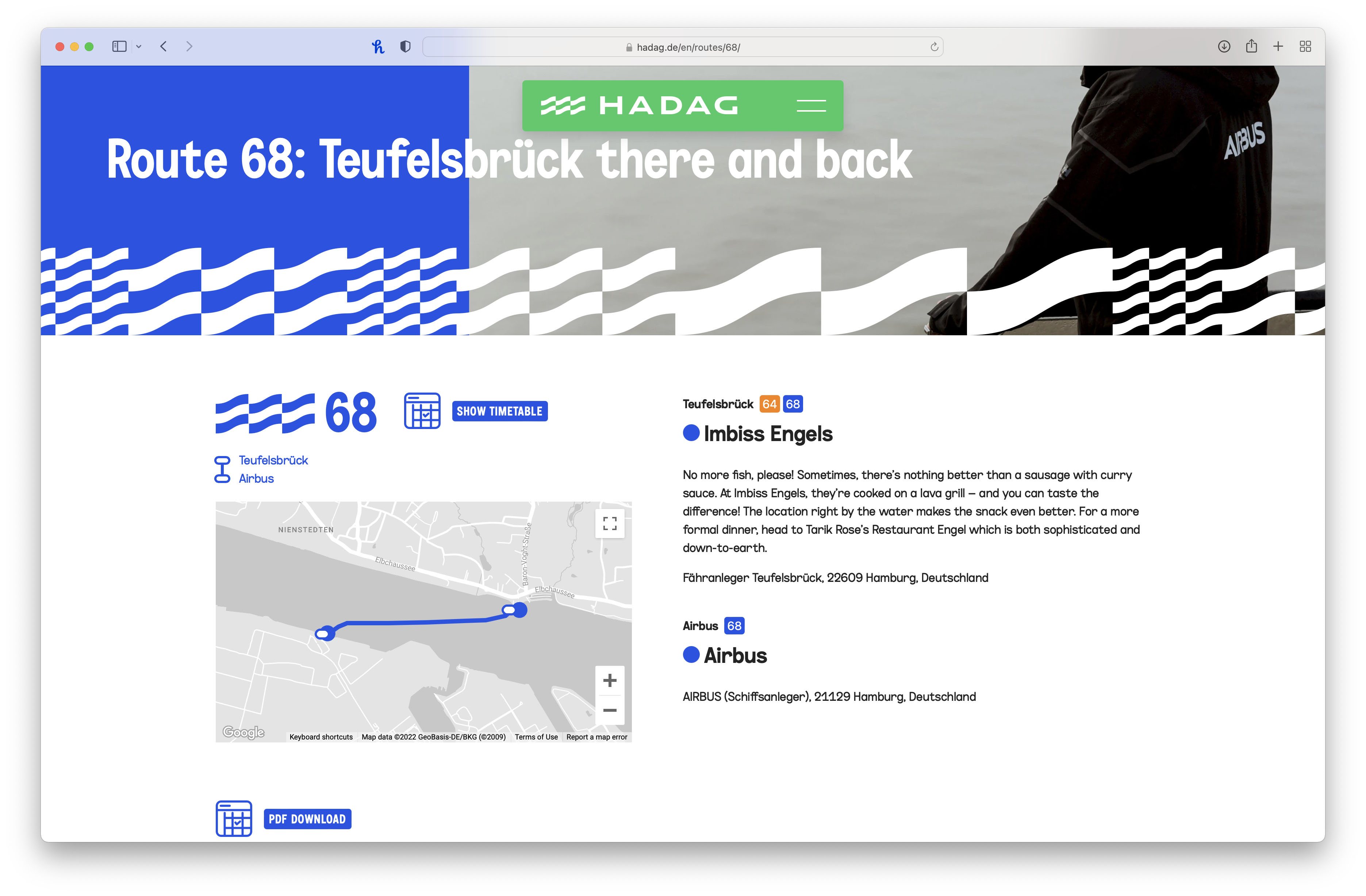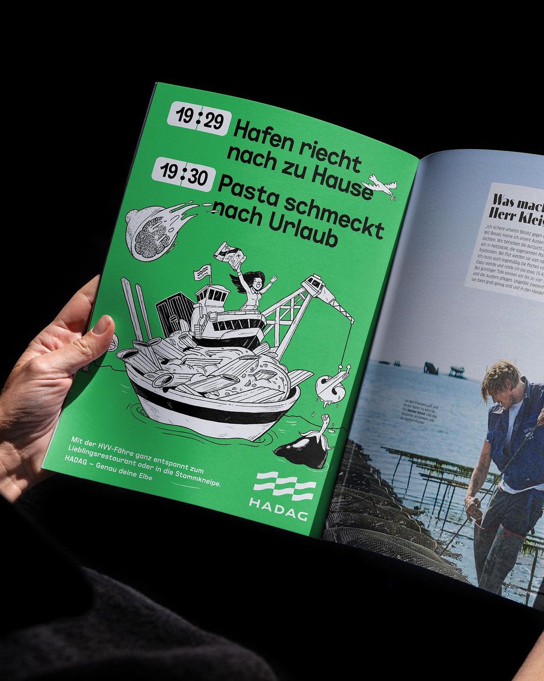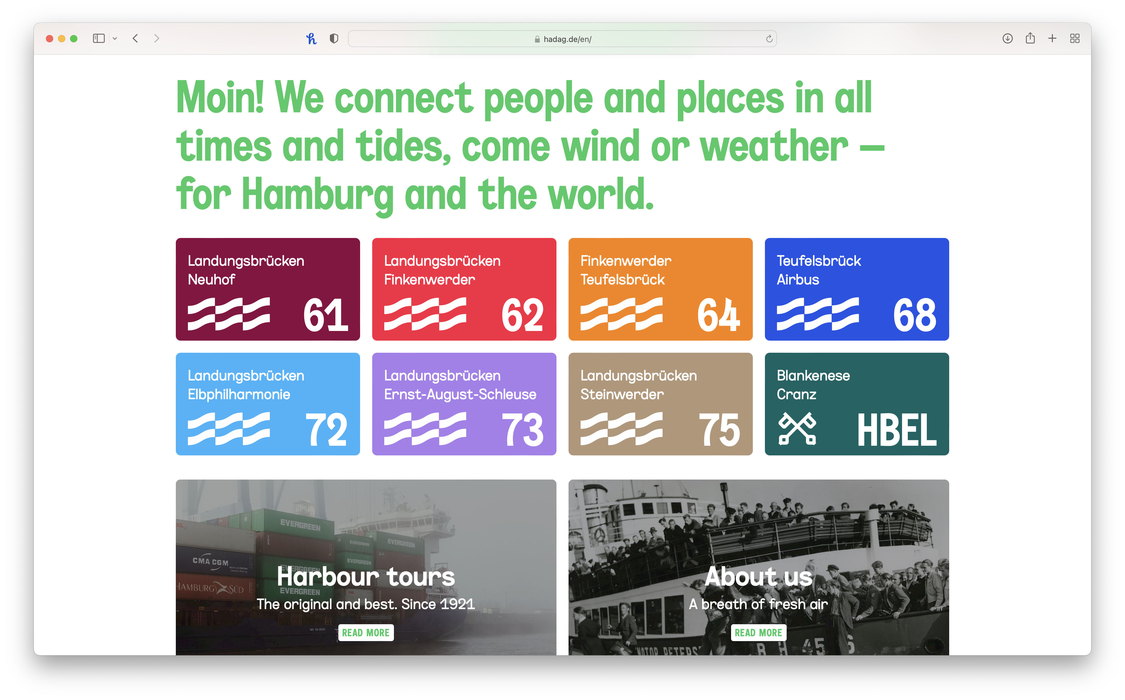 HADAG is the one and only provider of port transport and on the Elbe within the HVV, Hamburg’s public transport network. On eight lines with 20 berths and an annual covered distance of more than 330,000 nautical miles, HADAG with its ships and more than 180,000 departures per year. HADAG was founded in 1888.