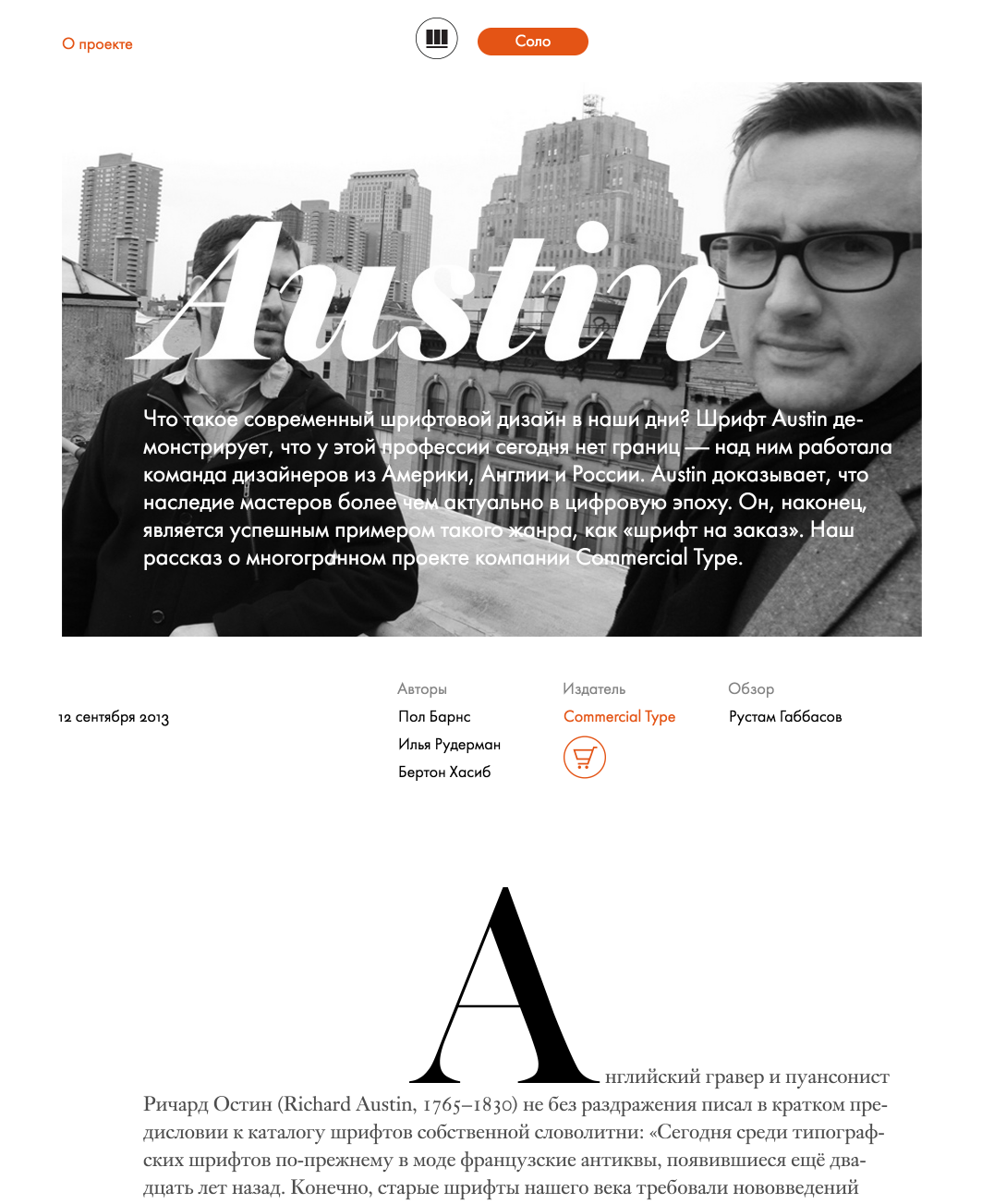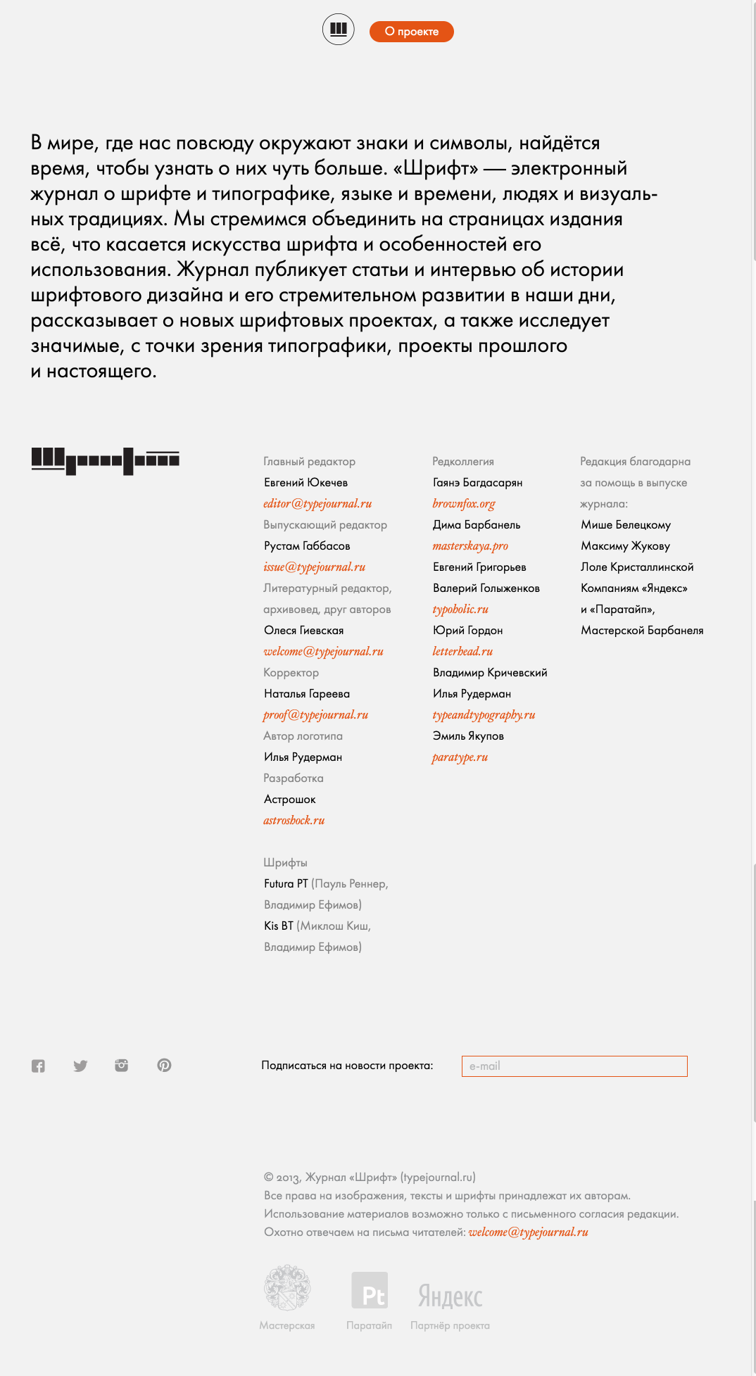 Шрифт (The Type) Contributed by Stephen Coles on Sep 16th, 2013. Artwork published in 2013. Source: typejournal.ru License: All Rights Reserved. Шрифт (Schrift — The Type) is an online journal devoted to type design and typography in the Russian-speaking world. The site uses Futura PT (with old style figures!) and Kis BT. Source: typejournal.ru License: All Rights Reserved. Source: typejournal.ru License: All Rights Reserved. Typefaces More about FuturaGet FuturaMore about KisGet Kis Formats Web (5682) Magazines/Periodicals (1849) Topics Graphic Design (3028) Designers/Agencies Masterskaya (1) Astroshok (1) Dima Barbanel (1) Ilya Ruderman (1) Tagged withabout type design (323)Cyrillic (script) (481)Russian (language) (284)about typography (114)about type design (323) Artwork location Russia (301) Moscow (198) In Sets Post a comment Name Email – will not be published Website Your response Submit Comment More Futura in use Joan Baez – Donna Donna album art2017unknownContributed by [deleted] Madeira guitarsc. 1975unknownContributed by Alex Stick The Brownstones, Chevy Chase Terrace2016Robert King DesignContributed by Robert King Sponsor More in Graphic Design Gotico-Antiqua, proto-roman, hybrid. 15th-century types between gothic and roman2021Jérôme KnebuschContributed by Jérôme Knebusch Staff Pick Toormix New Papers2009ToormixContributed by Florian Hardwig Alliance Graphique Internationale (AGI) Francec. 2015HelmoAtelier ter Bekke & BehageTeschner — SturacciContributed by Emilie Rigaud Paper and Ink by Isobel Chiang, Small Editions2024Isobel ChiangContributed by Small Editions Staff Pick More in Magazines/Periodicals “Shopping with the Nimoy’s”1968unknownContributed by Nick Sherman Lürzer’s Archive magazine redesign2022SixContributed by harrison marshall Fondata brand identity and first issuec. 2021Aboud+AboudAlan AboudHaley AustinContributed by F37® Archisearch the Paper Edition, Issue 022021Post-Spectacular OfficeContributed by Post Spectacular office Staff Pick More Fonts In Use Good Idea Slovakia2016Creative DepartmentContributed by Typotheque Staff Pick Comédias do Minho 20232023André Cruz StudioContributed by André Cruz Staff Pick Adoniran Barbosa – Onze album art2020Bloco GráficoContributed by Bloco Gráfico Staff Pick GAMA Edition by Odeonc. 1980Jiří RathouskýContributed by Briefcase Type Foundry Staff Pick