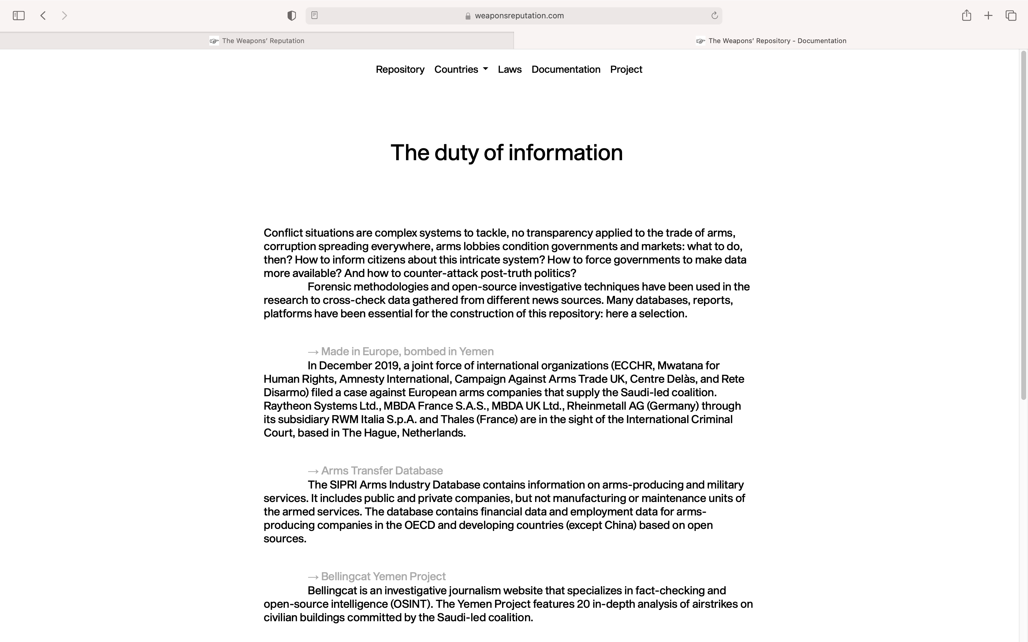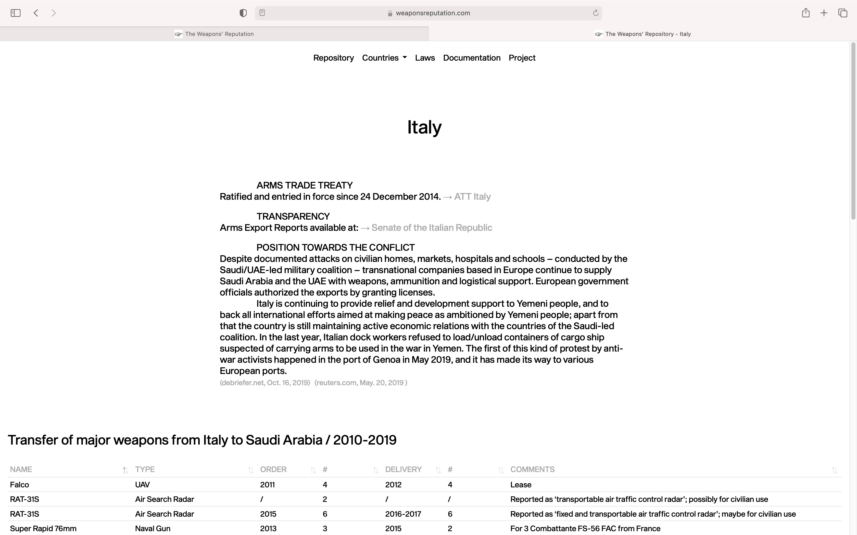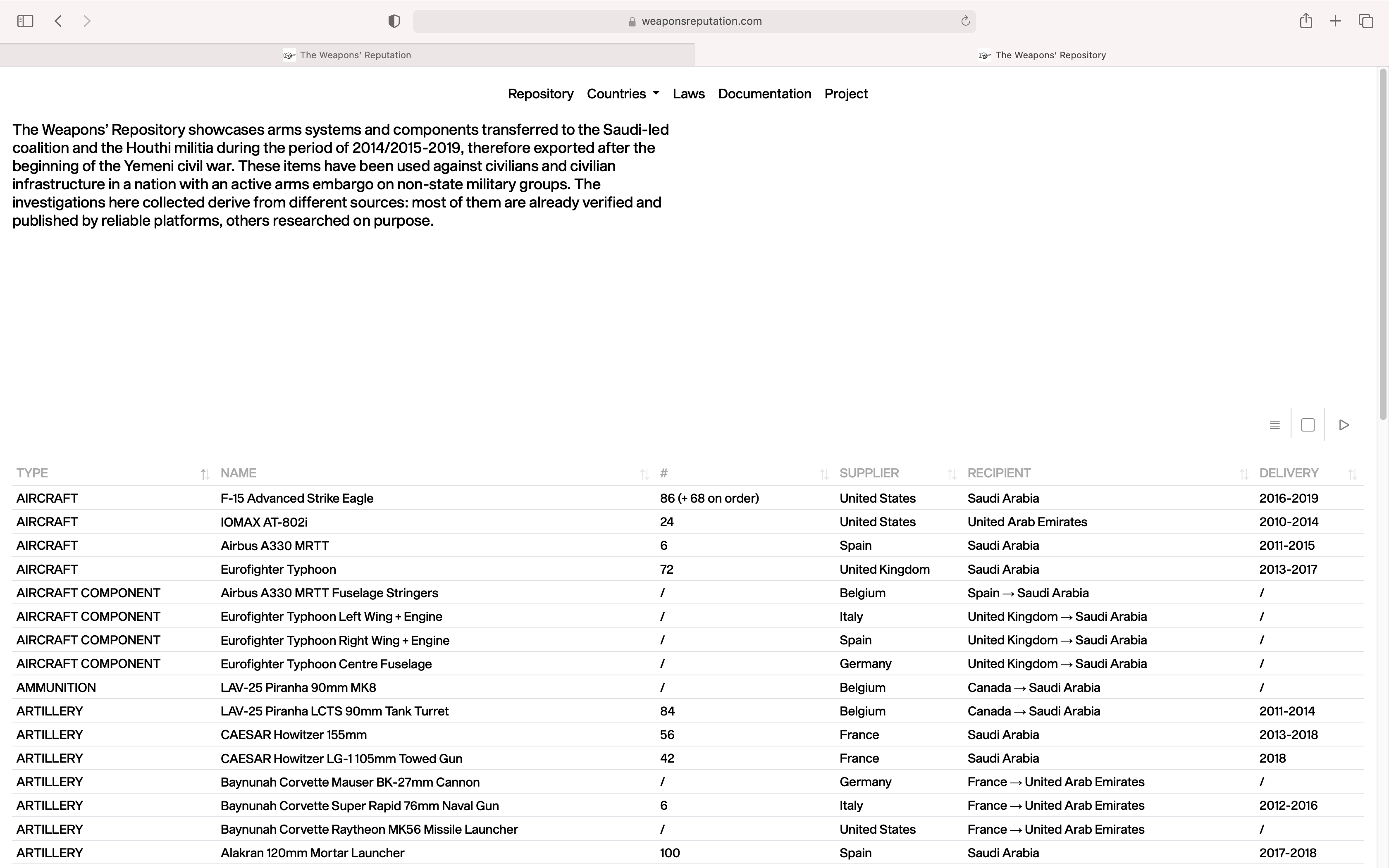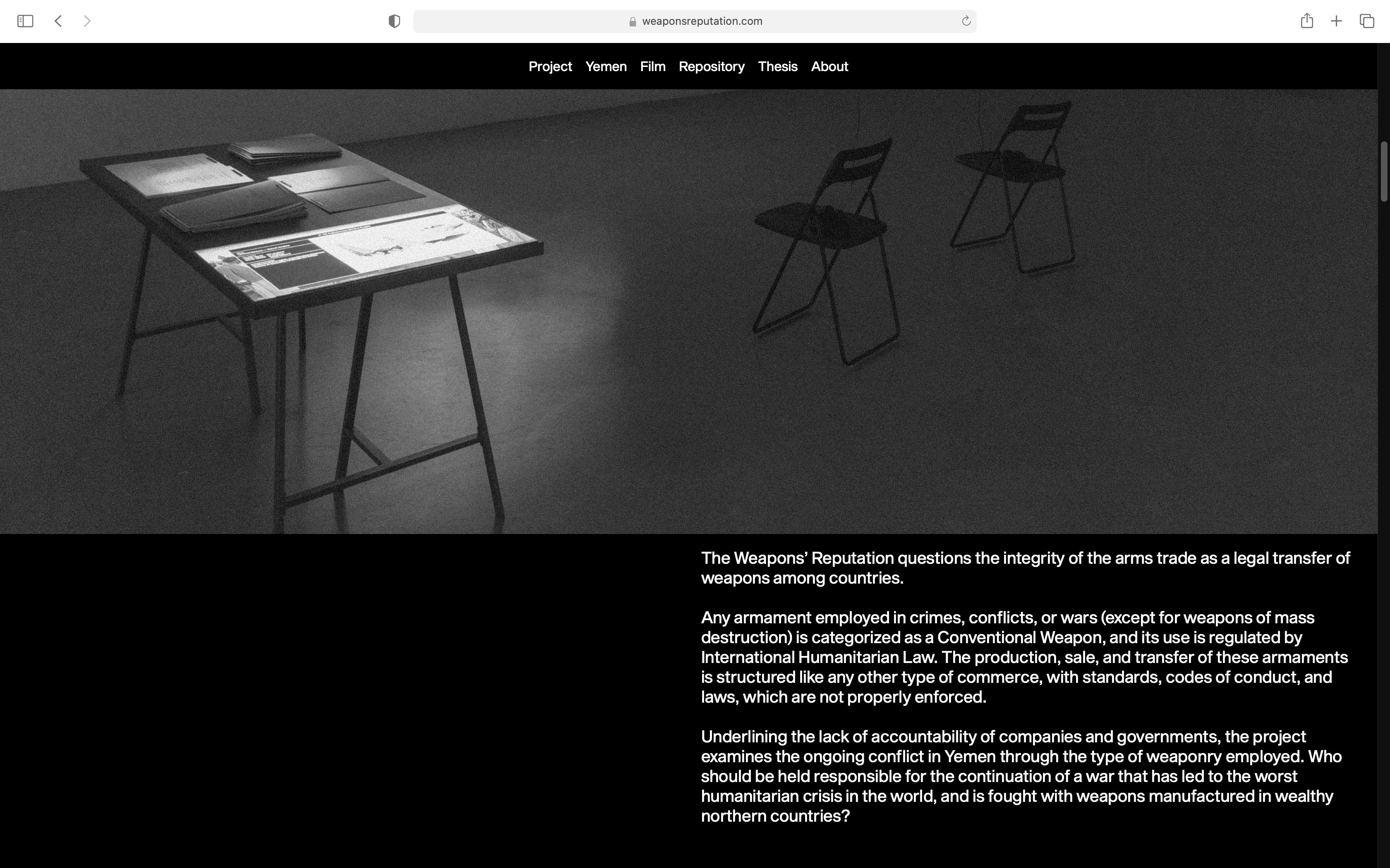 The project questions the integrity of the arms trade as legal commerce of tools of warfare. Every conventional weapon is produced and sold with a license; nonetheless, there is an enormous lack of responsibility among those who work in the defence industry. As a case study, the ongoing conflict in Yemen (2015-present) is examined through the type of weaponry employed. The research has been translated into a 17 minutes film, extended by a repository of weapons employed in the conflict. The repository is available online at weaponsreputation.com.