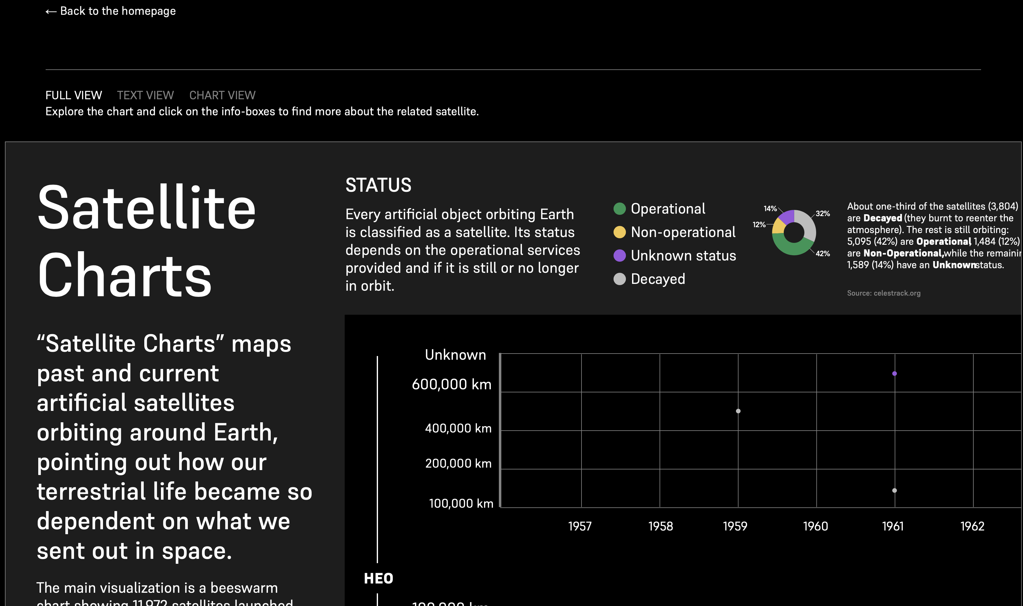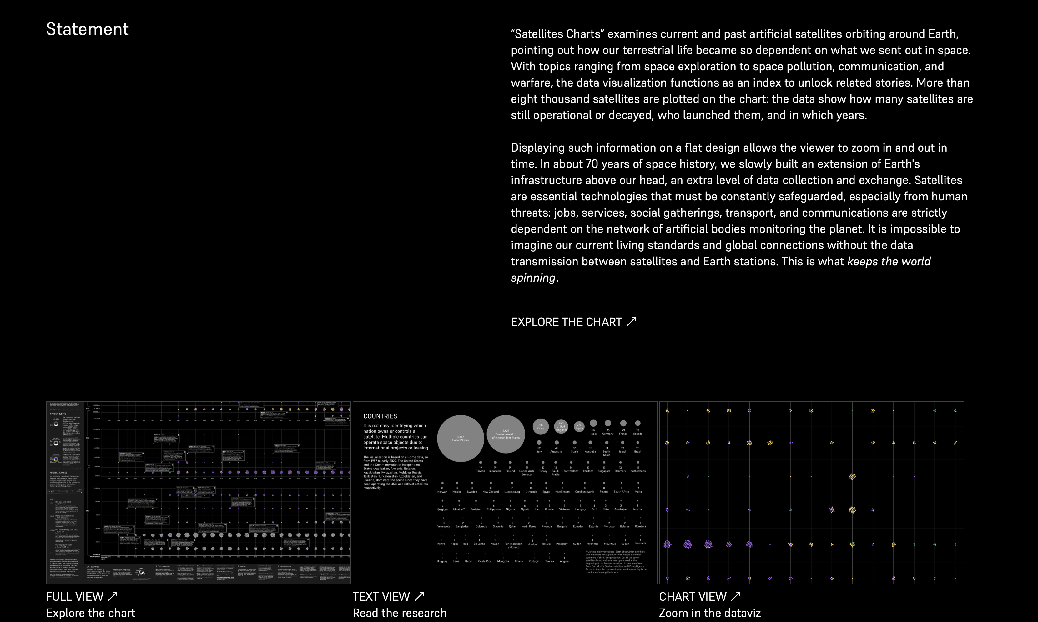 The website satellitecharts.xyz examines current and past artificial satellites orbiting around Earth, pointing out how our terrestrial life became so dependent on what we sent out in space. With topics ranging from space exploration to space pollution, communication, and warfare, the data visualization functions as an index to unlock related stories. More than eight thousand satellites are plotted on the chart: the data show how many satellites are still operational or decayed, who launched them, and in which years.