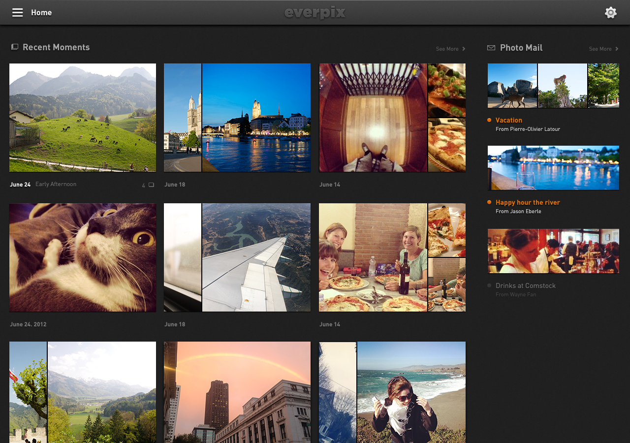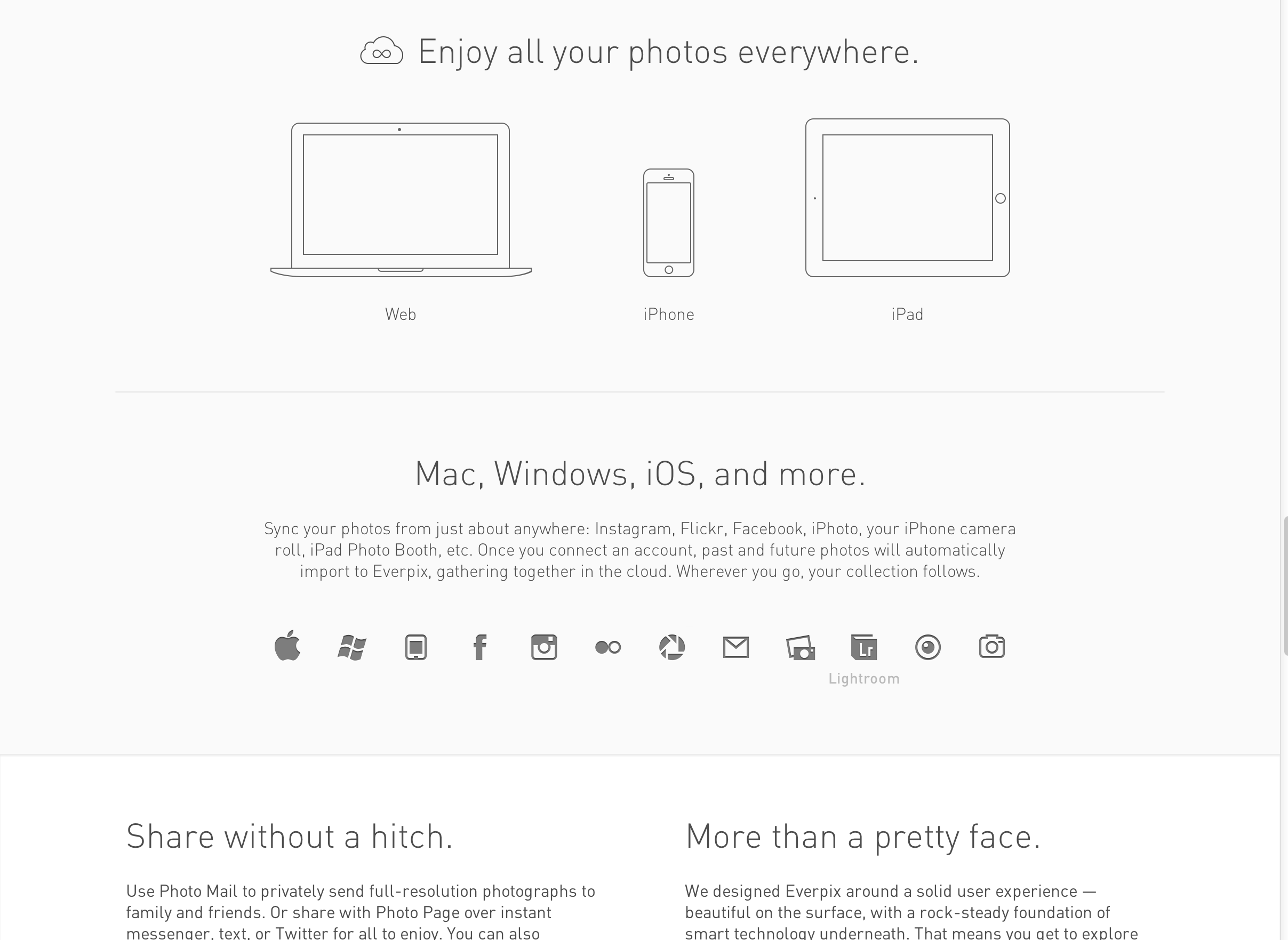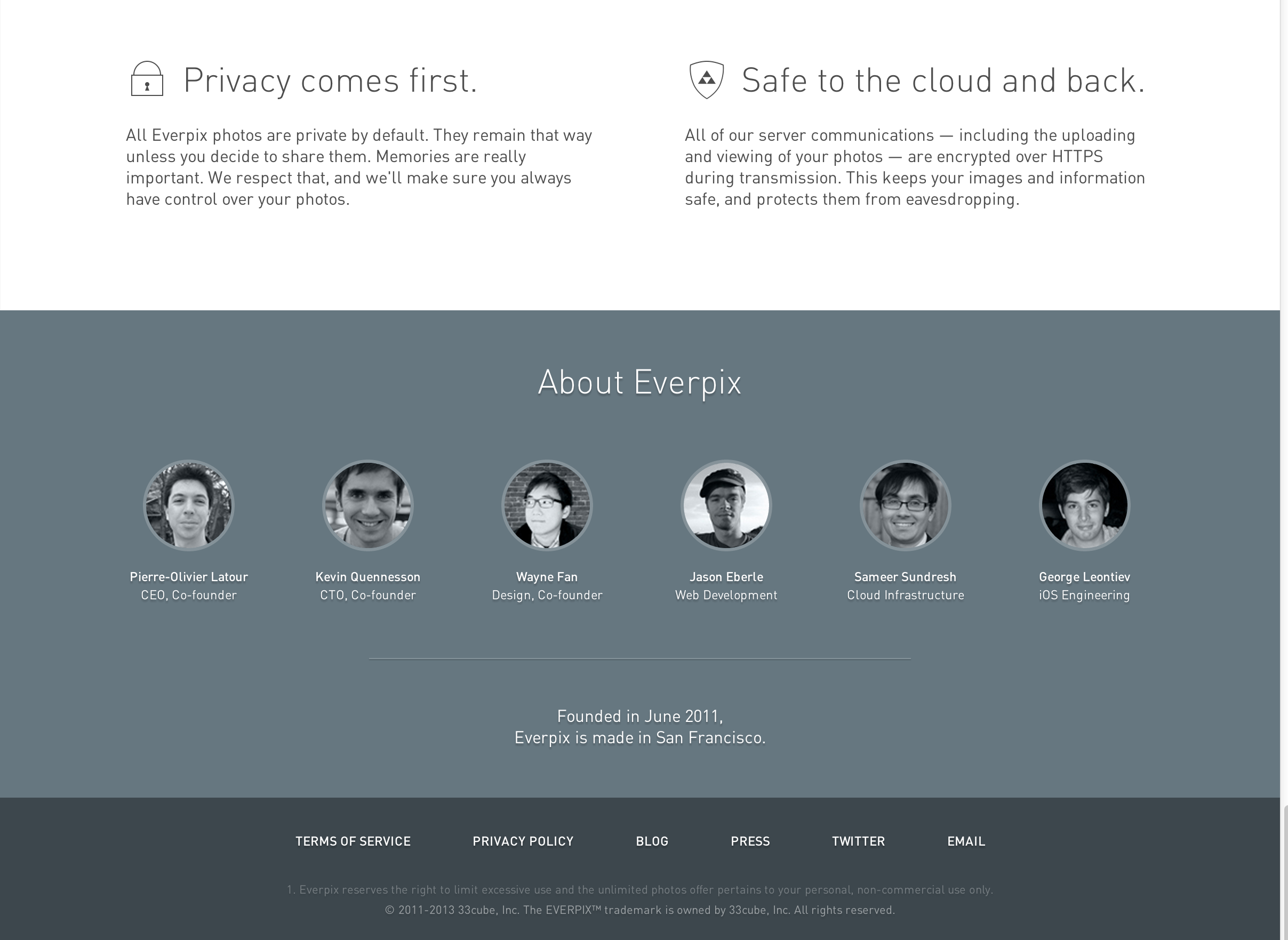 Everpix is an online photo storage service which employs FF DIN webfonts for its site and web app. The logo is set in Gotham Ultra with some modifications such as angled terminals on ‘p’ and ‘r’.