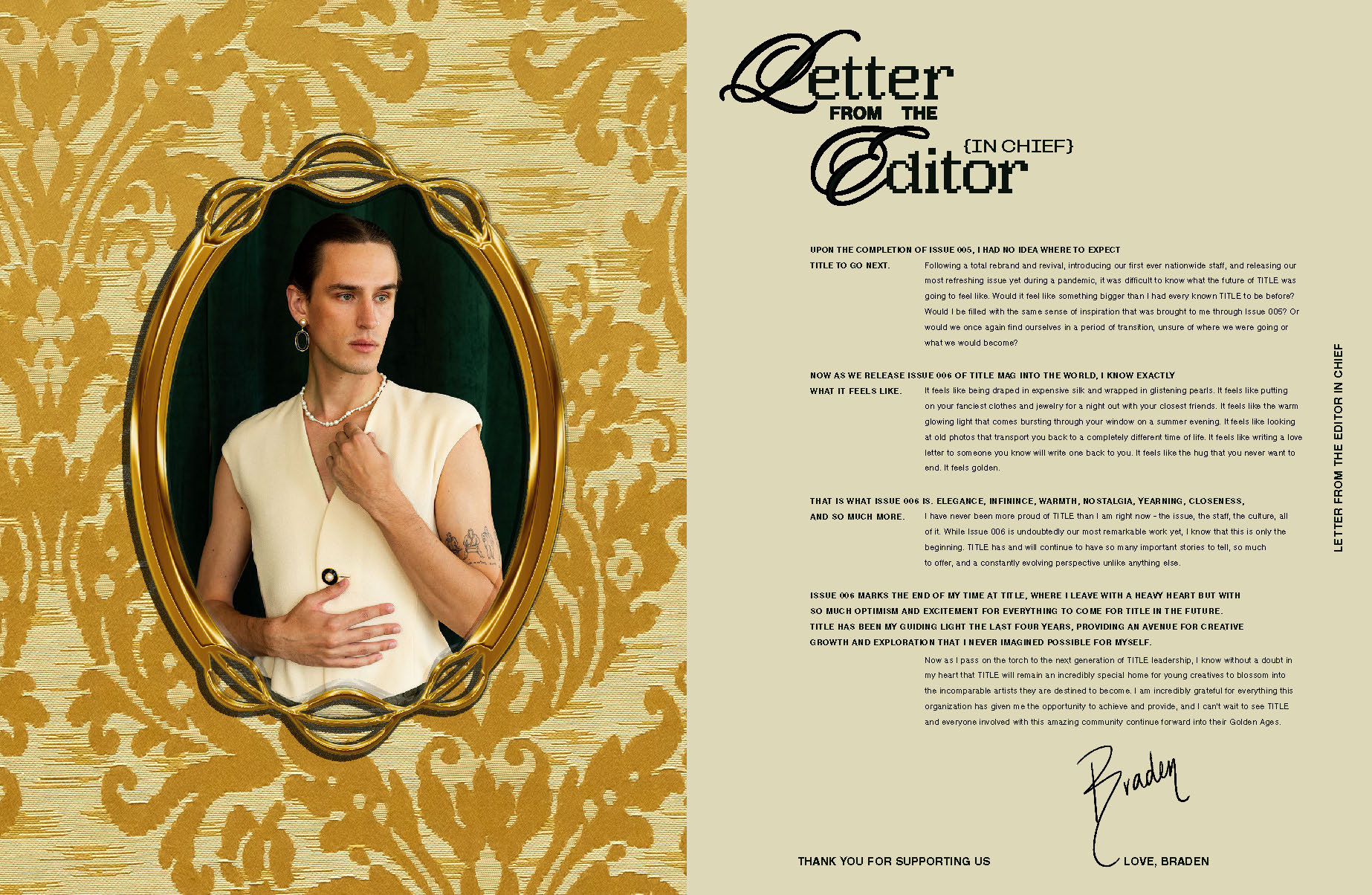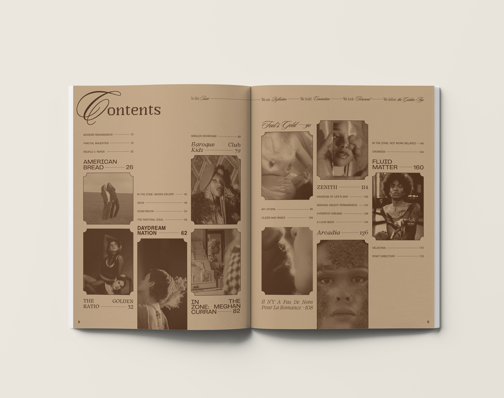 The theme for issue 006 is “Golden Age”. It was released March 26, 2022 out of Cincinnati, Ohio. Representing our interpretations of elegance, nostalgia, romance, and opulence, these pages are filled with expression from young creatives across the country. Our Editor in Chief said it best: