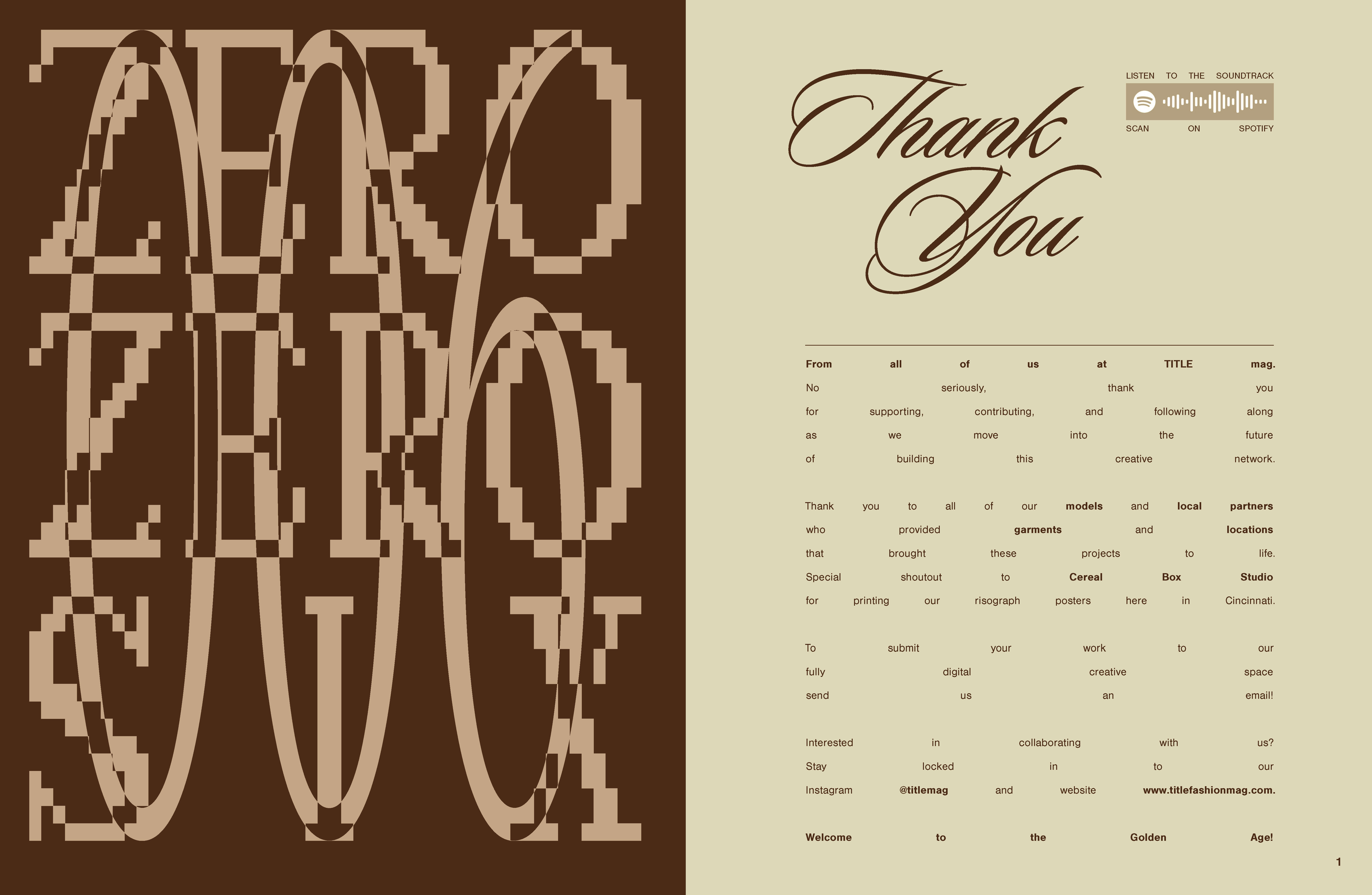This issue featured Sloop Script and Argent Pixel CF as the primary fonts for branded content and spreads. The other fonts highlighted in this post are part of the TITLE mag evergreen branding.