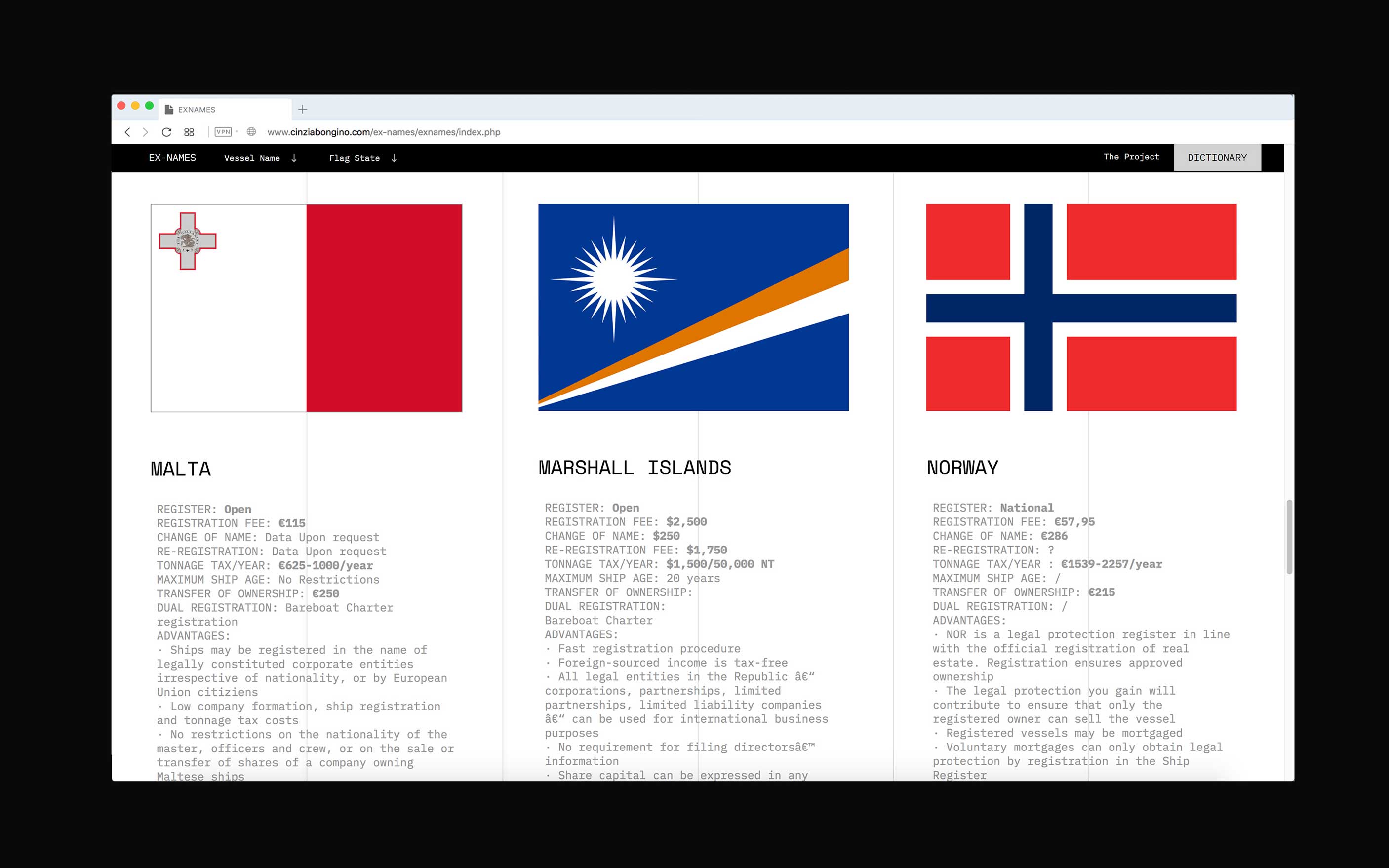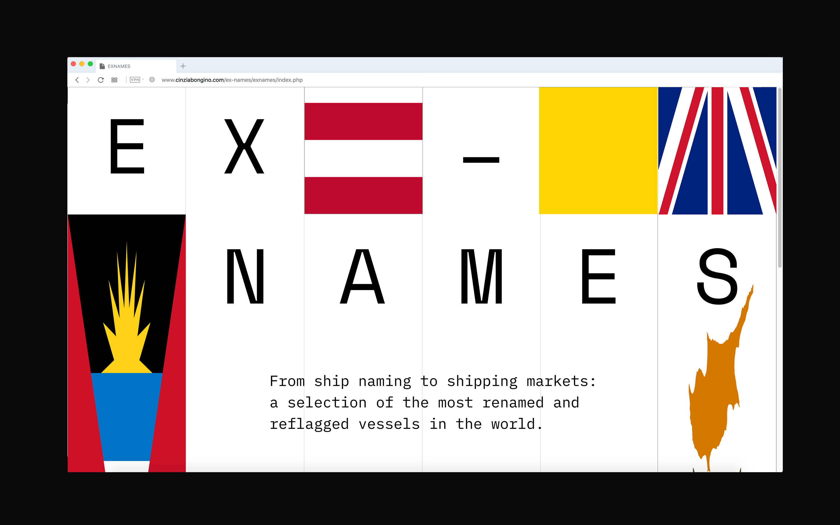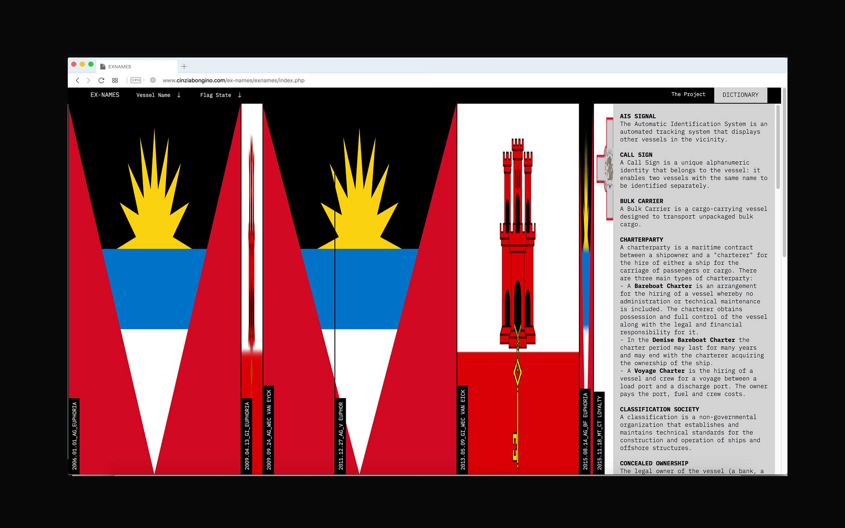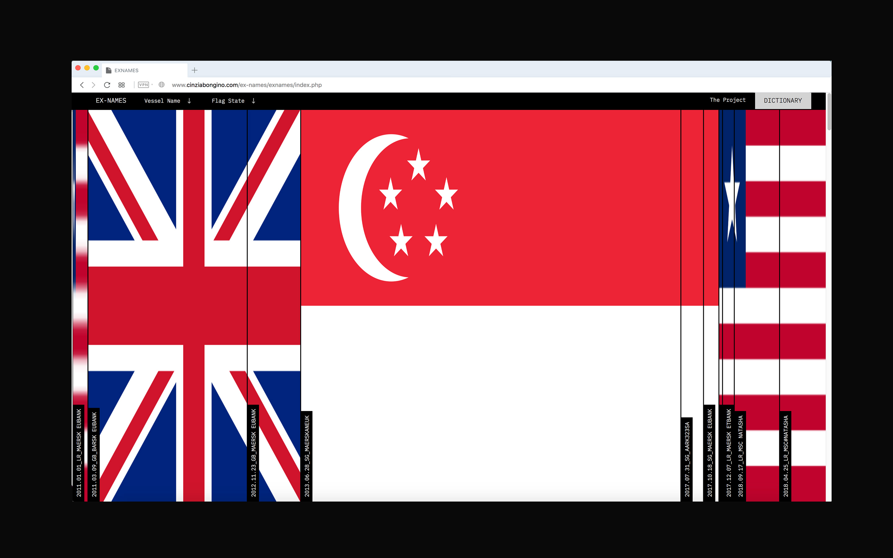 Creating a “flag of flags” is a way to reconstruct the identity of a ship. By putting together the change of register (flag state) and name (ownership), it is possible to visualize the number of owners and countries of registration of the vessel. The length of each flag represents the timespan the ship sailed under specific jurisdiction.