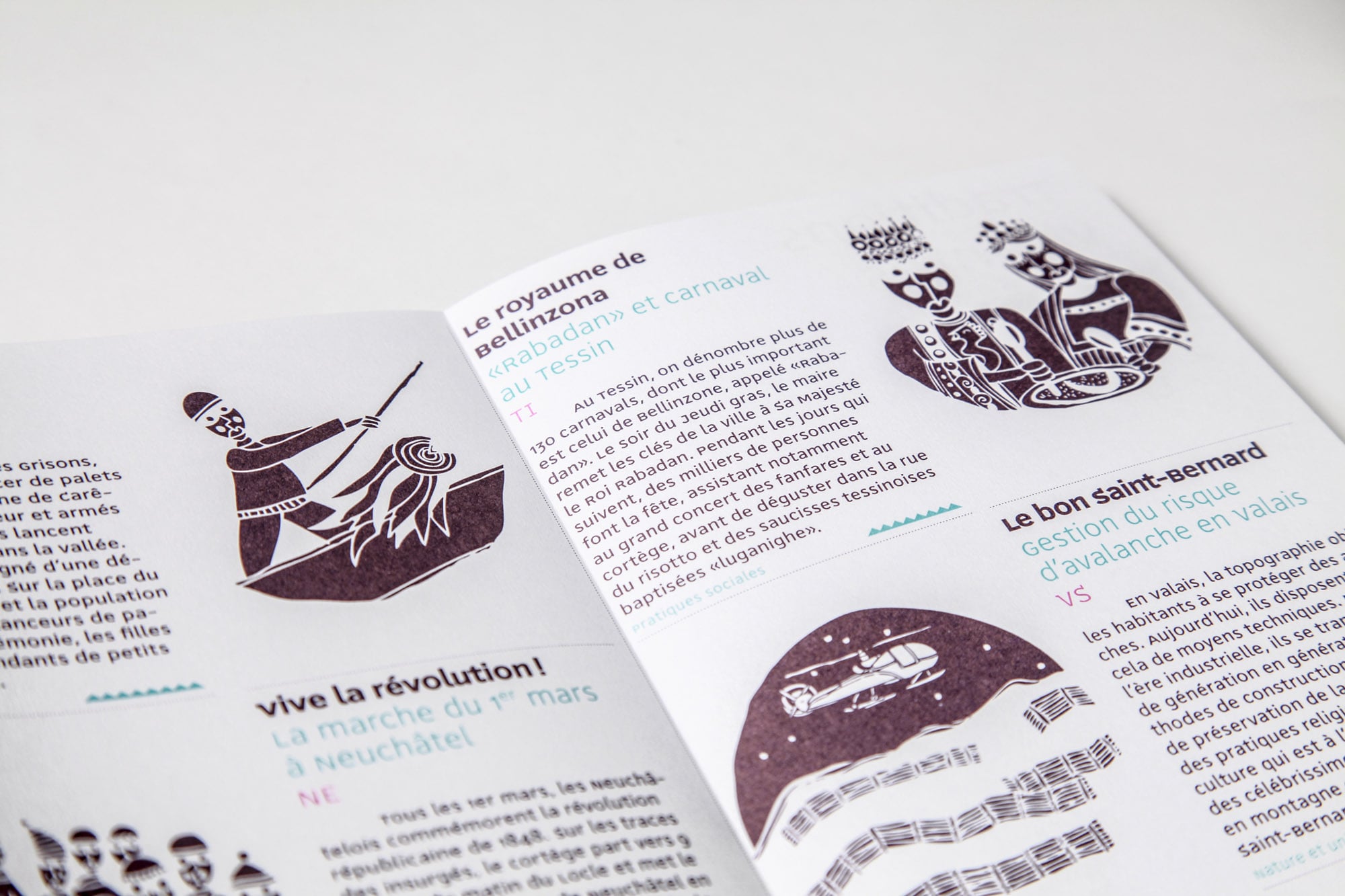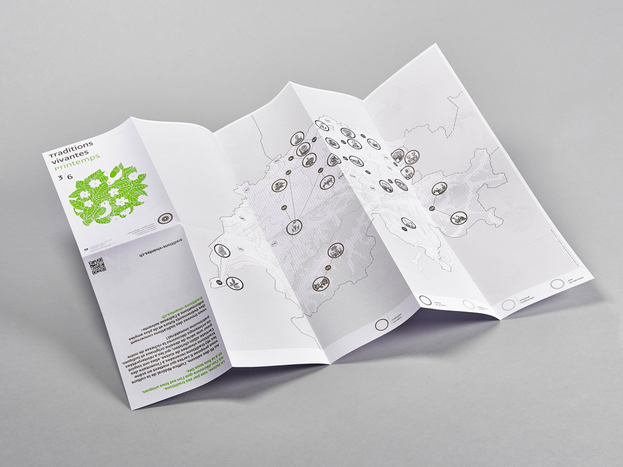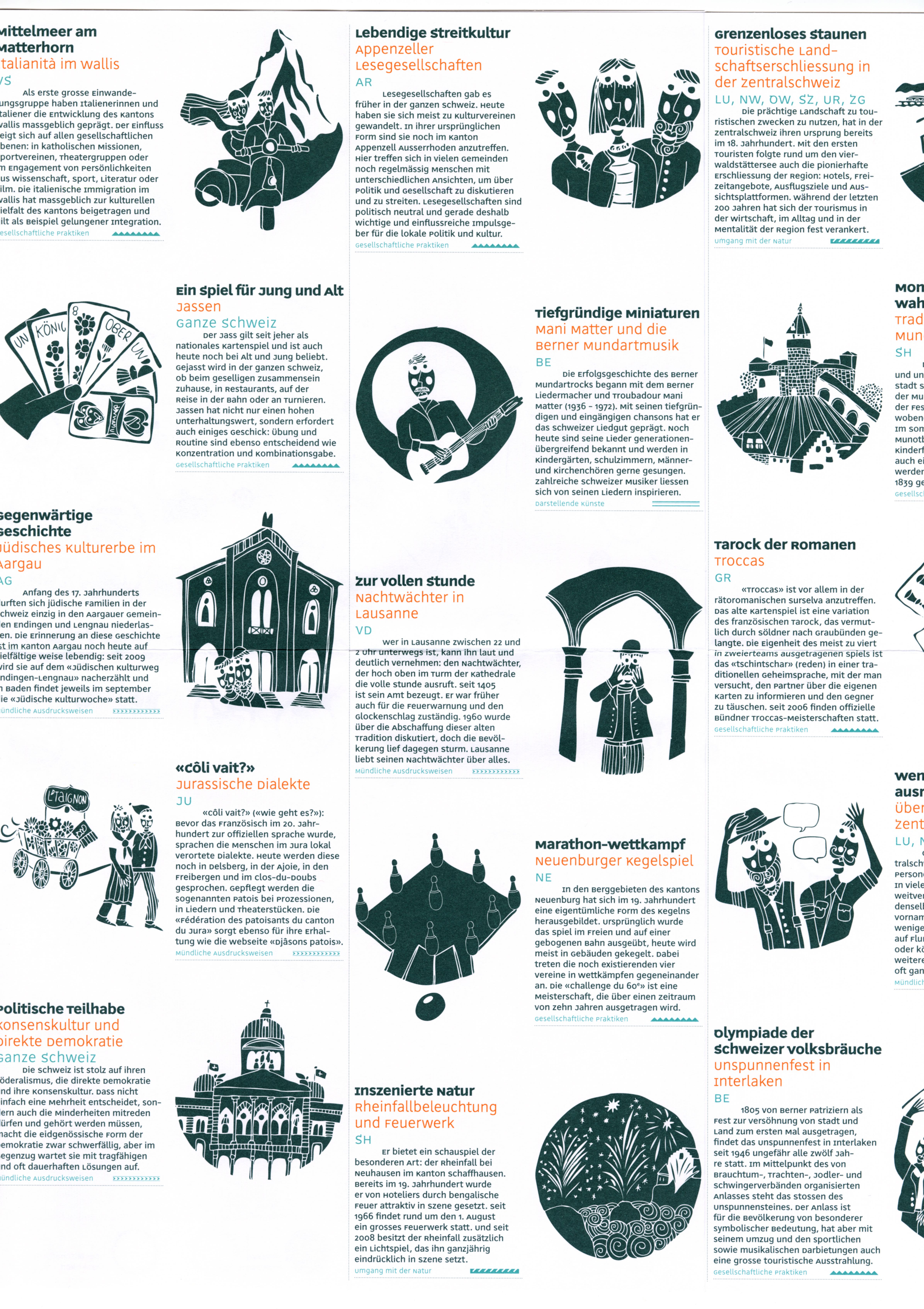 When Switzerland joined the UNESCO Convention for the Safeguarding of the Intangible Cultural Heritage, it committed itself to creating and maintaining a national inventory of this heritage. The Swiss Federal Office of Culture therefore invited Trivial Mass to create six maps (spring, autumn, winter, summer, community life, crafts and entertainment) featuring the 167 traditions listed in the inventory of living traditions in Switzerland. The artist Albin Christen has reinterpreted them in a series of original and playful drawings.