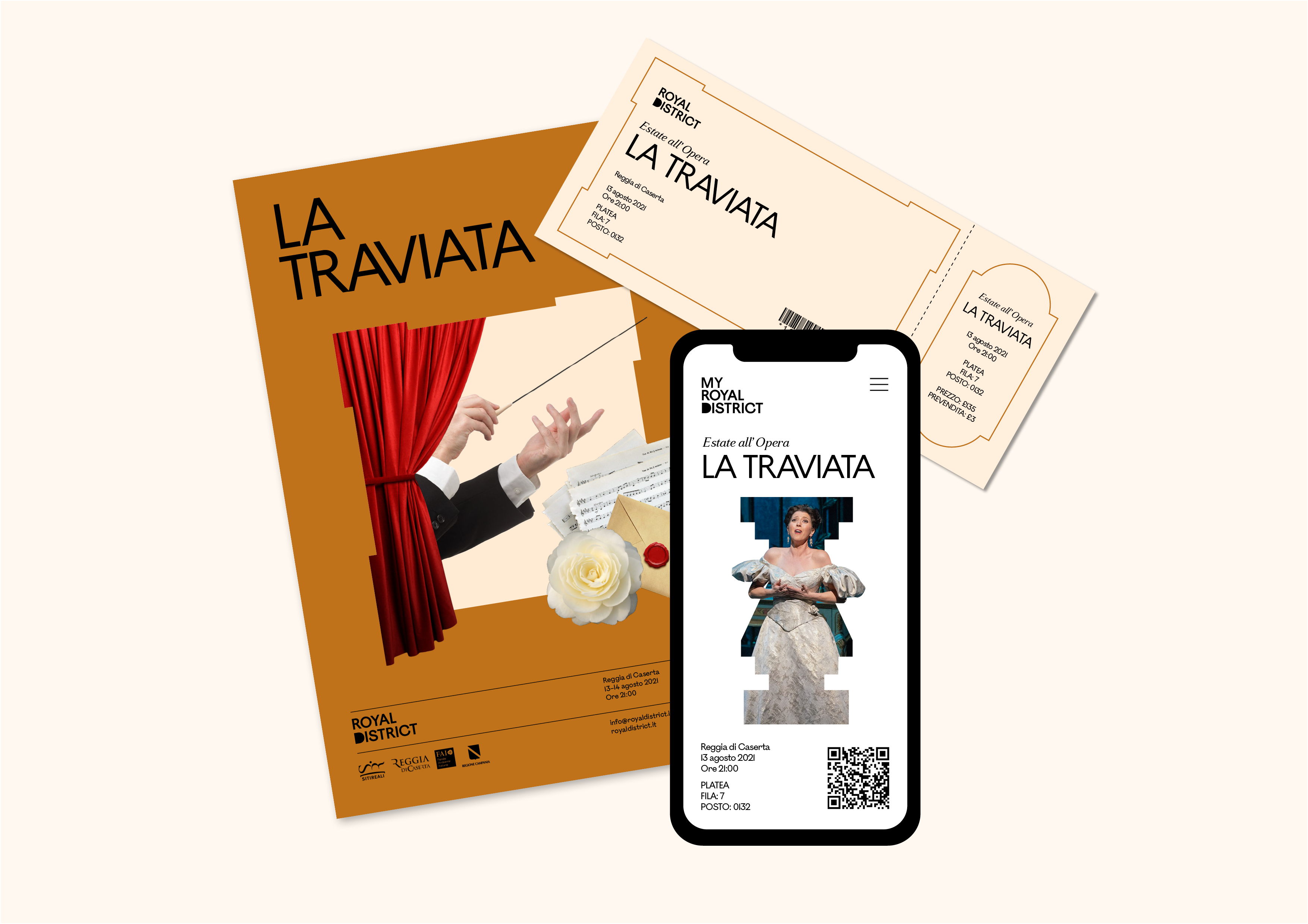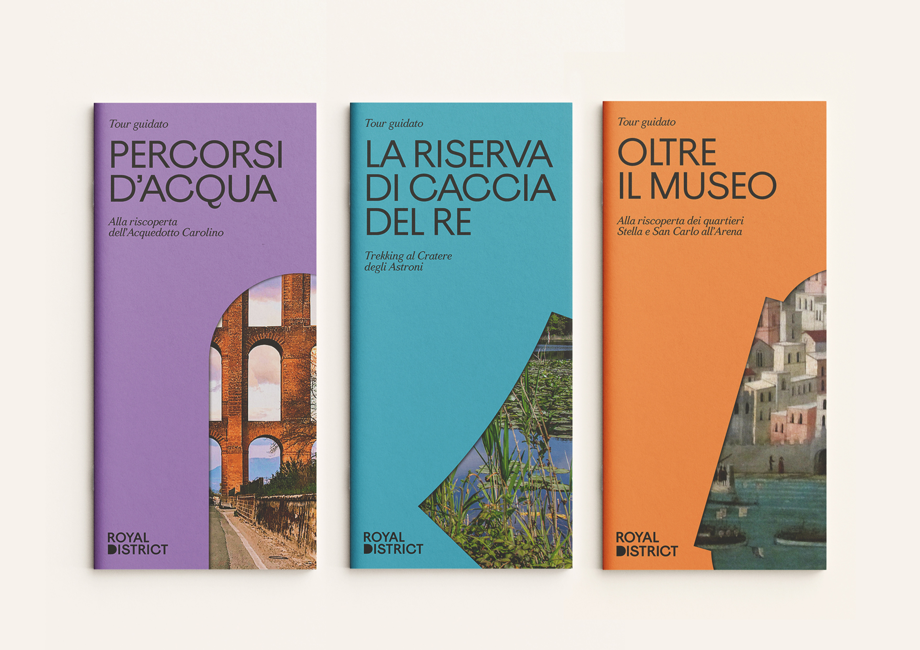 Naming and brand identity for Royal District, an initiative aimed at promoting the heritage of the Bourbon Dynasty in Southern Italy to younger audiences and visiting foreigners through activities and services highlighting the cultural and historical link between existing sites and institutions. Winning project of the branding contest organised by AIAP and Siti Reali.