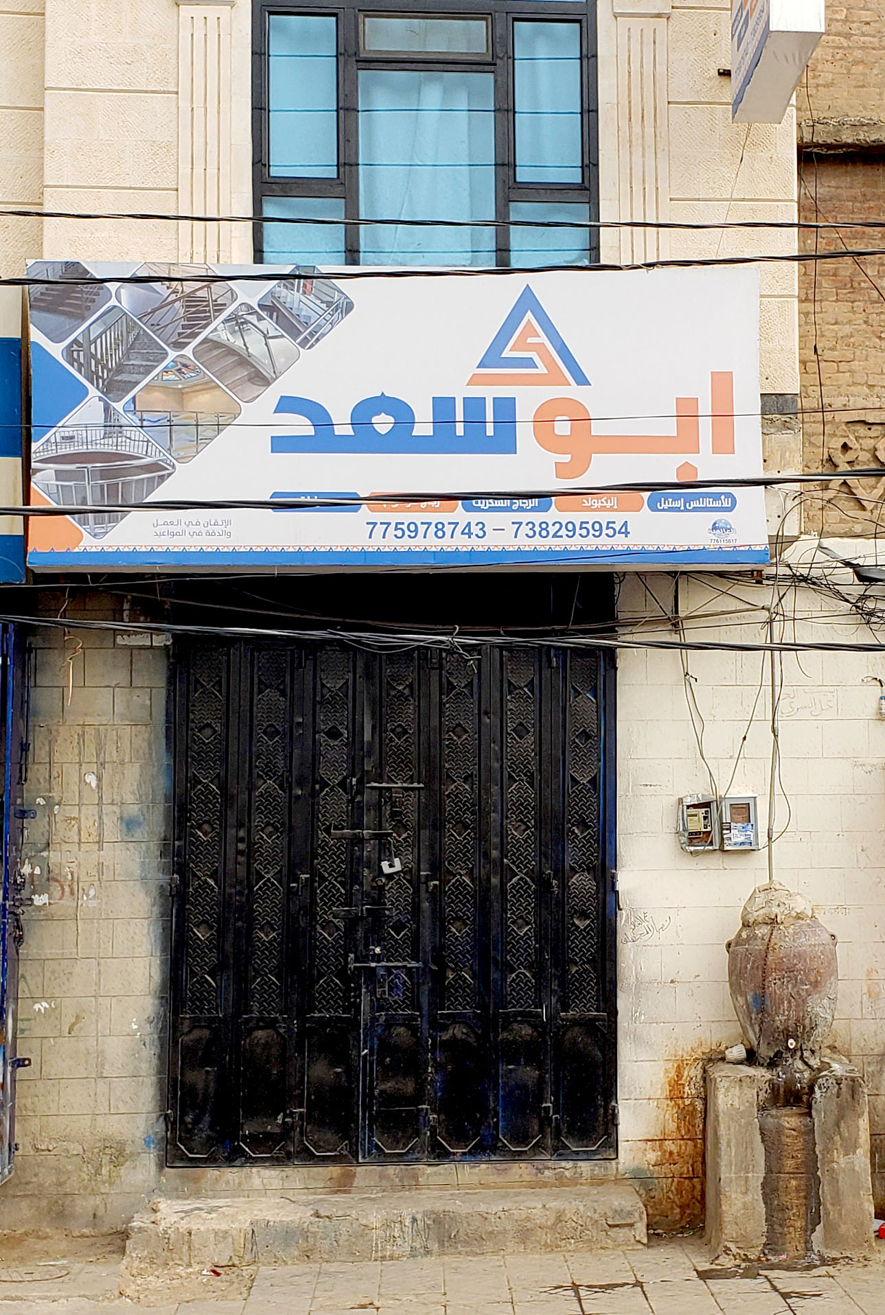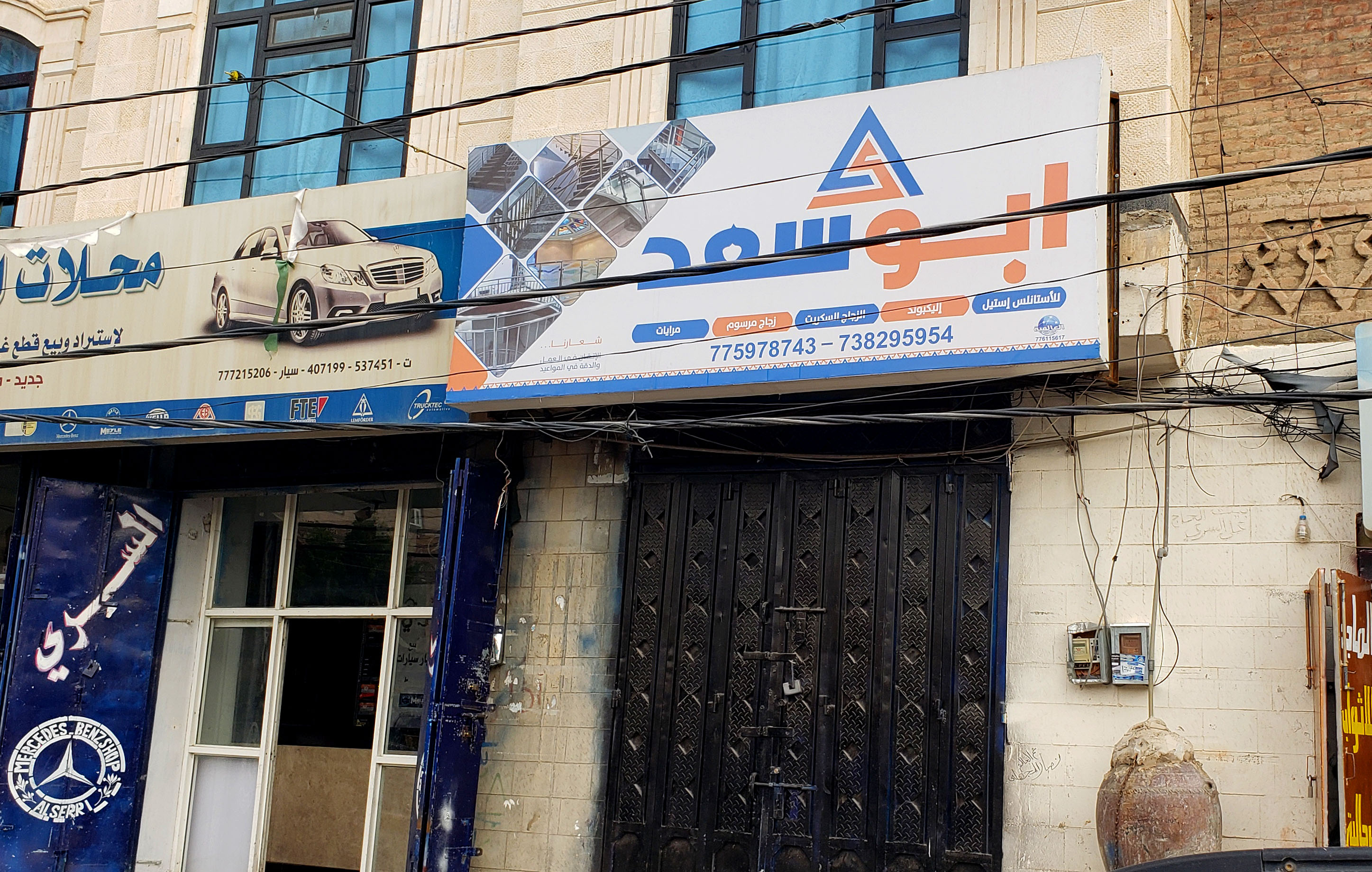 This board is designed using Nasser. Reading “Abu Saad”, it advertises a showroom for selling materials such as stainless steel, alucobond, mirrors, and colored glass. The phone numbers are set in Arial. The board was designed by the Al-Alamiyah firm.