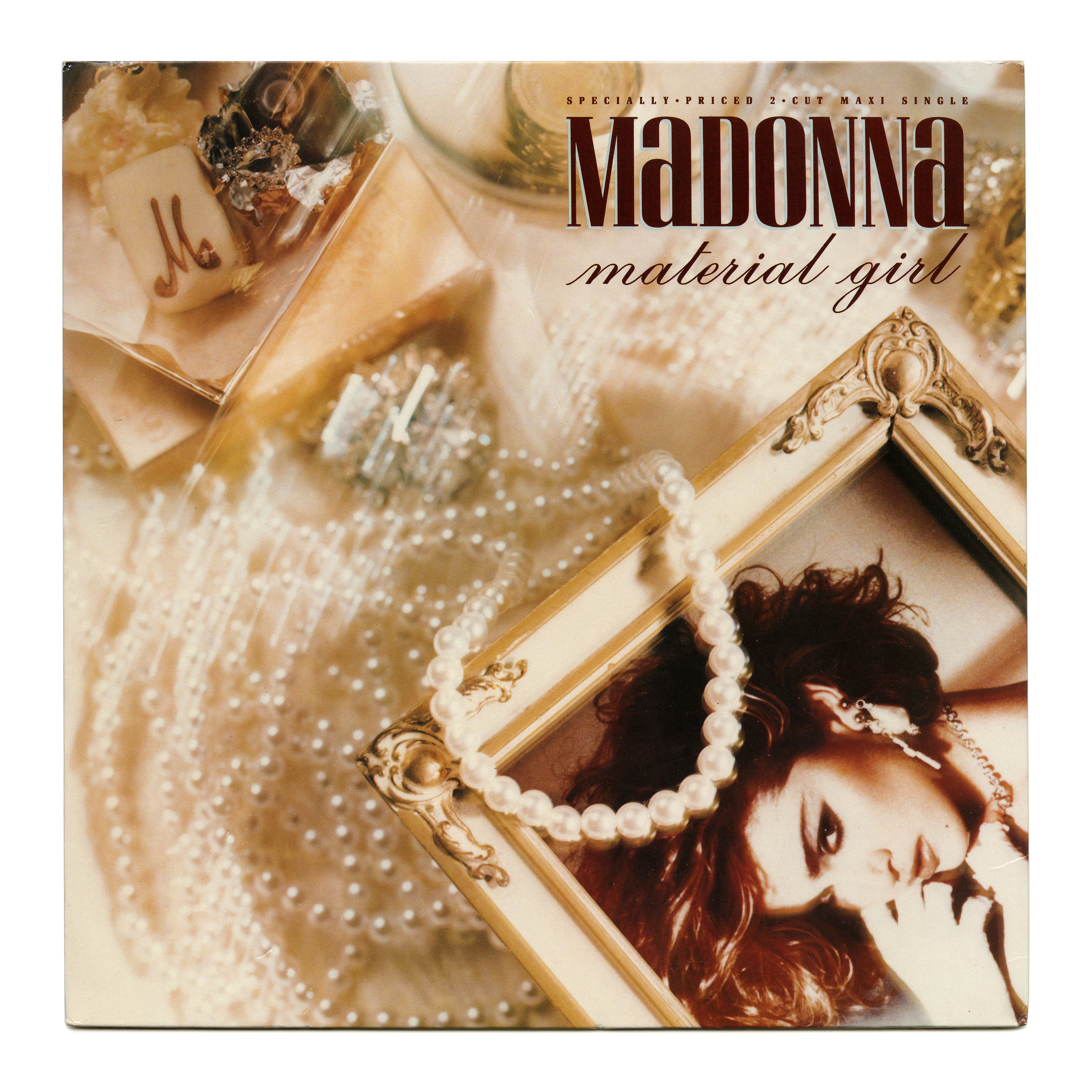 Cover art for “Material Girl”, released on January 23, 1985, as the second single from Madonna’s second album Like a Virgin. The sleeve was designed by Jeri Heiden (then known as Jeri McManus), who also takes credit for the album cover, see this previous post.