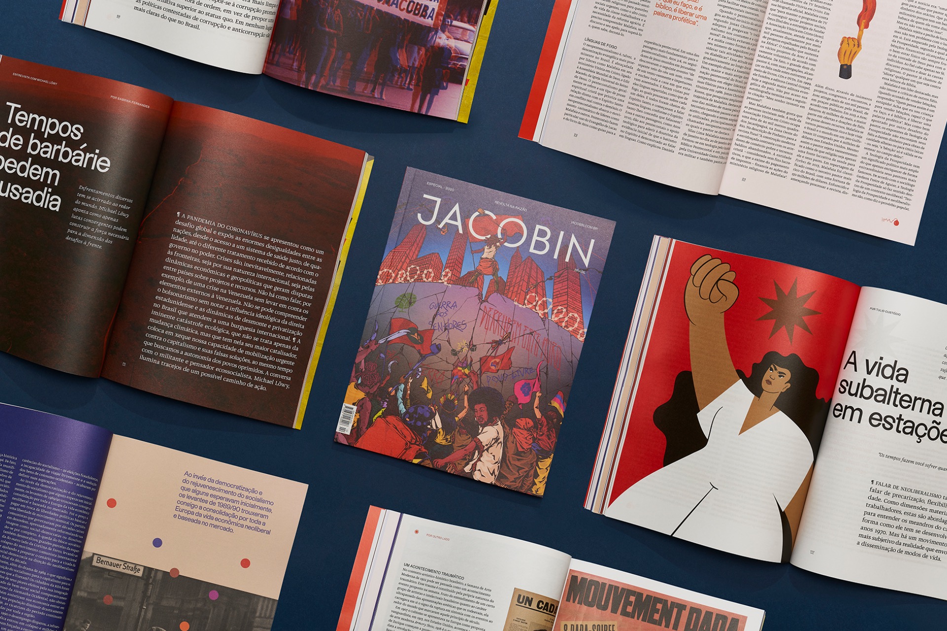 São Paulo based alles blau studio designed all three of the Brazilian editions of Jacobin magazine, a left-wing periodical offering a socialist perspective on a variety of themes. Jacobin was started in the U.S. in 2010, and the Brazilian version was founded in 2019 releasing once a year.