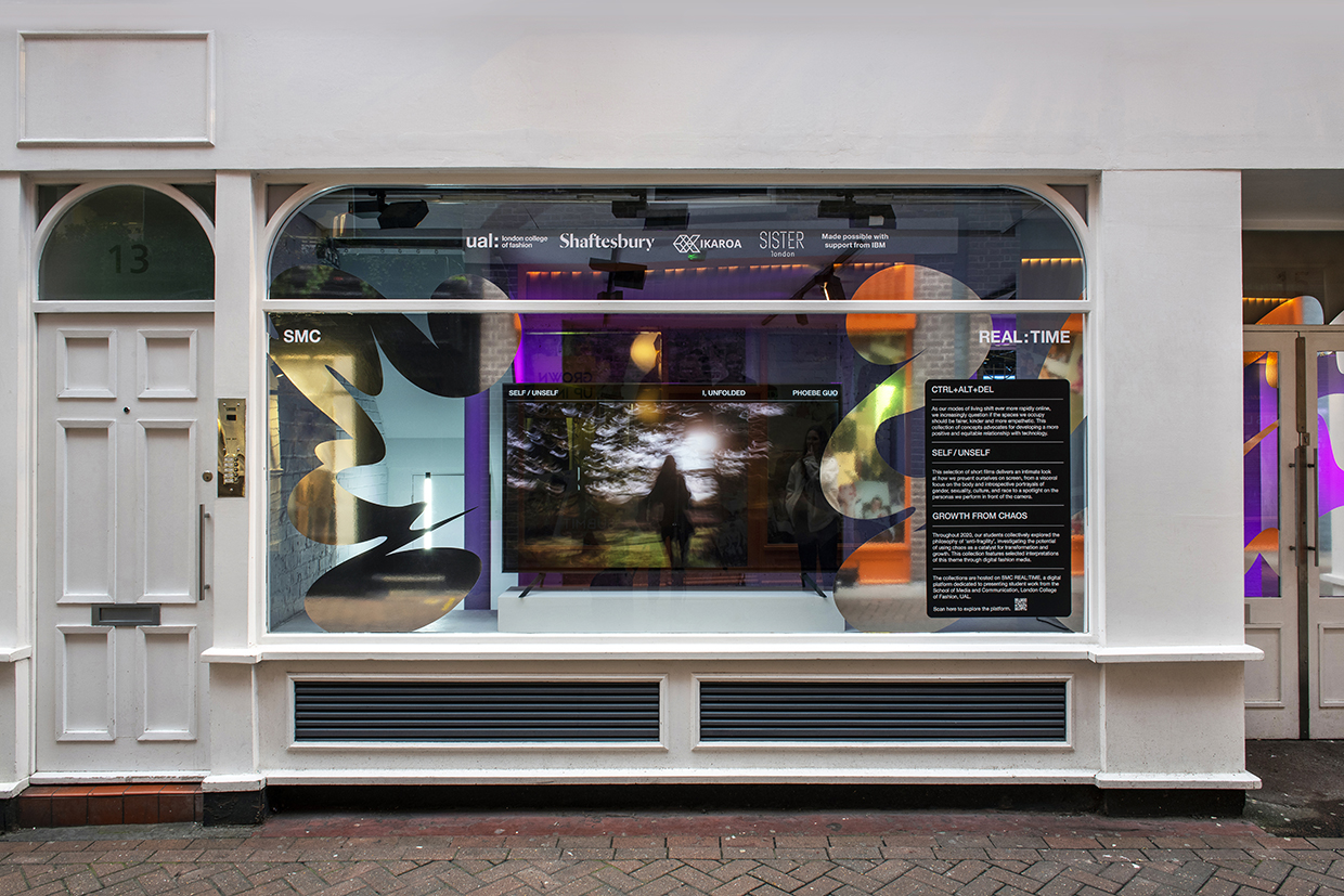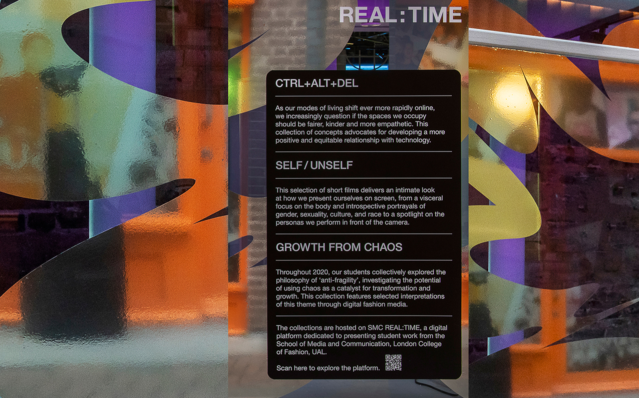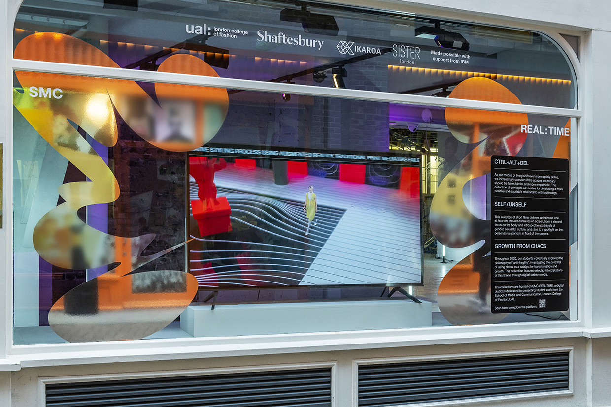 Somewhere in the middle of Christmas, New Year and Lockdown, the brilliant Andrew Meredith miraculously managed to document the SMC REAL:TIME exhibition designed for the London College of Fashion showcasing work of students from the School of Media and Communication. Due to ongoing restrictions we created an installation in the windows of an empty shop on Carnaby Street, for people to view from the street. With prevalent themes of identity and the body it was the perfect opportunity to use Haocheng Zhang’s Experimental Body Type.