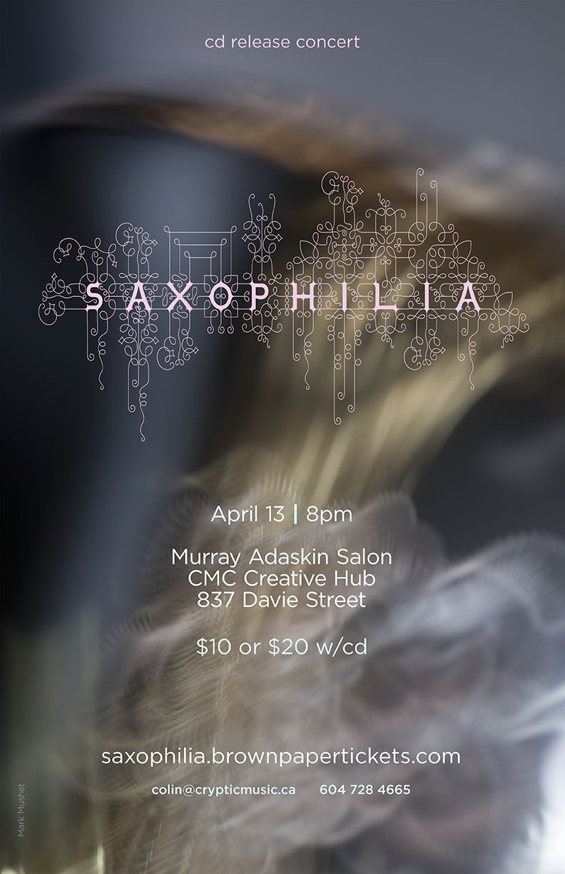 This is a favourite project for a Vancouver new music saxophone quartet lead by Colin MacDonald. It is a CD release poster for his group Saxophilia, a name which fairly demanded the immediate use of Marian Bantjes’ and Ross Mills’ ornate and sensual Restraint! The always reliable and cleanly elegant Gotham was used to counter it.
