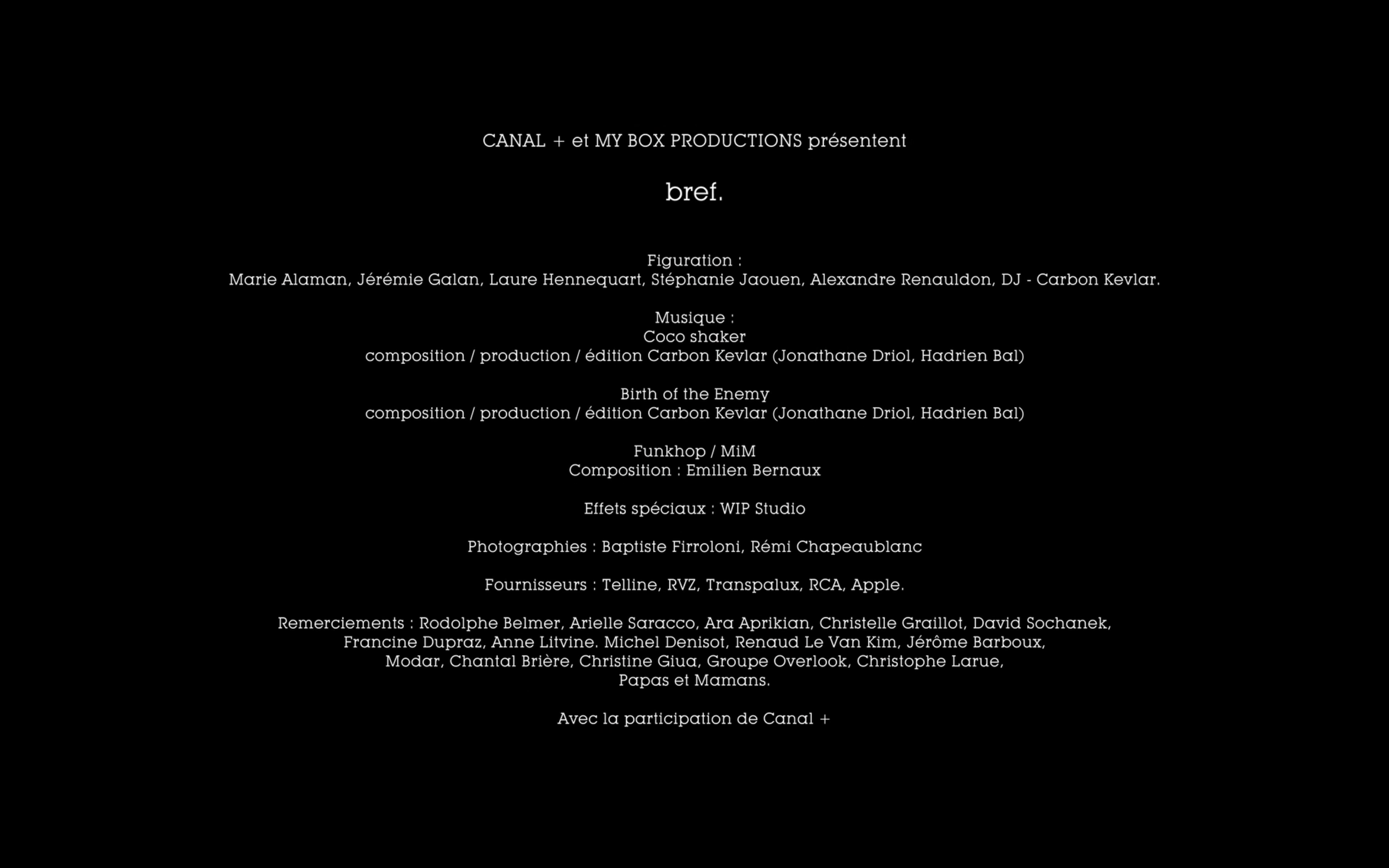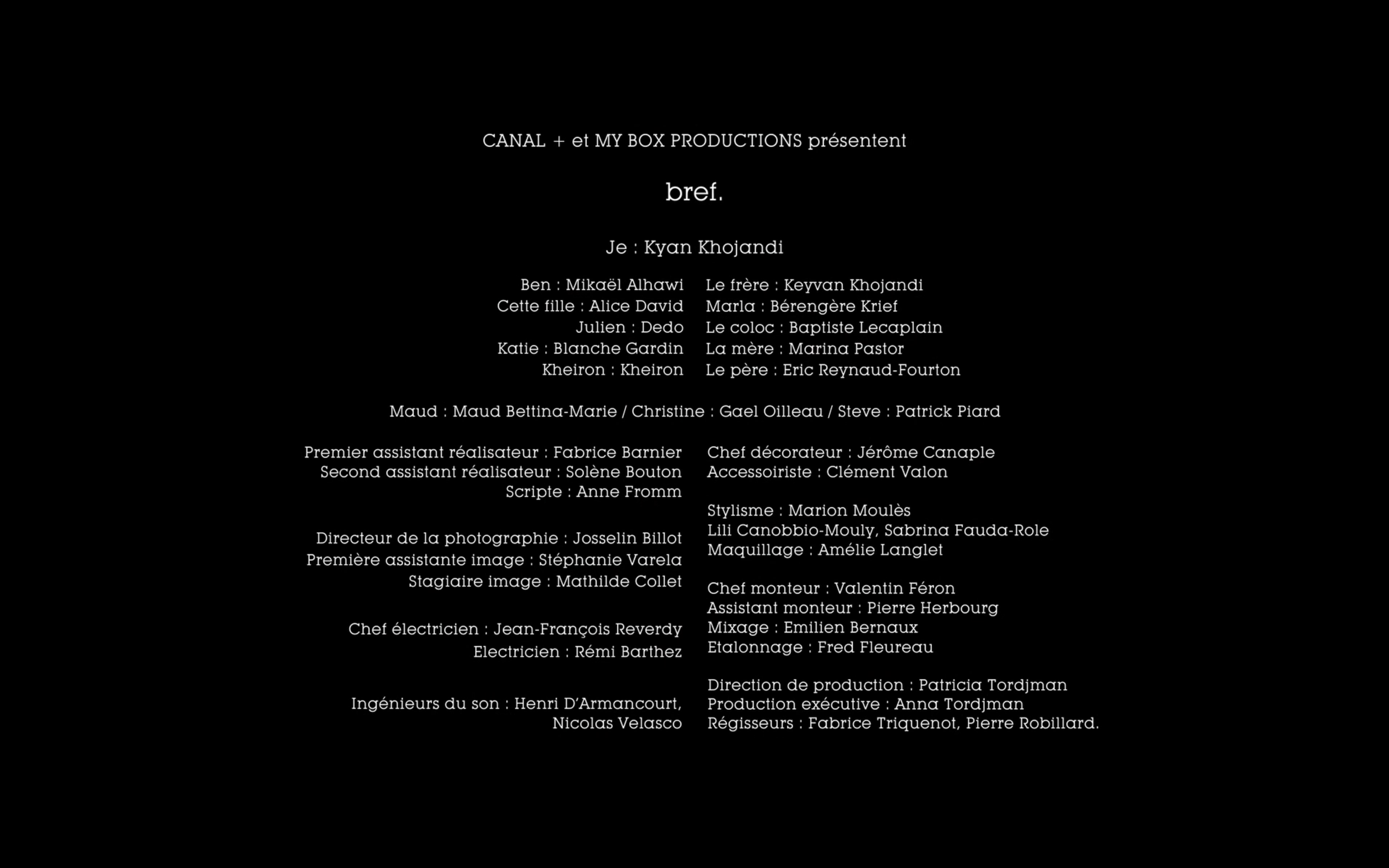 Bref (in English: “in short”, stylized Bref. with a period) is a French TV series of 82 episodes created by Kyan Khojandhi and Bruno Muschio broadcast on Canal+ in 2011 and 2012.