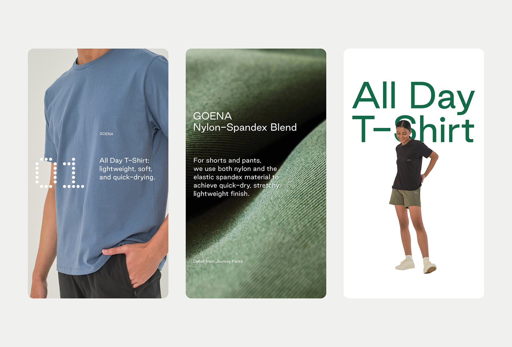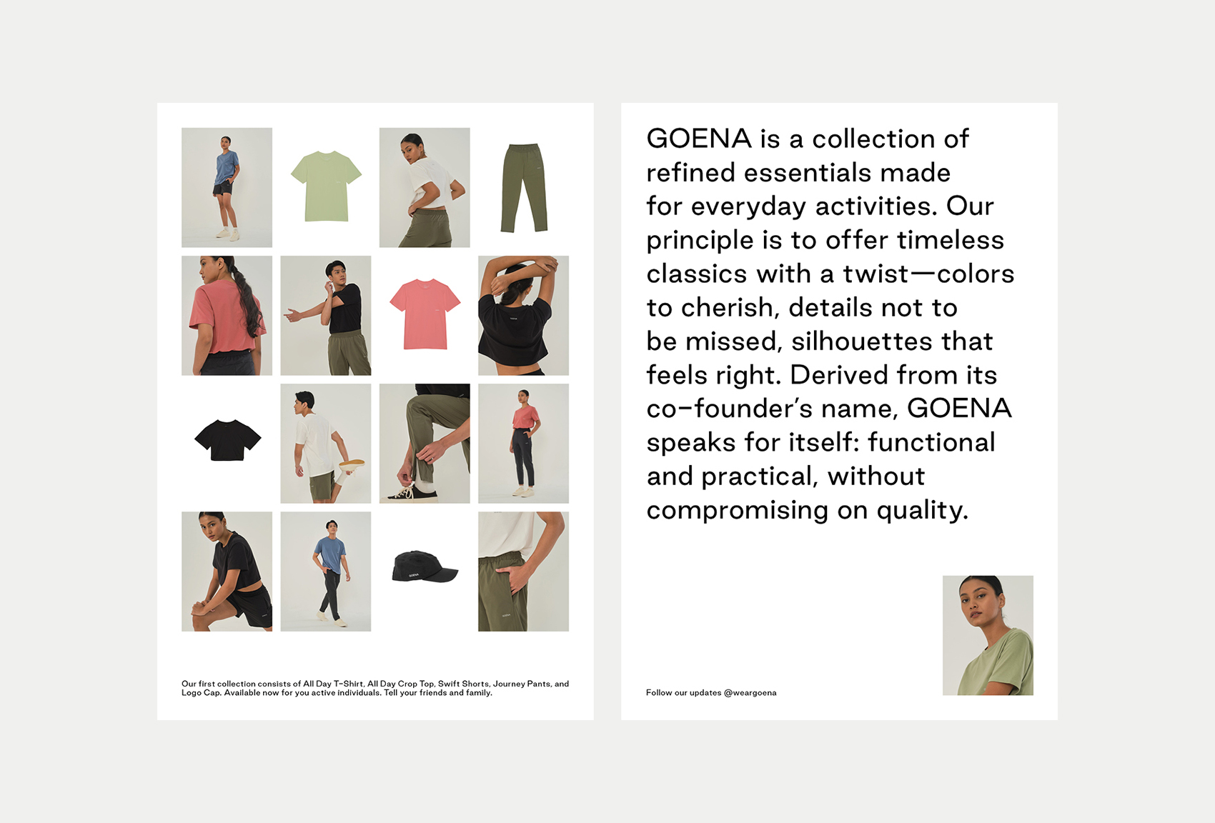 Goena is a collection of refined essentials made for everyday activities. With its minimal personality, the athleisure brand conveys the balancing act between form and function.