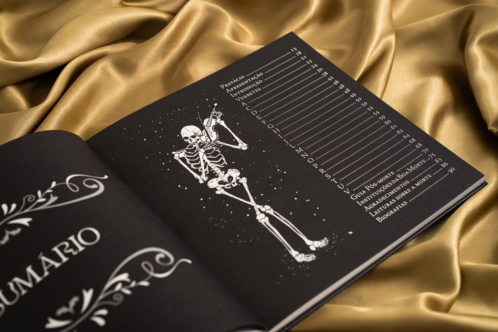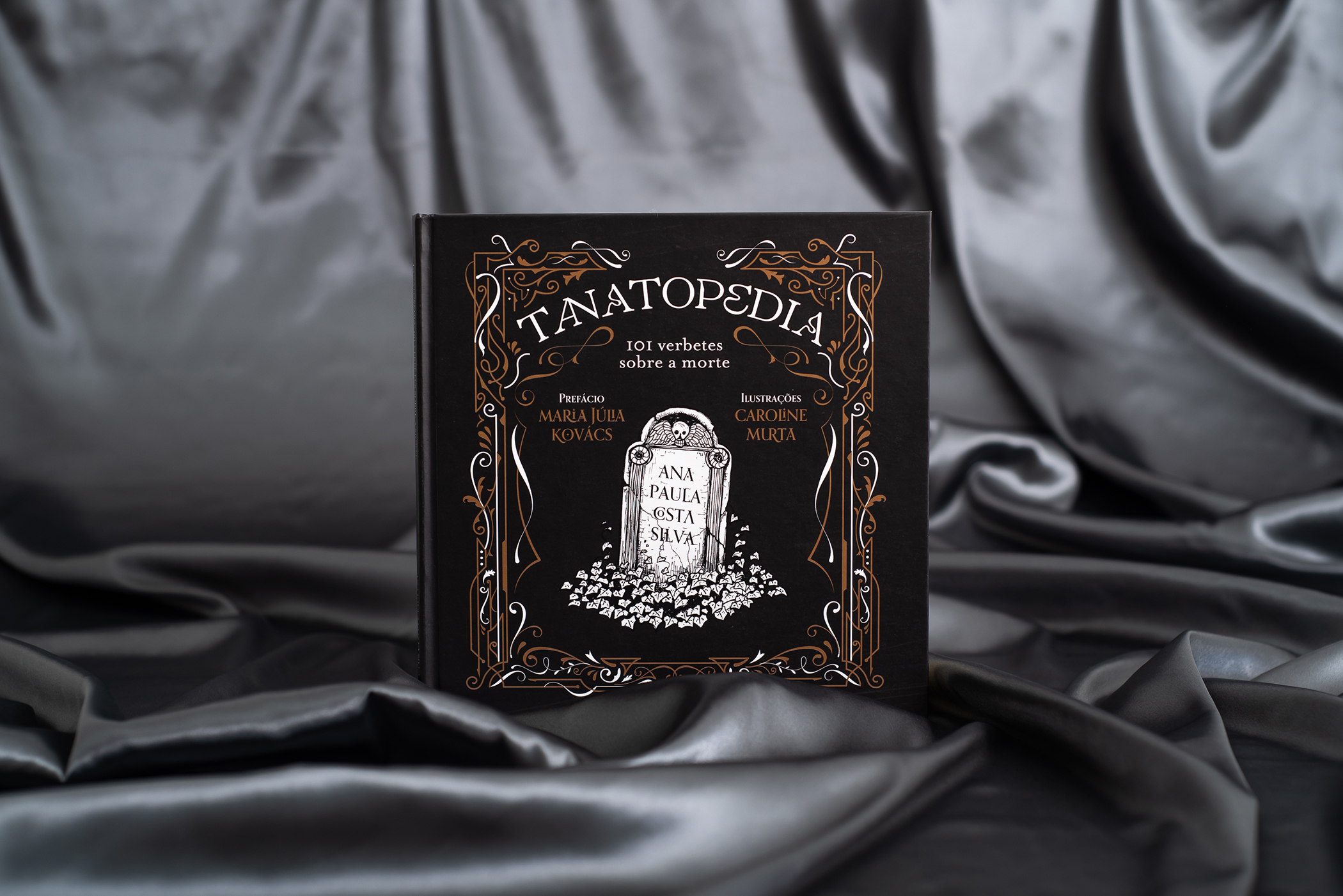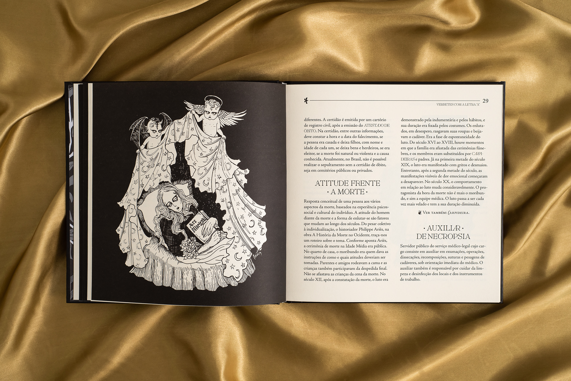Tanatopedia is an encyclopedia with entries on death, with illustrations by Caroline Murta. The crowdfunded project was designed to make the book sumptuous, a physical object that does not go unnoticed due to its size or theme. Sober, elegant and dark – words that define the aesthetic used for the design of the cover and inside.