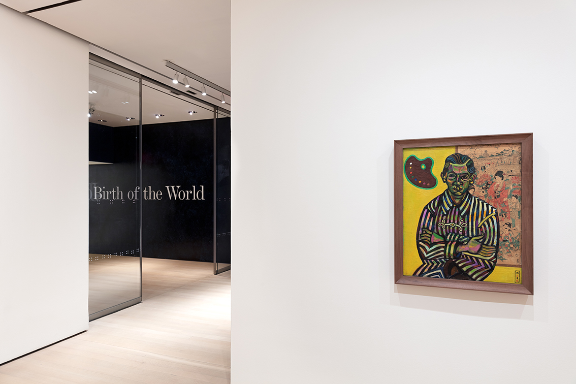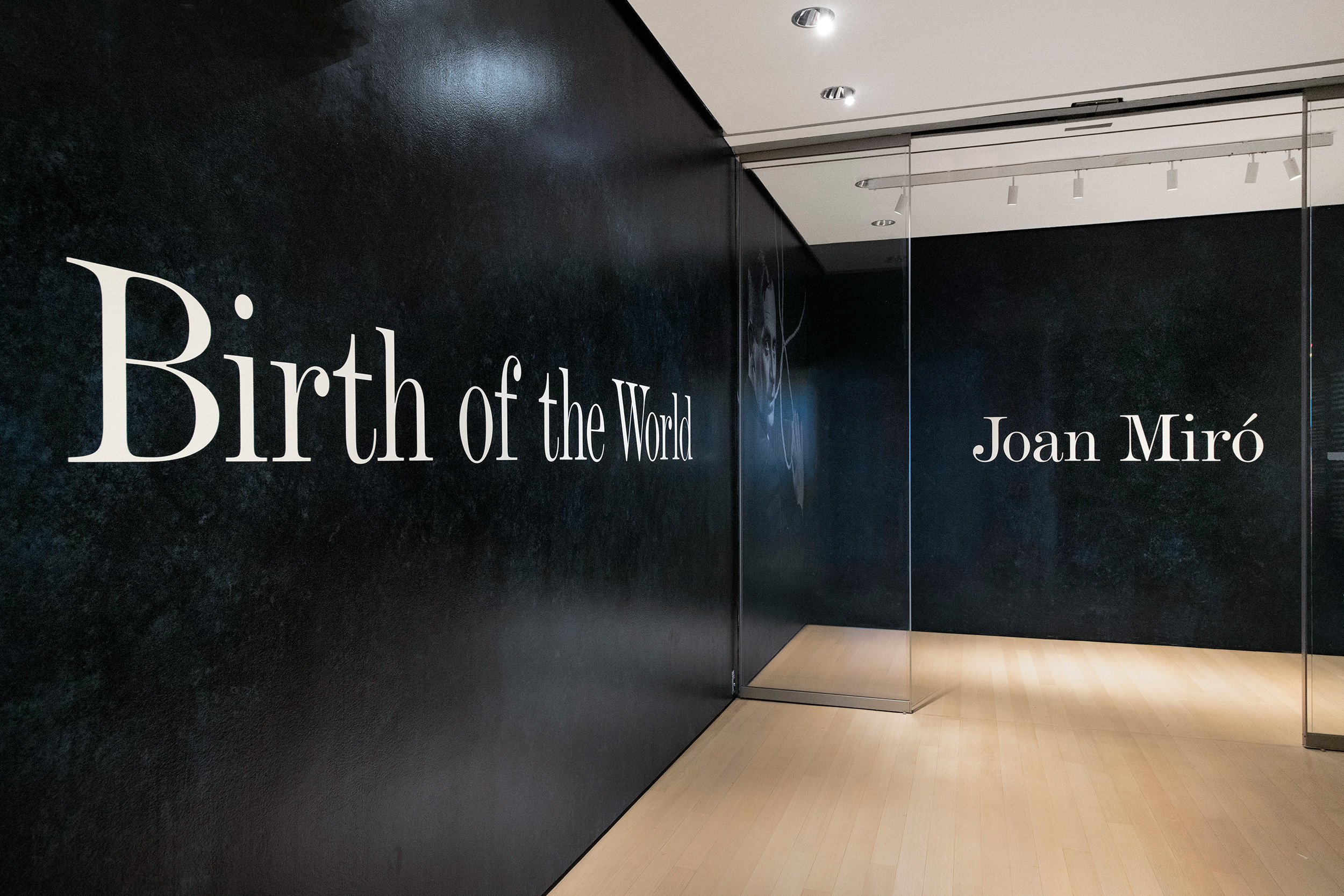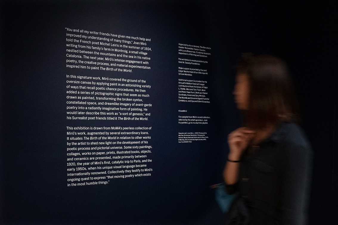 The exhibition entrance of Joan Miró – Birth of the World is covered in a dark blue celestial paint wash reminiscent of an inky cosmos – foregrounding the idea of the creation of the earth and the vast universe surrounding it.