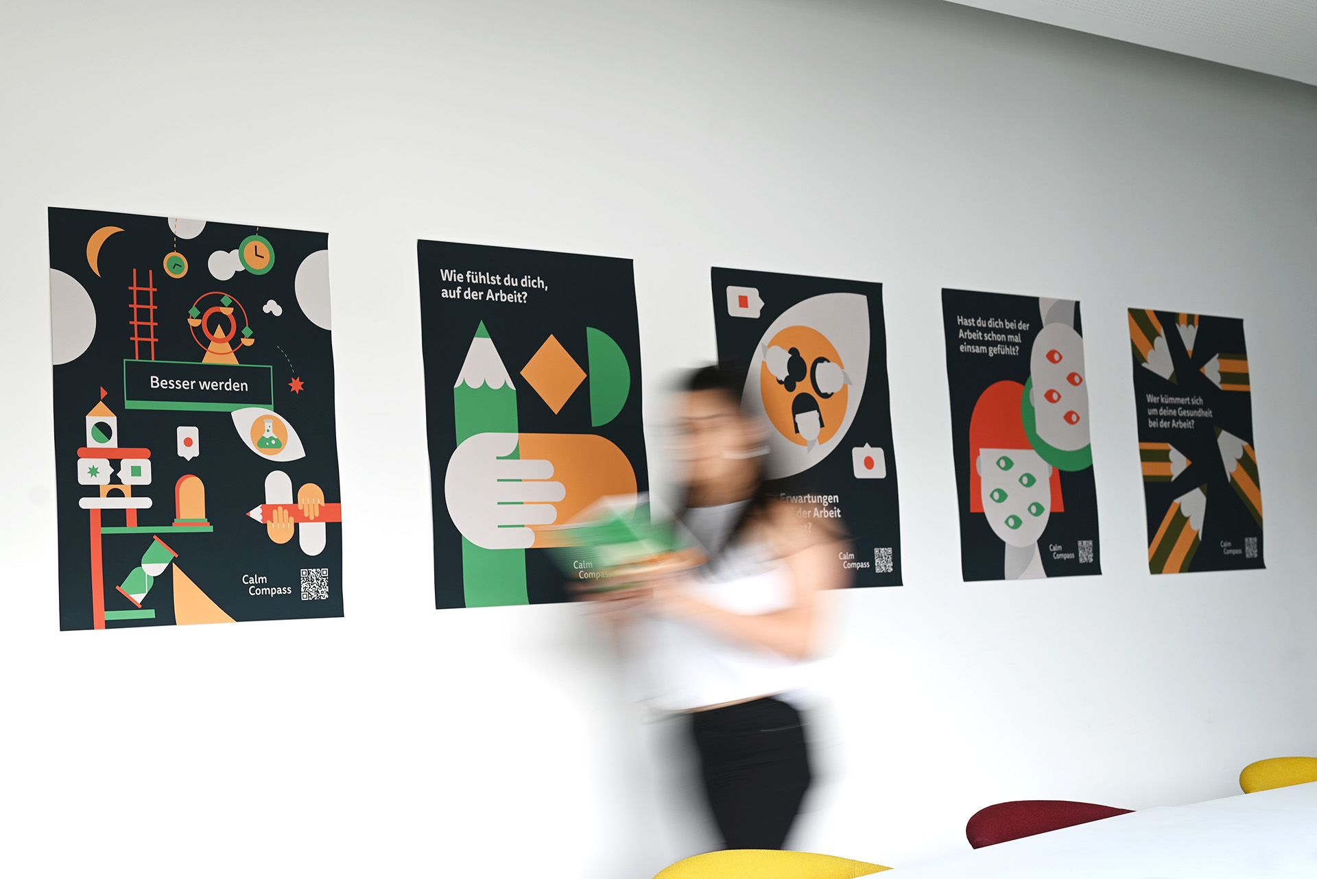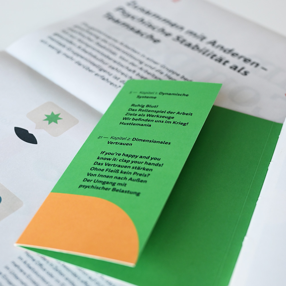 This bachelor thesis project, made at HBKsaar, displays a campaign for mental health at work. It is the projects aim to support trust and transparency in the operational corporate context and establish a sustainably healthy working atmosphere. The strategy contains various touchpoints in print, like a newspaper series and a handbook. Furthermore, it offers an interactive website for employees as a digital tool for information and evaluation of personal mental issues and processes concerning current situations at work. A poster series transfers the campaign into the public urban space.