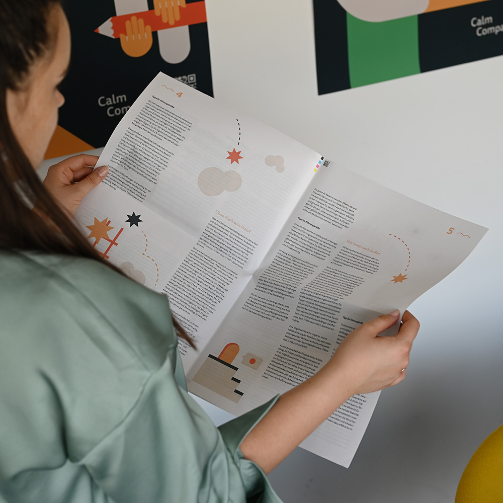 FF Tisa Sans was chosen for Calm Compass because of its soft impression and friendly effect, conveying openness and practicality. It is typeset in dark blue with green accents, rather than hard black, to reinforce this impression. With regard to its use in print and digital media, the typeface was especially tested for display quality and legibility in various sizes and contrasts. Karmina expresses clarity with its pronounced serifs and slanted curves – and it contrasts harmoniously with the friendly Tisa Sans as the main typeface.