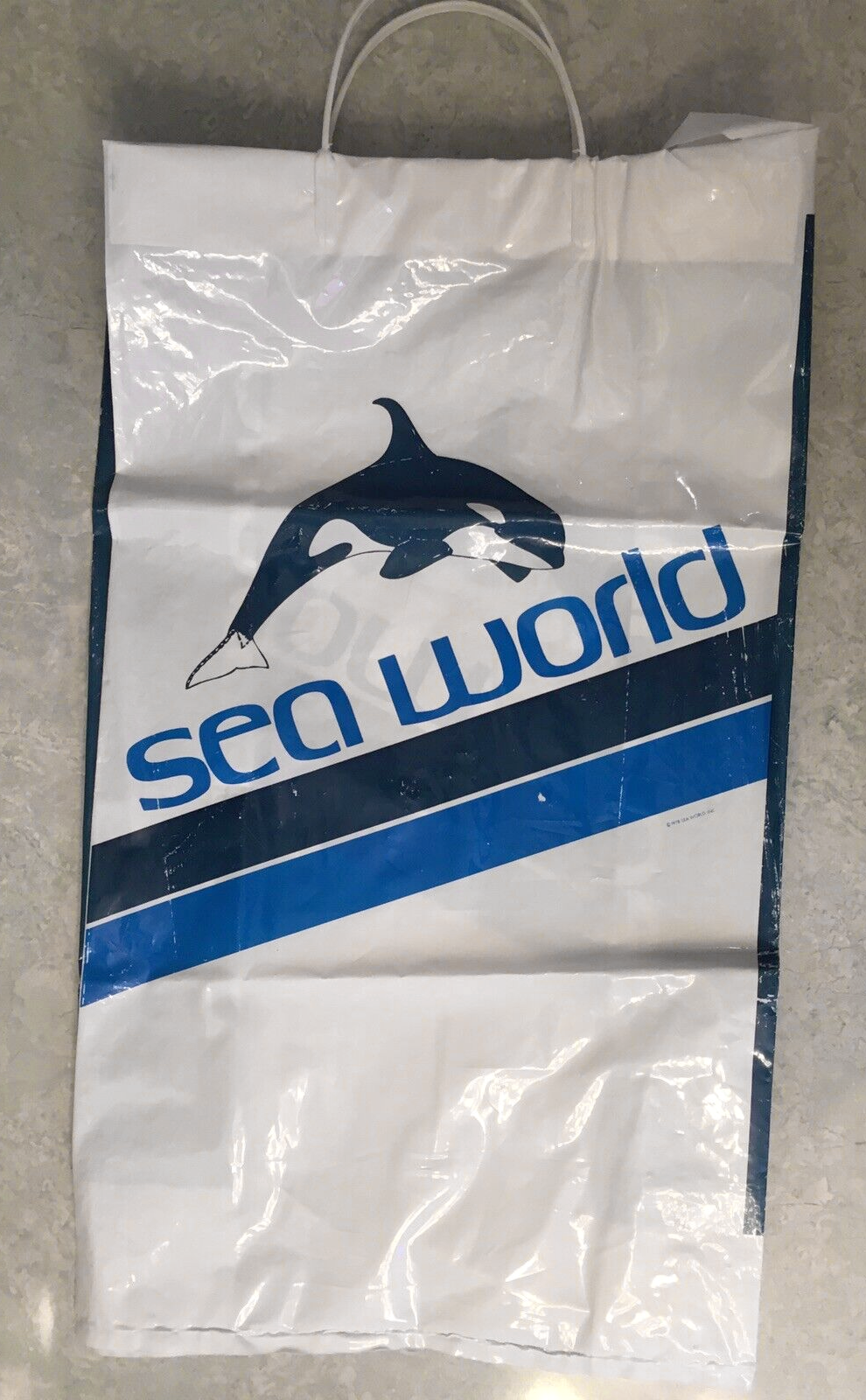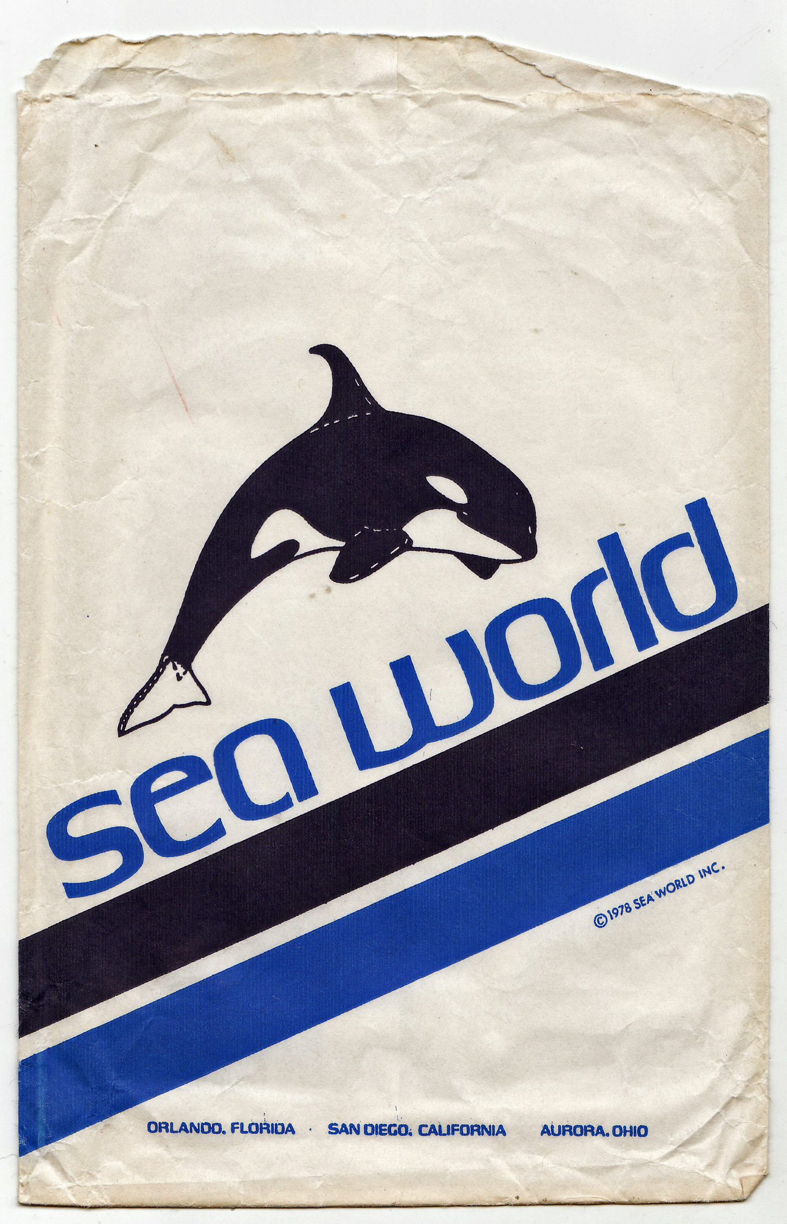 In 1978, though, a different, lesser known typeface was chosen for plastic and paper bags by the chain of amusement parks. It’s Vero Square, issued by the Visual Graphic Corporation in Tamarac, Florida in 1973. “Sea World” is here shown in all lowercase letters, set on an angle. As far as I can tell, this was not a new logo version, but just a one-off application.