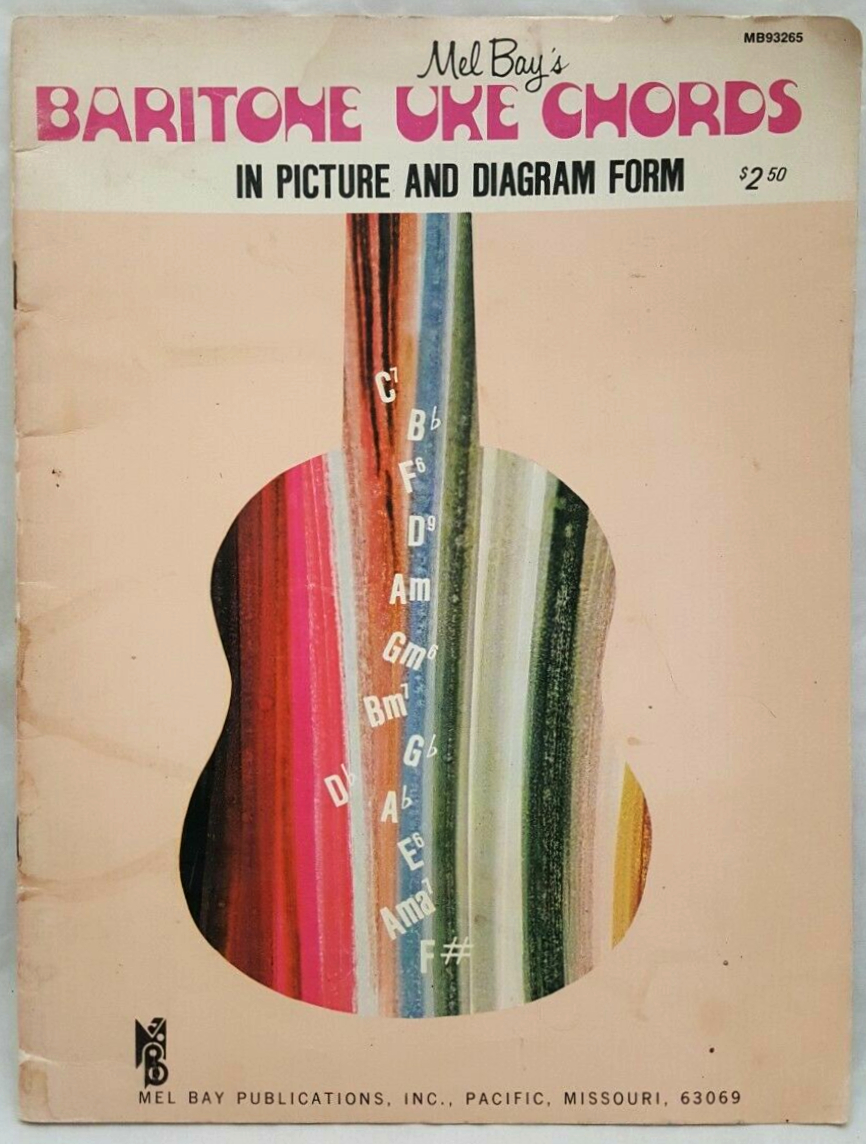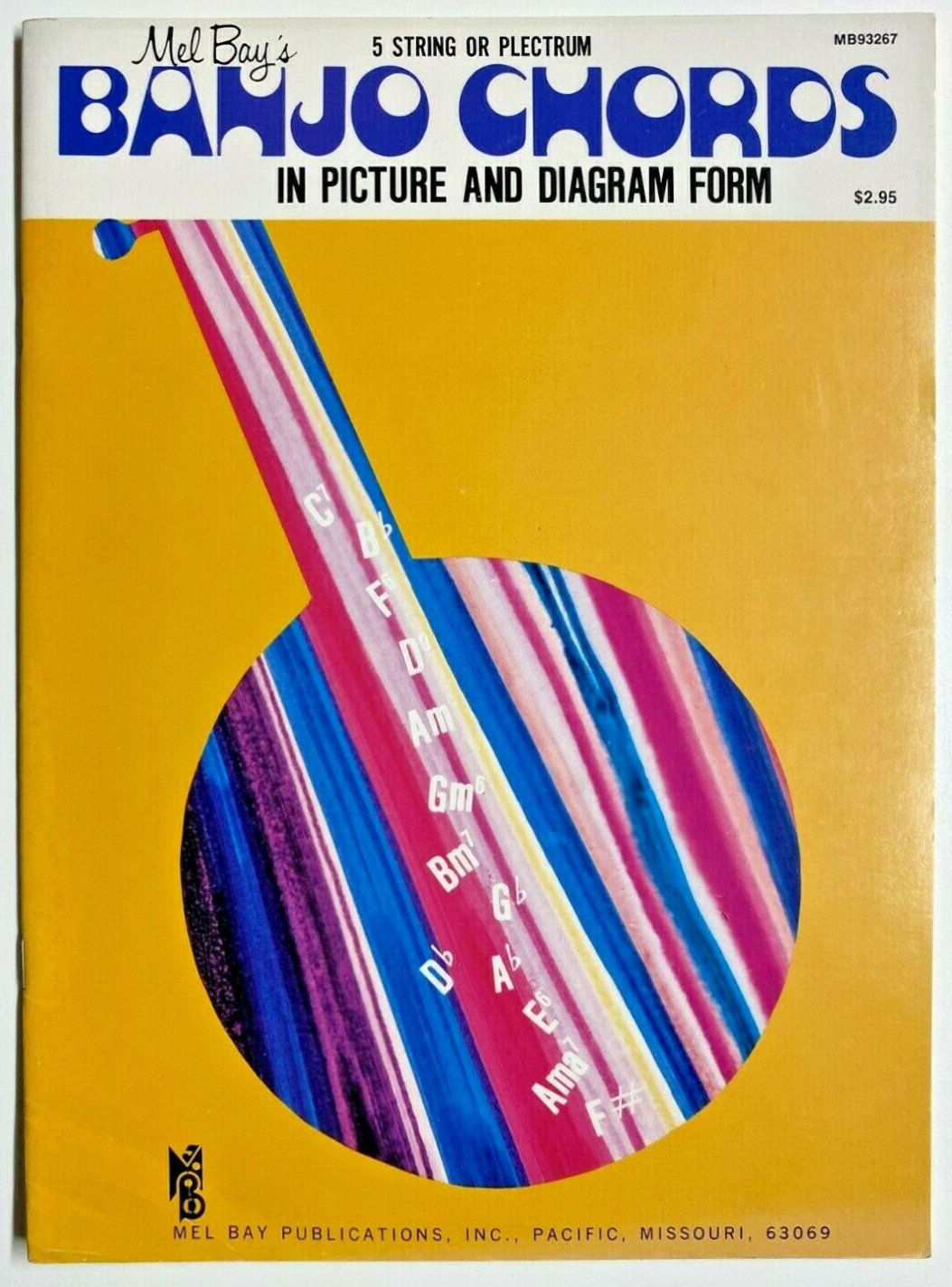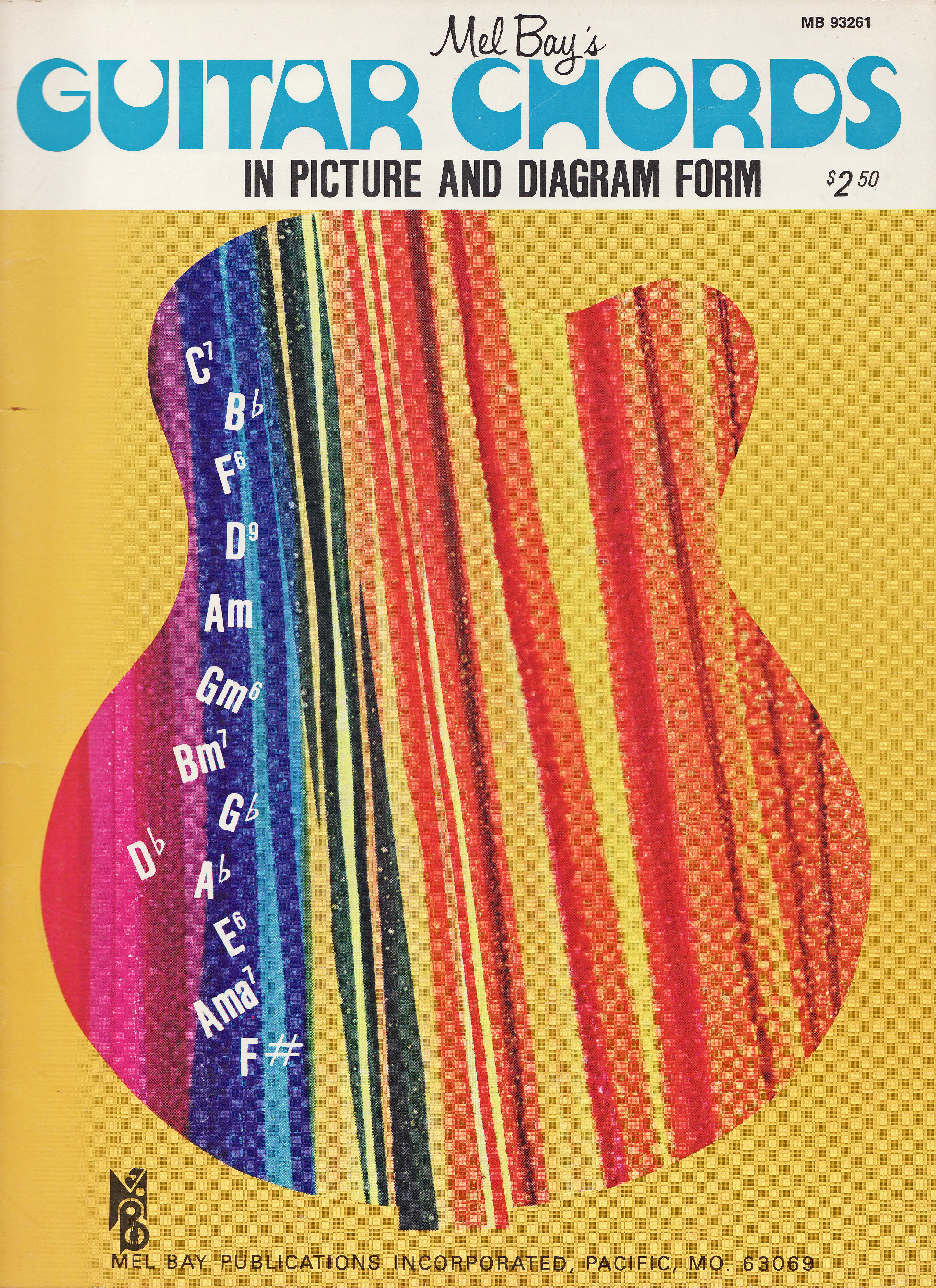 Around 1973, Mel Bay Publications revamped the look of their Chords In Picture and Diagram Form series once again. The cover design with Jolly Roger that was introduced just in 1970 apparently didn’t cut it anymore. The portrait of ol’ Mel Bay (1913–1997) framed by a psychedelic floral pattern had to go, and was replaced by silhouettes of instruments filled with multicolored stripes. The only graphic elements that could stay were the MB monogram and Mel Bay’s name in Filmotype Honey.