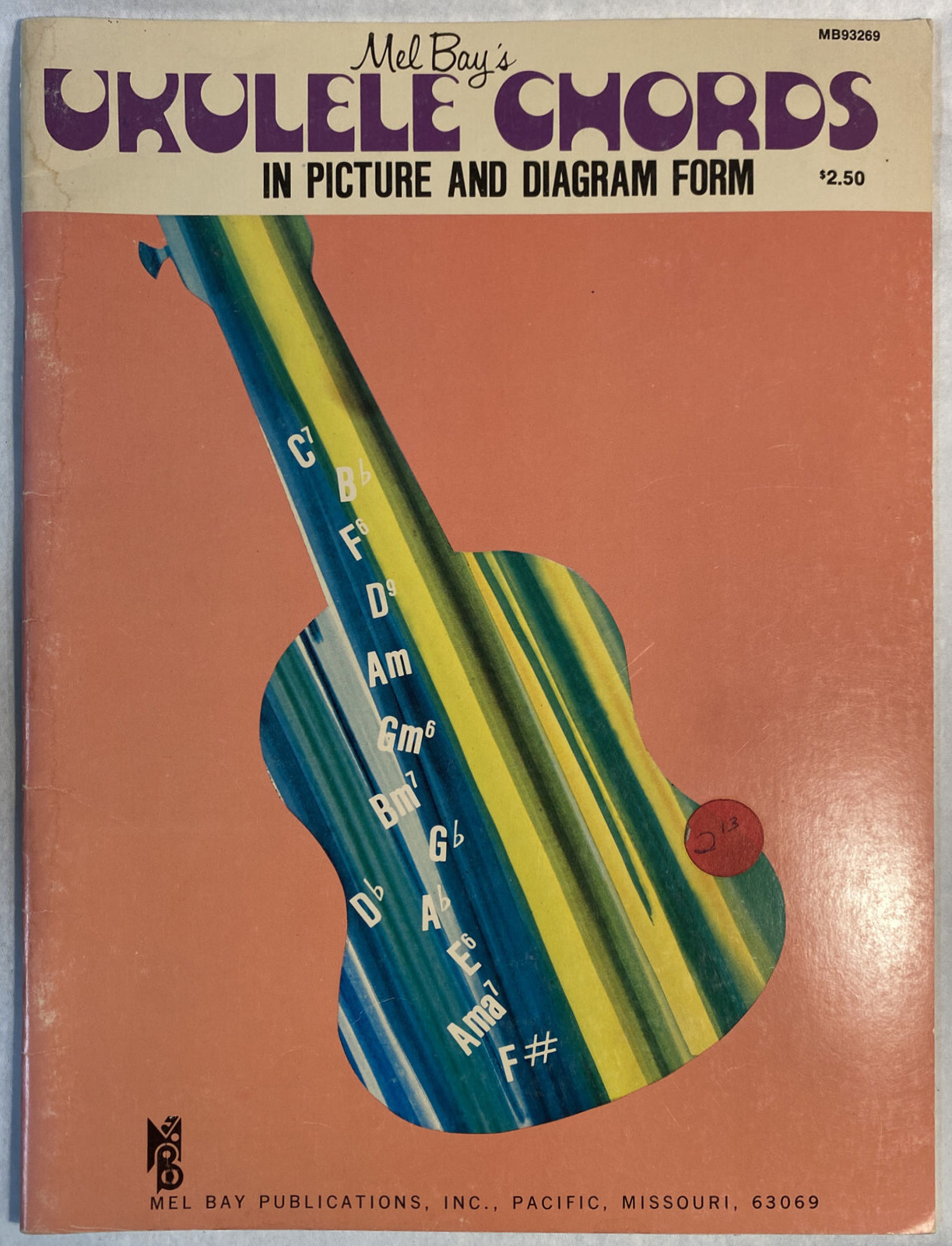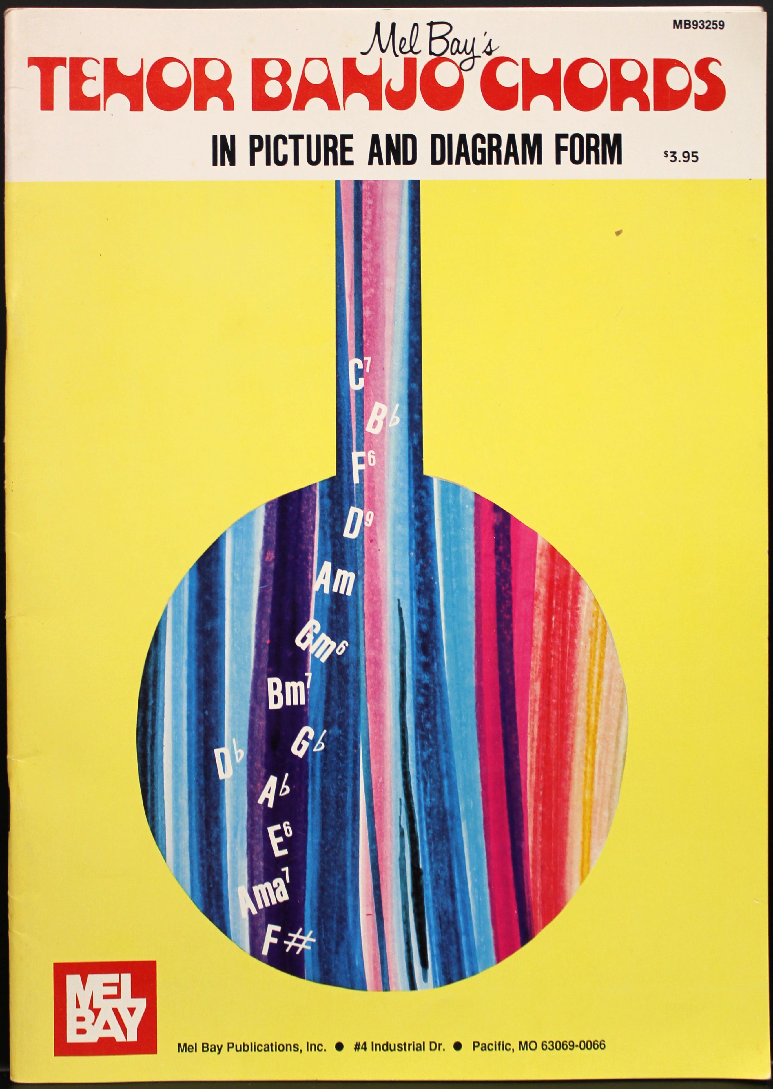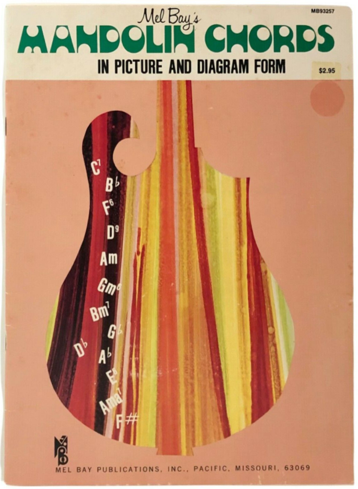 Around 1973, Mel Bay Publications revamped the look of their Chords In Picture and Diagram Form series once again. The cover design with Jolly Roger that was introduced just in 1970 apparently didn’t cut it anymore. The portrait of ol’ Mel Bay (1913–1997) framed by a psychedelic floral pattern had to go, and was replaced by silhouettes of instruments filled with multicolored stripes. The only graphic elements that could stay were the MB monogram and Mel Bay’s name in Filmotype Honey.