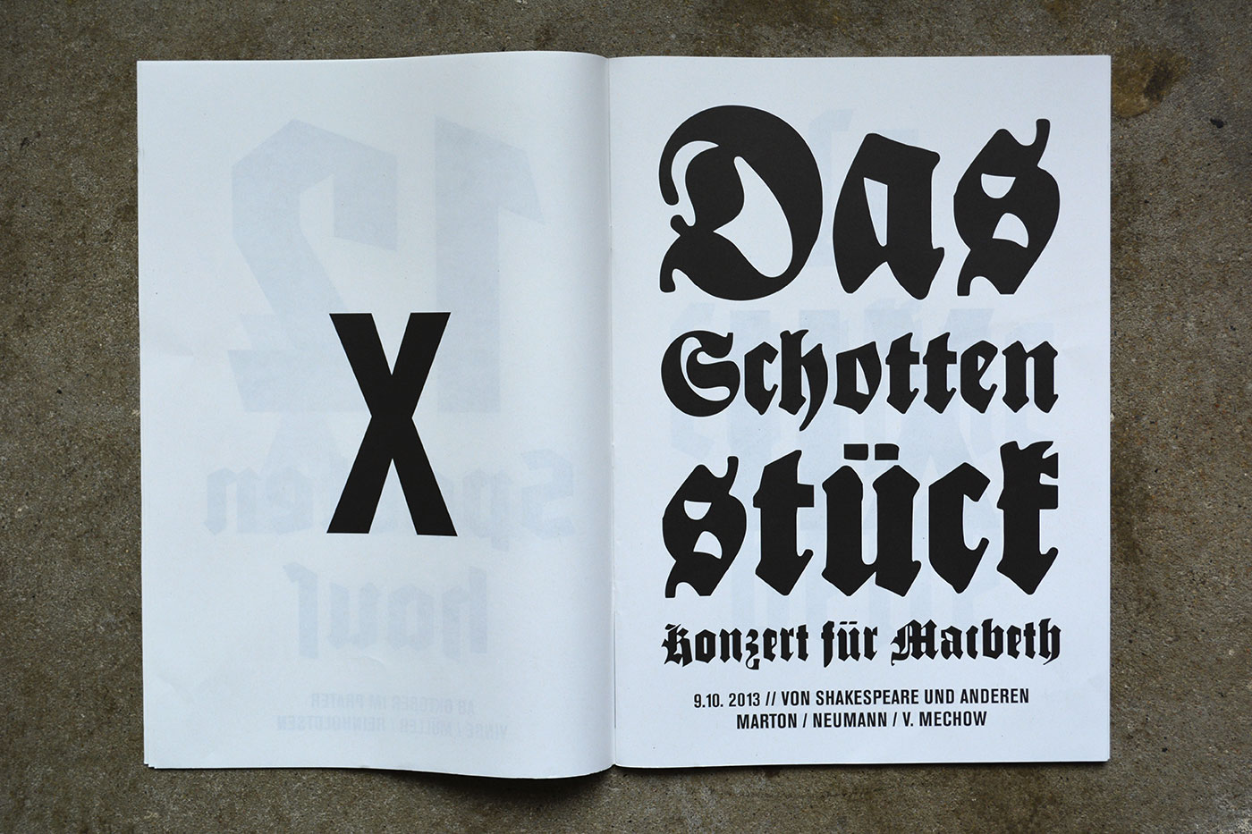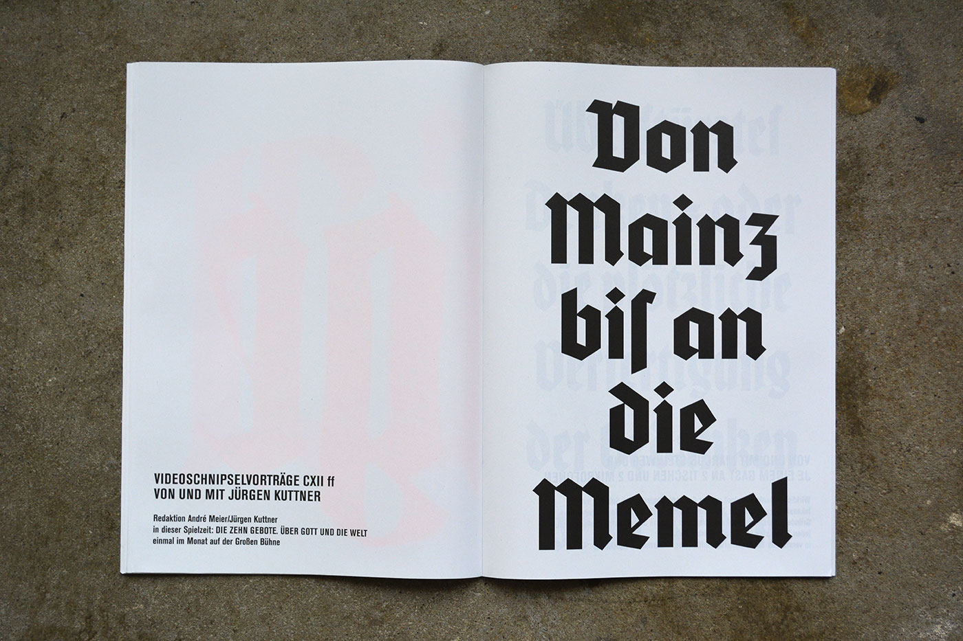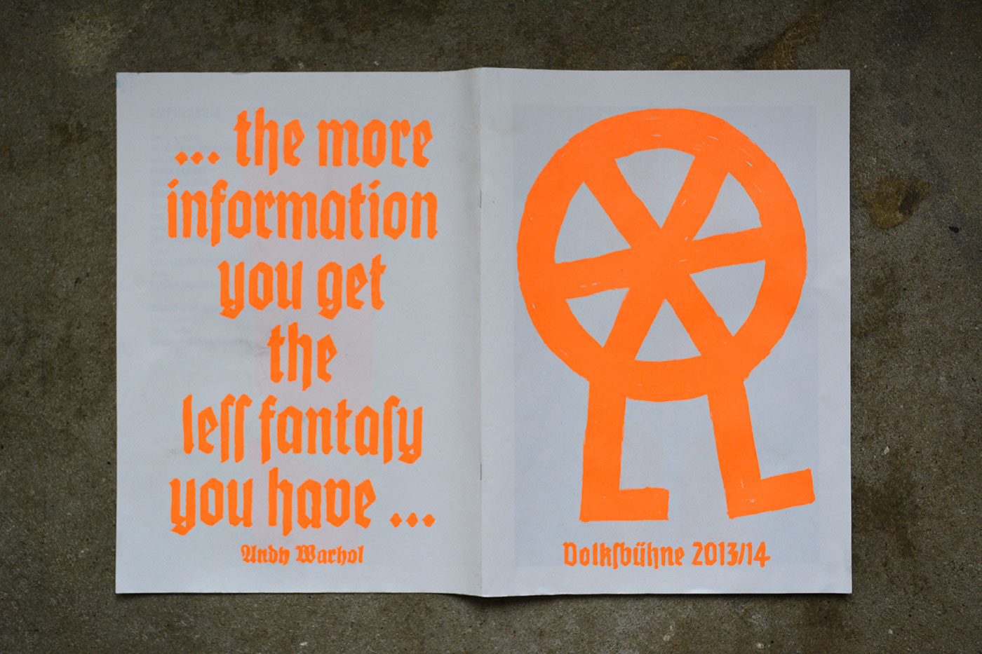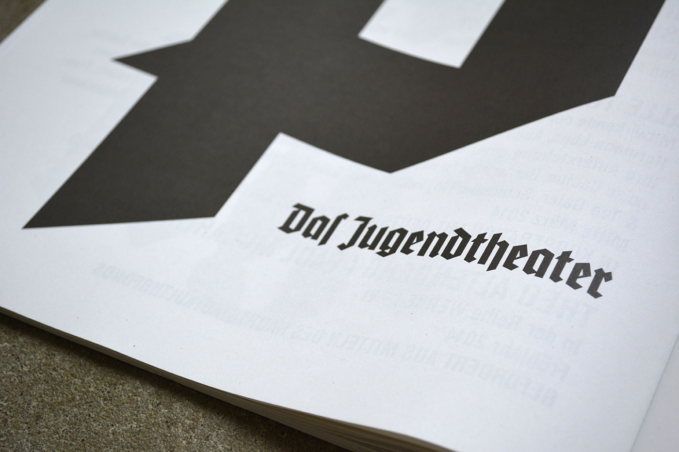 Volksbühne’s spielzeitheft – the season magazine – for 2013/14 is a large-format brochure (DIN A3) with 88 pages. There are a number of black-and-white photos by Lenore Blievernicht, but most of it is purely typographic. As with the posters, a mix of blackletter typefaces has been used, but here the palette is even wider.