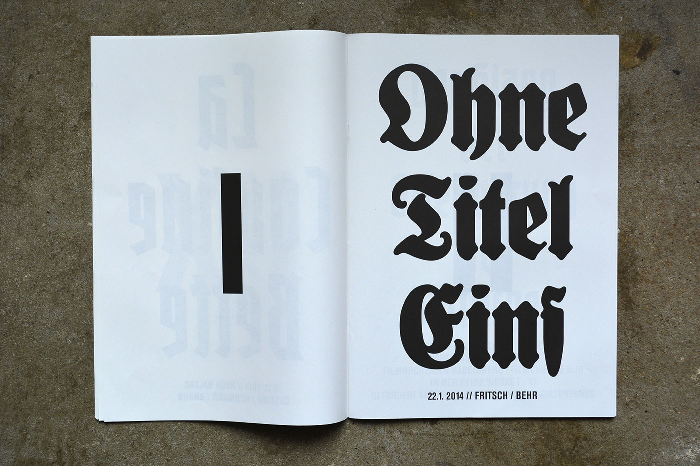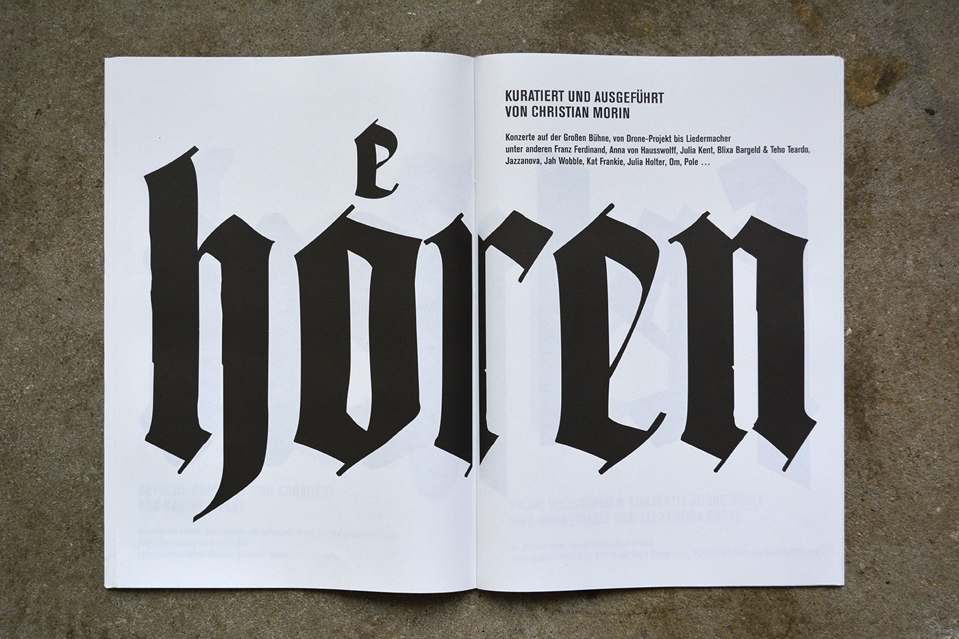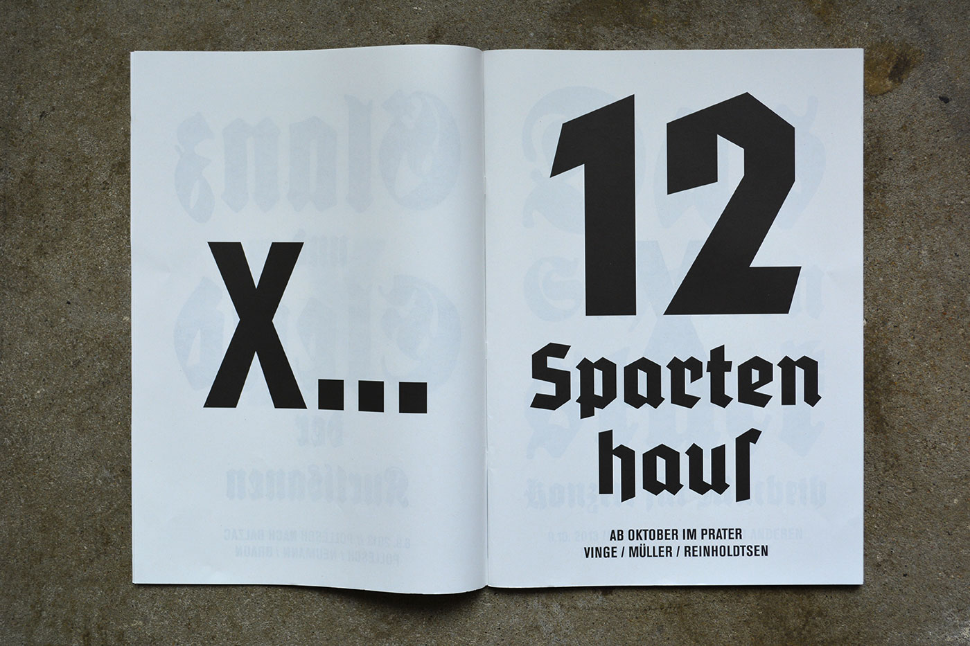 Volksbühne’s spielzeitheft – the season magazine – for 2013/14 is a large-format brochure (DIN A3) with 88 pages. There are a number of black-and-white photos by Lenore Blievernicht, but most of it is purely typographic. As with the posters, a mix of blackletter typefaces has been used, but here the palette is even wider.