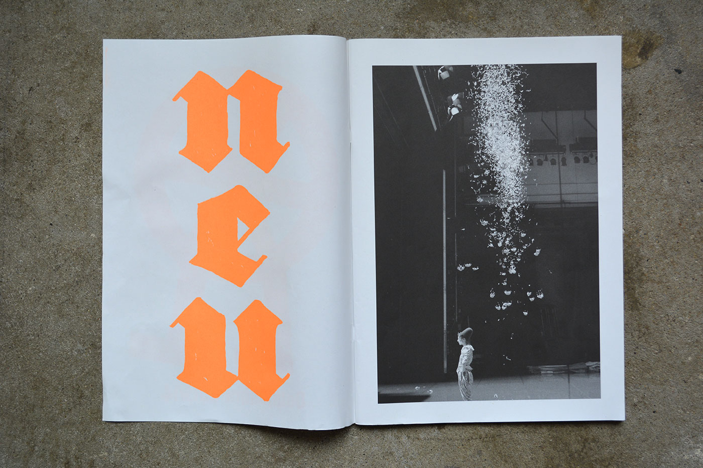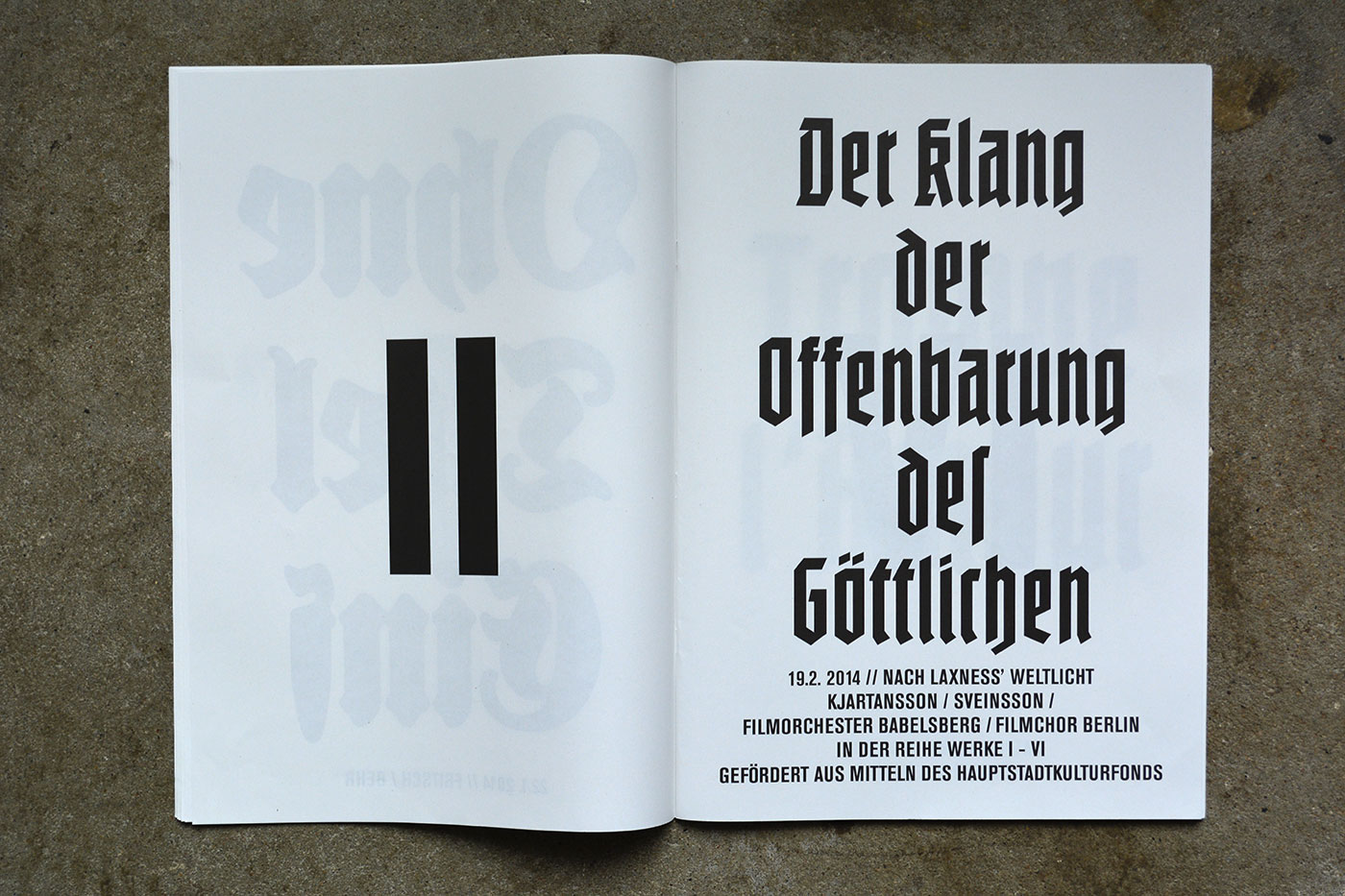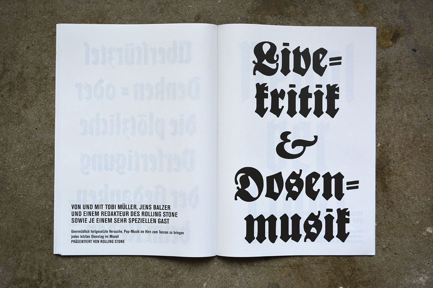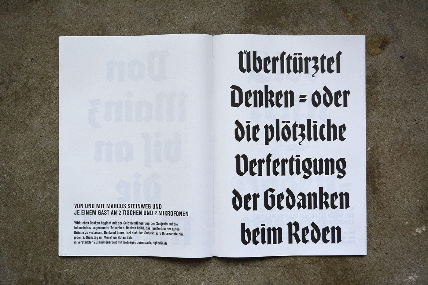 Volksbühne’s spielzeitheft – the season magazine – for 2013/14 is a large-format brochure (DIN A3) with 88 pages. There are a number of black-and-white photos by Lenore Blievernicht, but most of it is purely typographic. As with the posters, a mix of blackletter typefaces has been used, but here the palette is even wider.