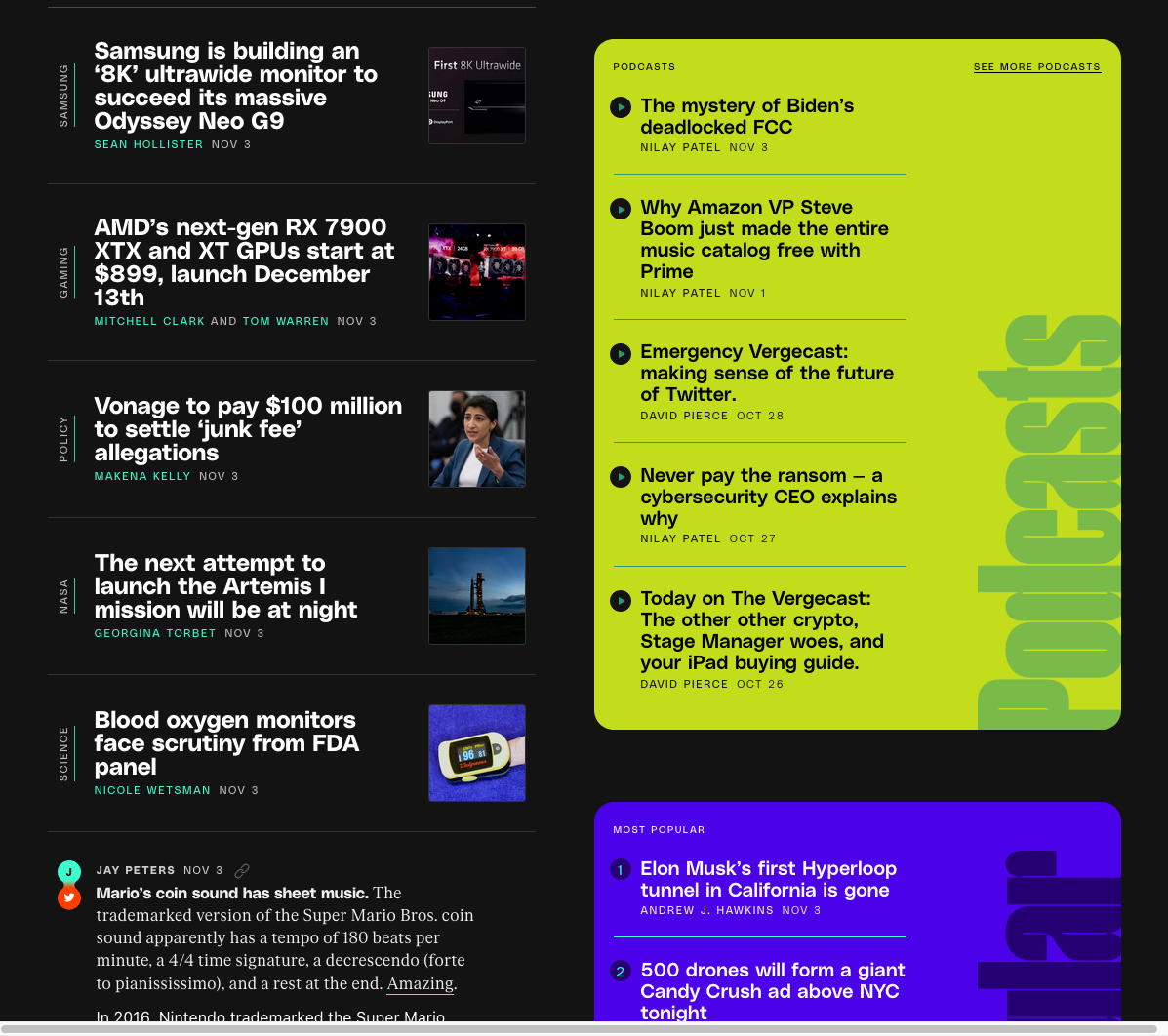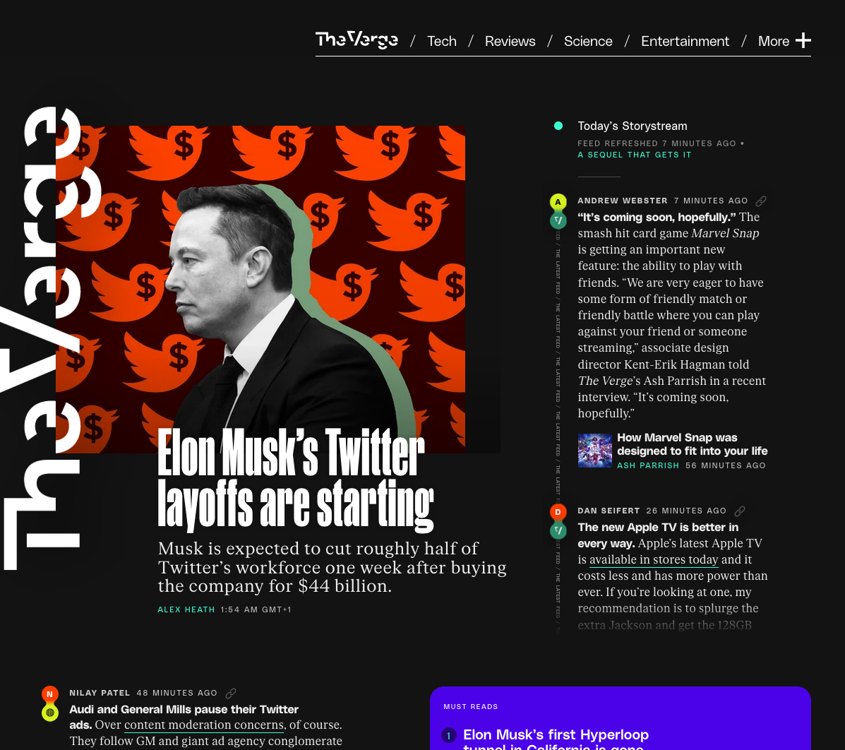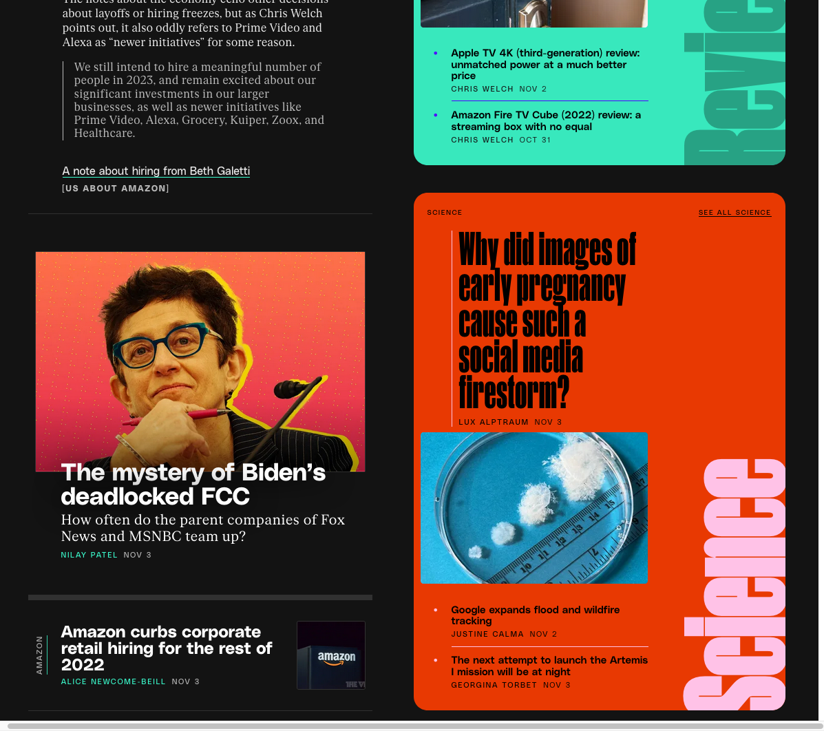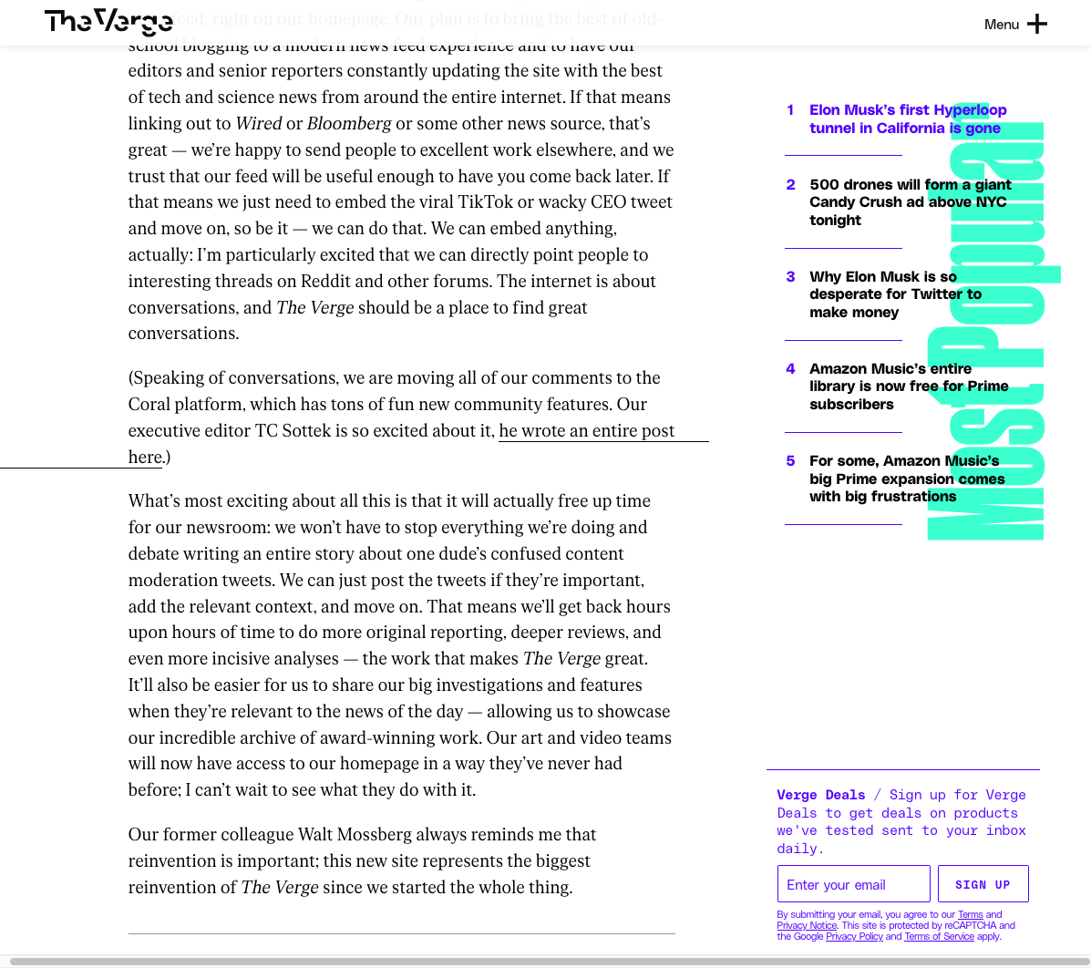 Gradient Type’s PolySans (incl. the Mono), Klim Type Foundry’s Mānuka and Florian Karsten’s FK Roman are used as working typefaces for the new Verge. The design was developed in-house. From The Verge’s release notes: