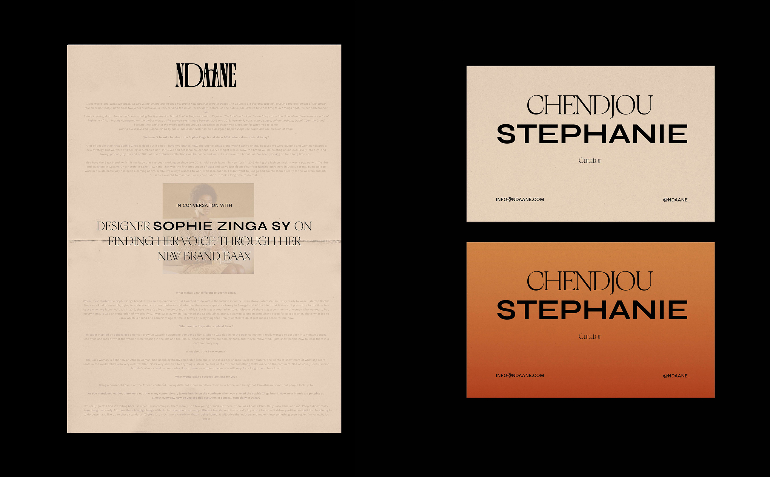 Curated by Stéphanie Chendjou, Ndaane is a platform for emerging African fashion talents to get discovered and tell their stories, passion, and challenges through thoughtful curation. We worked with Ndaane to refine their brand positioning and redesign its brand identity.