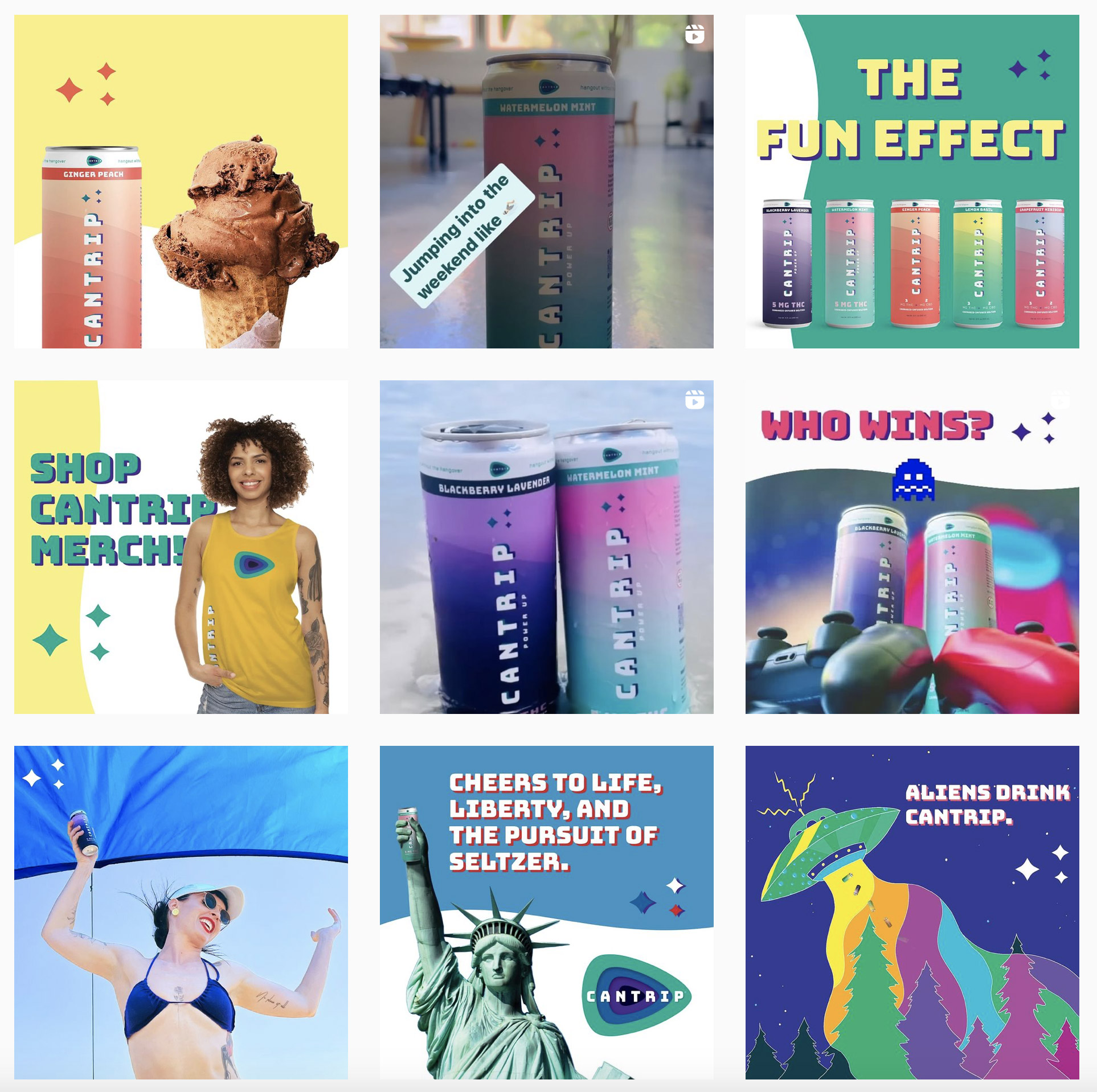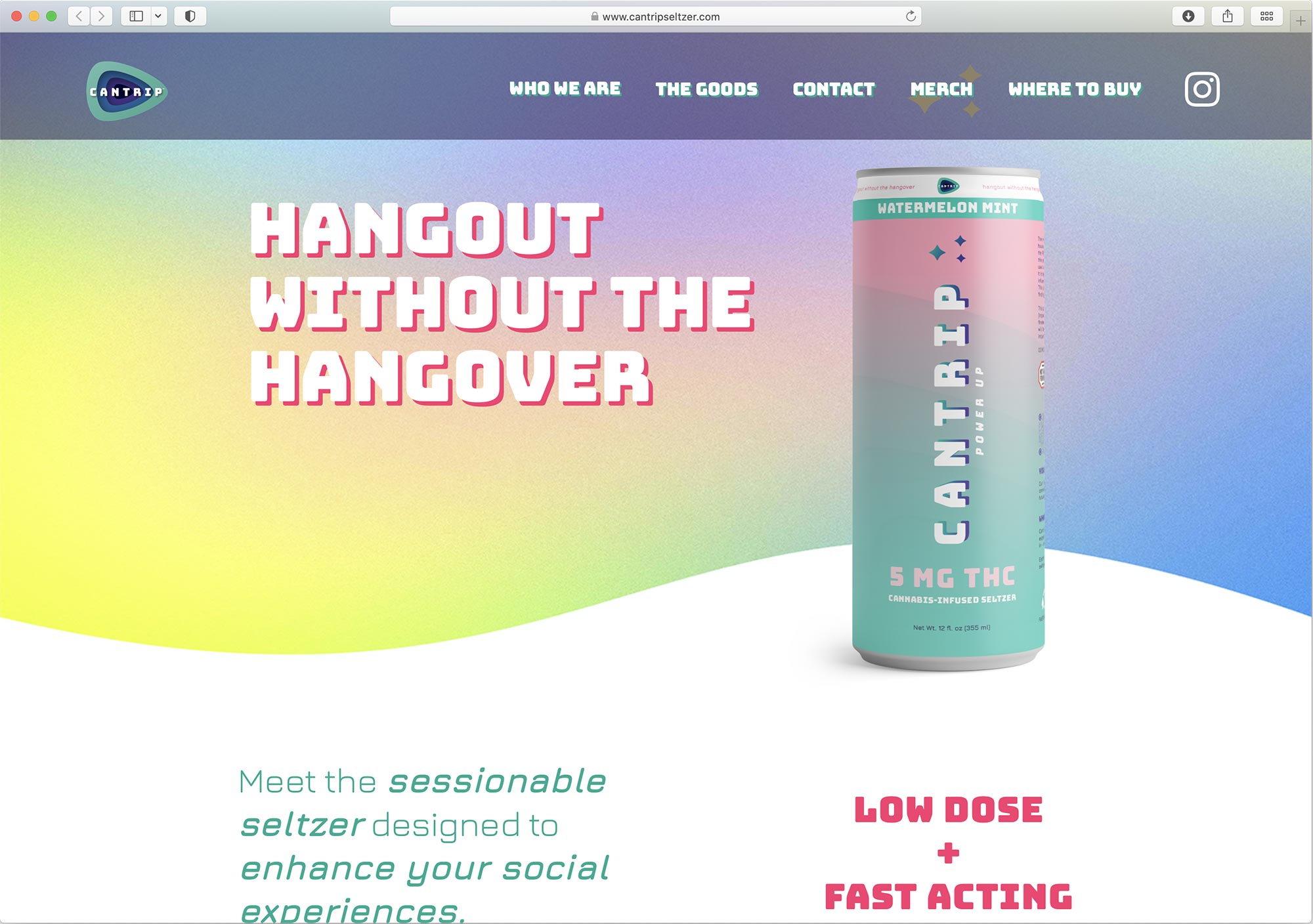 Drop shades play a big part in Cantrip’s identity, helping the text pop against the colorful backdrops of the cans. Bungee’s layer fonts are not used in the identity, but there’s a similar feeling simplified dimensionality that fits the design. I love seeing how this visual language has extended from the packaging into the merchandise and social media posts, not to mention the website headers (the website navigation even has shadows that change on-hover).