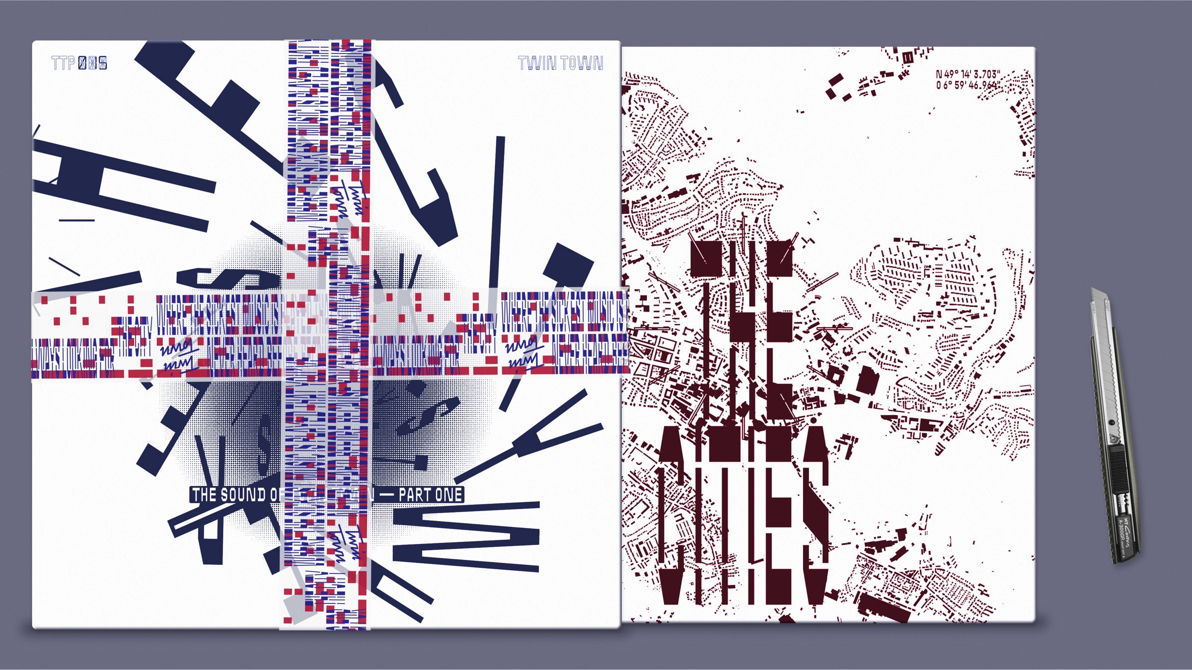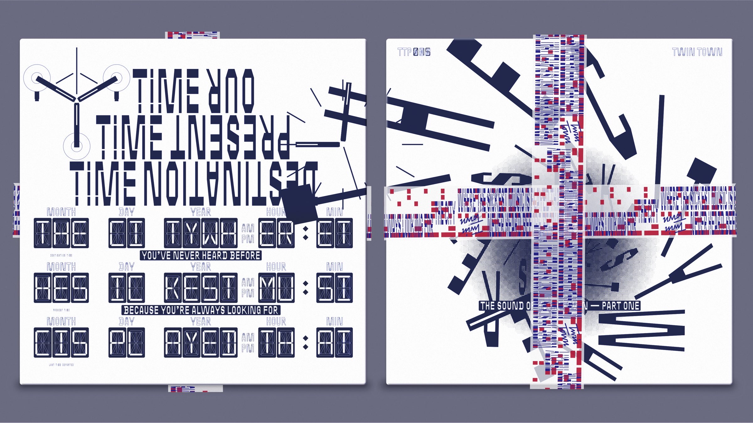 The 3LP set, representing Pt. I, is an engaging package. Three individual LPs are bound together by a custom 2-color-printed adhesive tape bearing the infinitely scrolling inscription: “the city where the sickest music is played that you’ve never heard before because you’re always looking for…”. Each LP within the set represents a distinct phase in Twin Town’s musical journey, collectively narrating the label’s first decade.