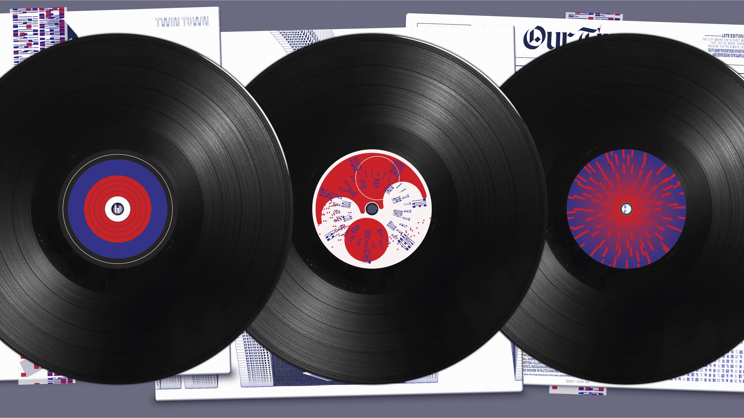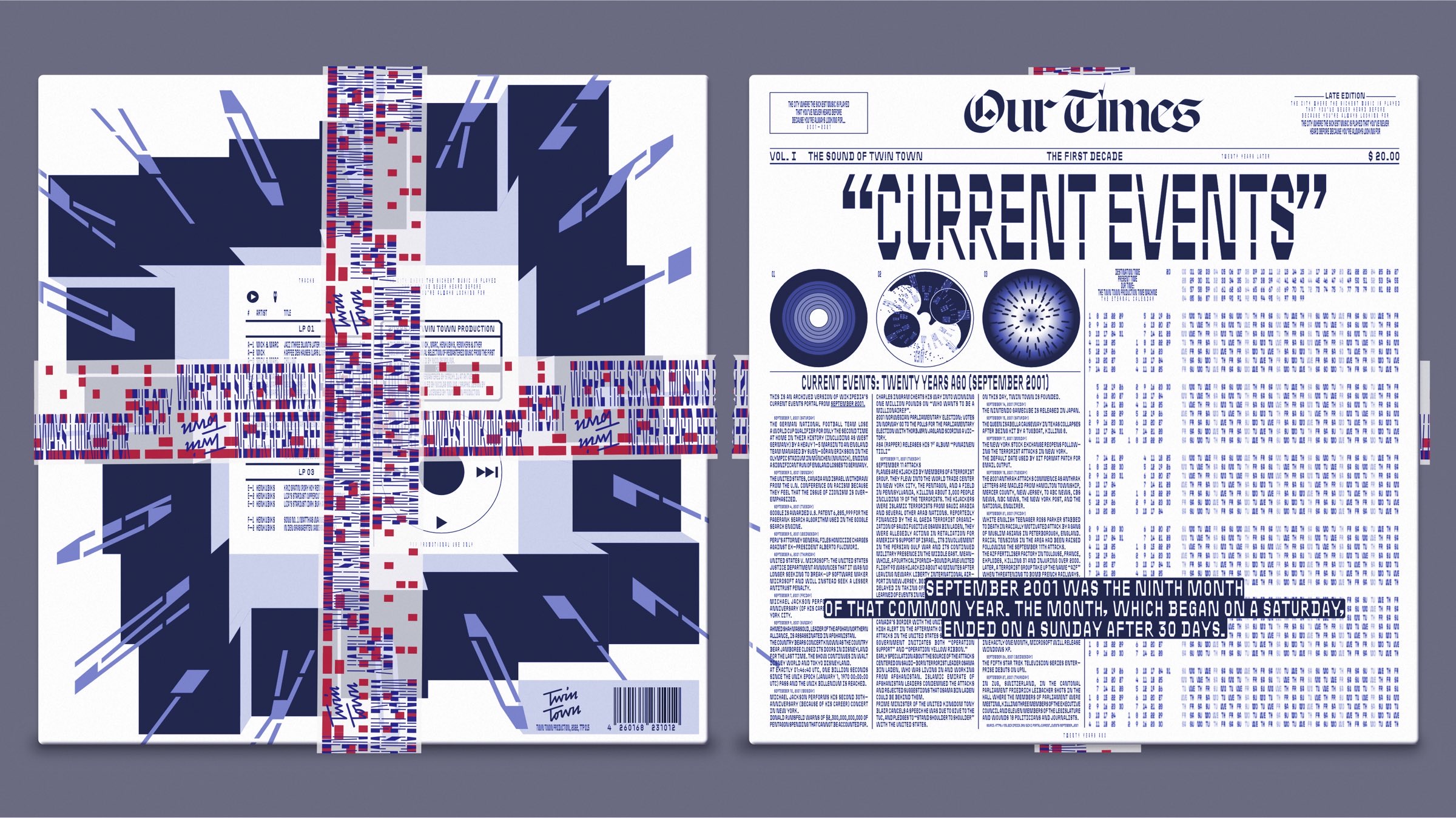 The design leans heavily on typography, complemented by selective illustrations. The records themselves are printed in distinctive spot colors — blue PMS 282 for the covers and red PMS 188 for the inner sleeves. The overarching theme is a journey through twenty years of pop culture milestones, featuring icons such as the original iPod Click Wheel, the launch of Windows XP, and the rise of Wikipedia.