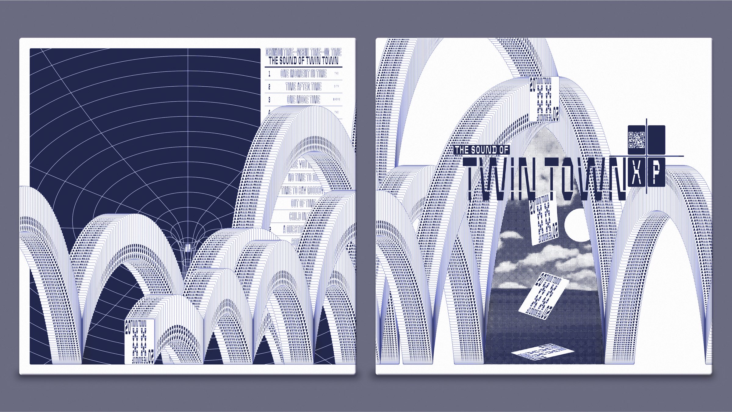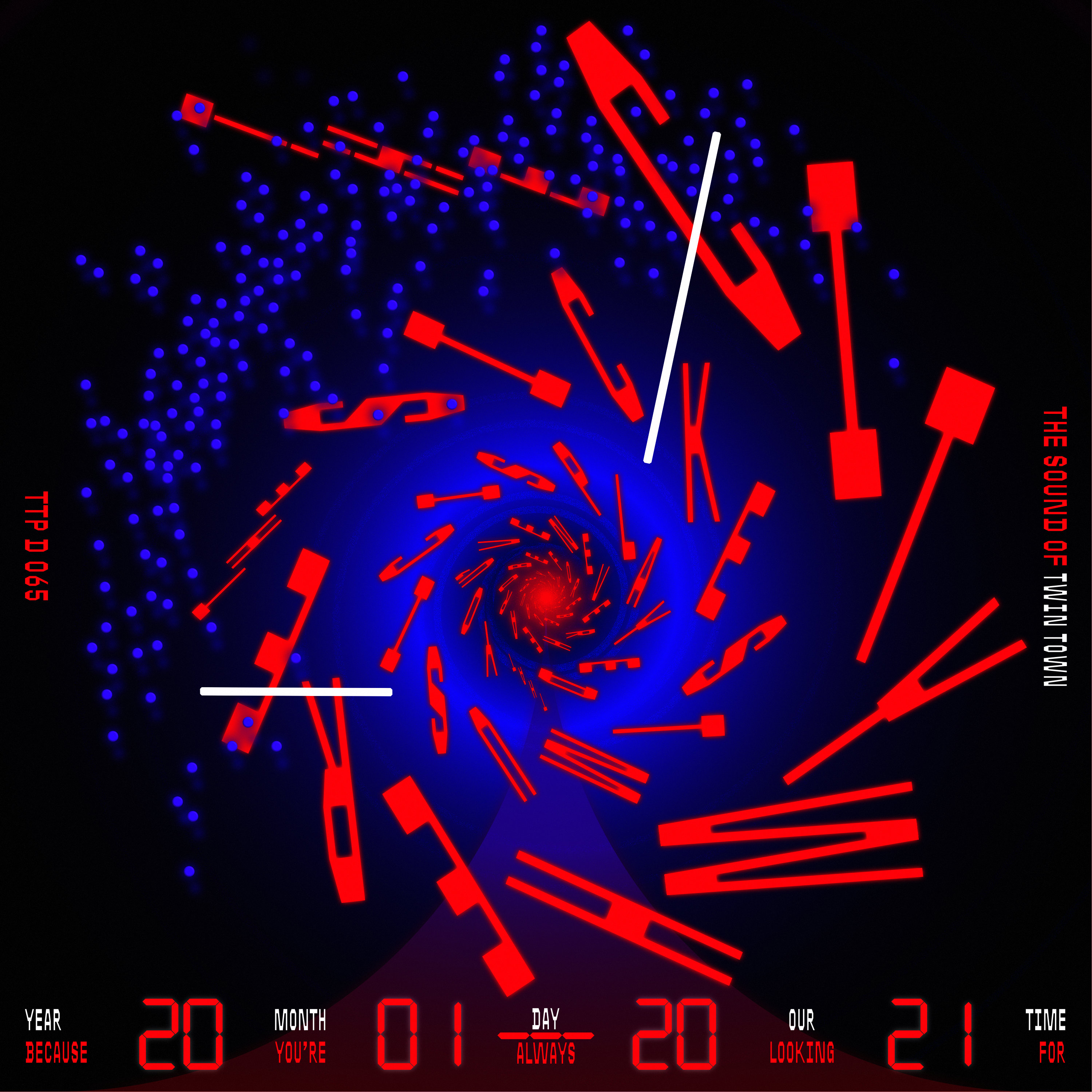 The Sound of Twin Town: Tribute Mix Pt. II is a digital-only release that evolves the artwork of the third LP. It combines the Escher-style infinite staircase with the infinite watch face of LP No. 1, merging the front and back sides of the 3LP package into a new artwork. This design symbolically wraps up the entire saga, merging elements from throughout the 20-year journey and bringing the tribute to a cohesive conclusion.