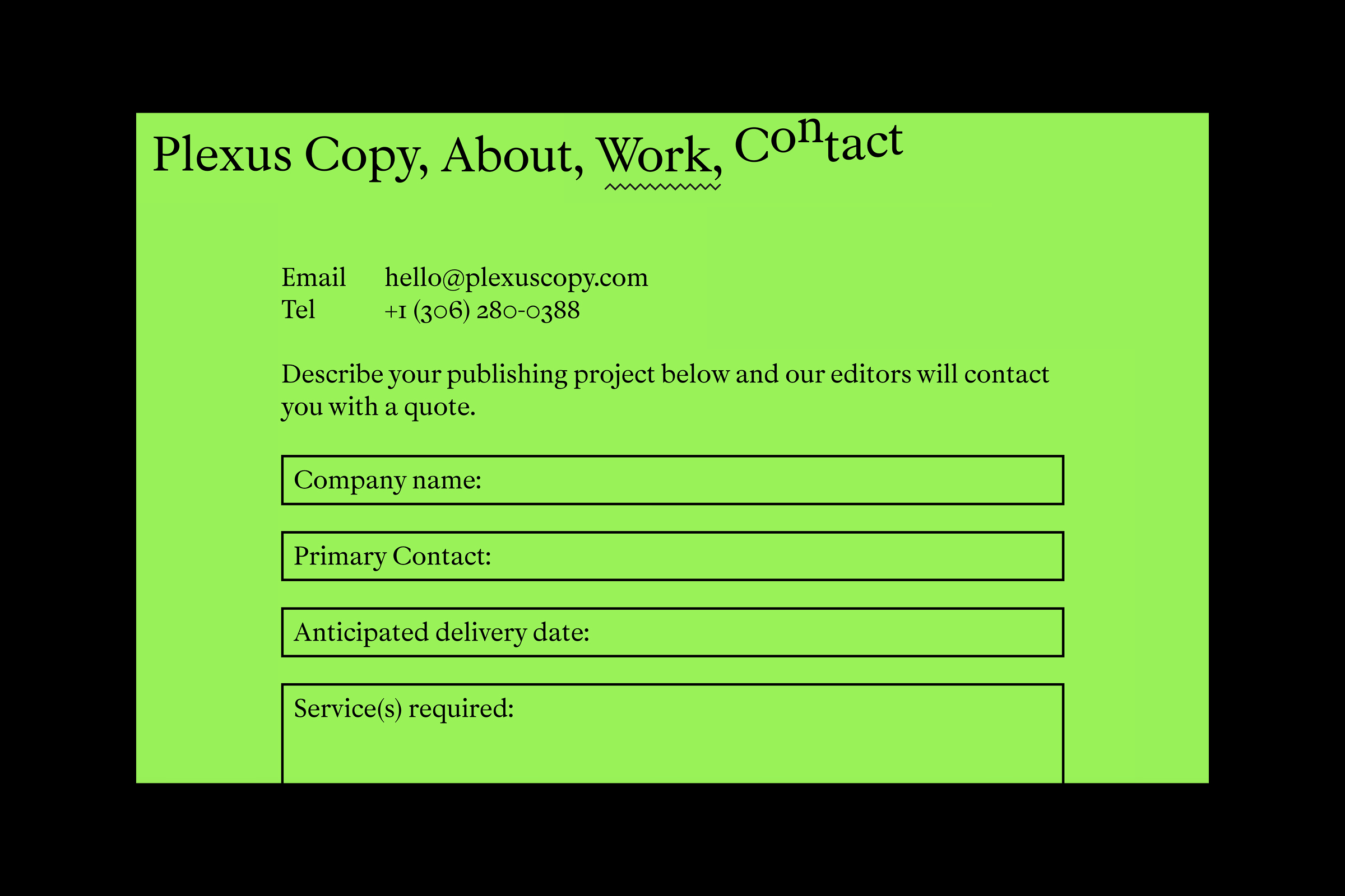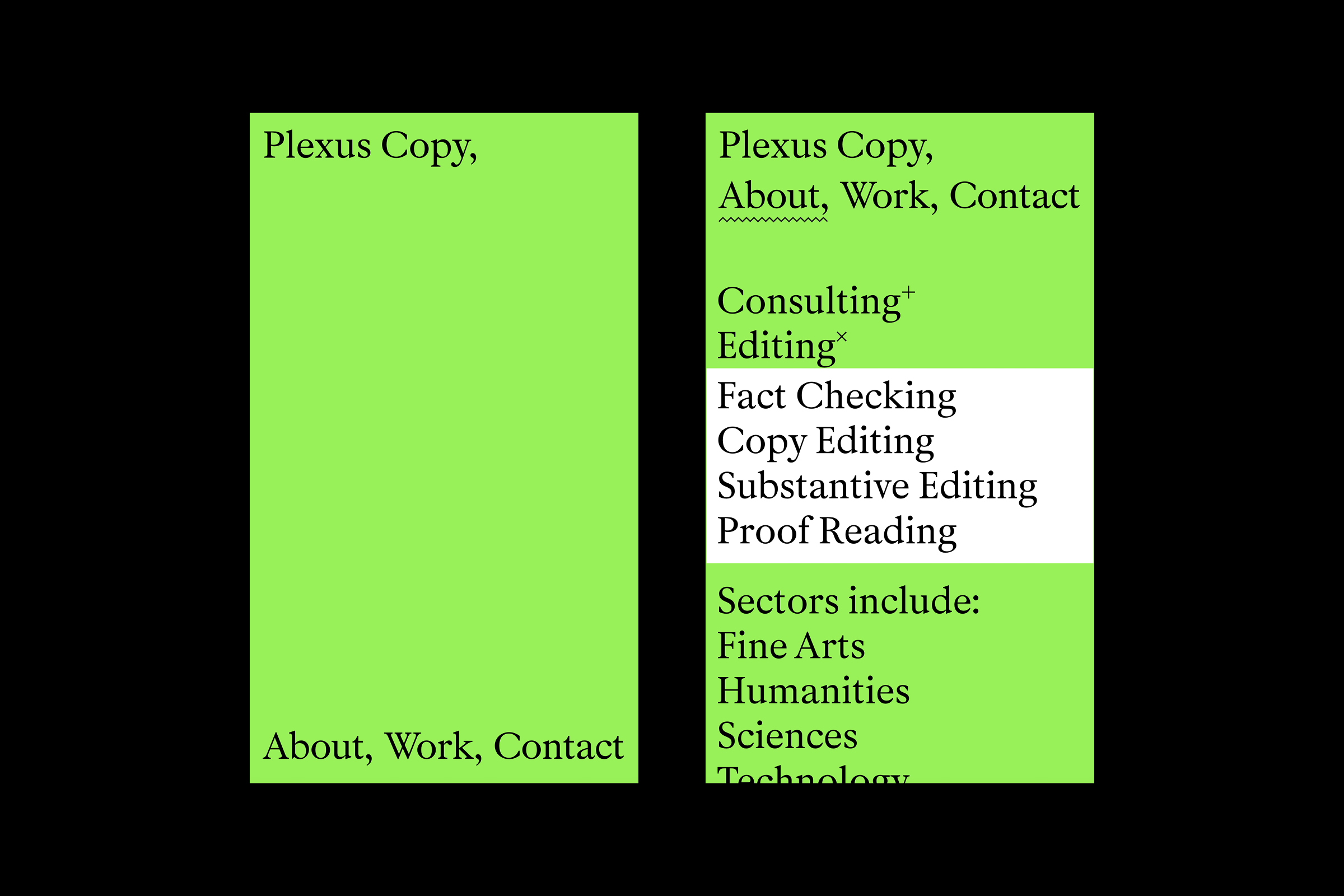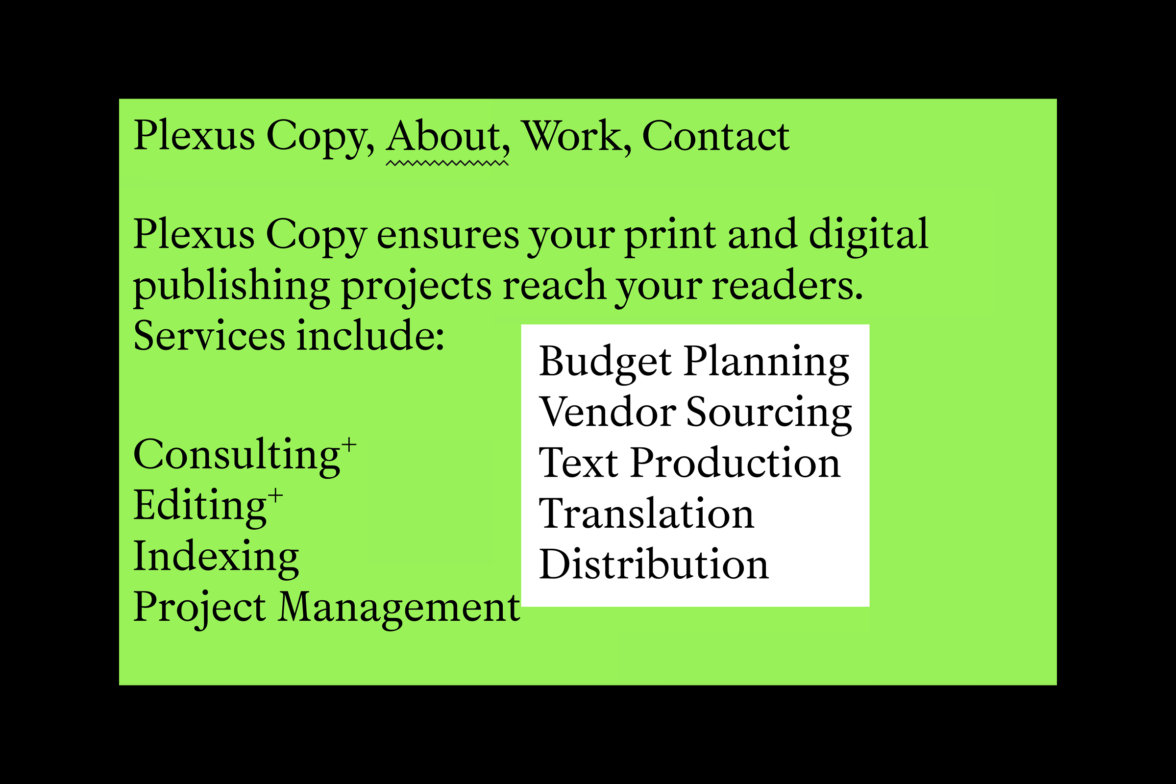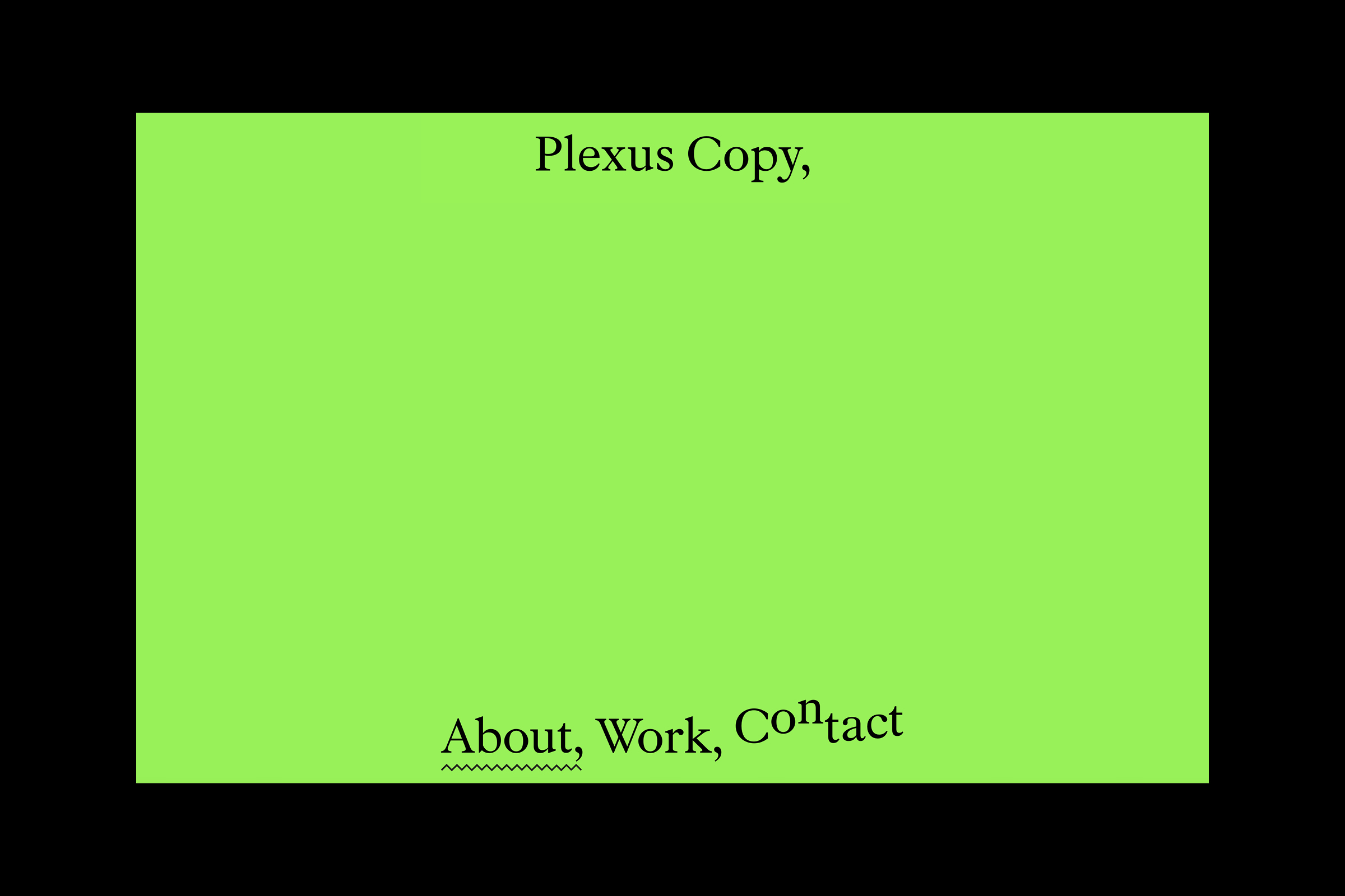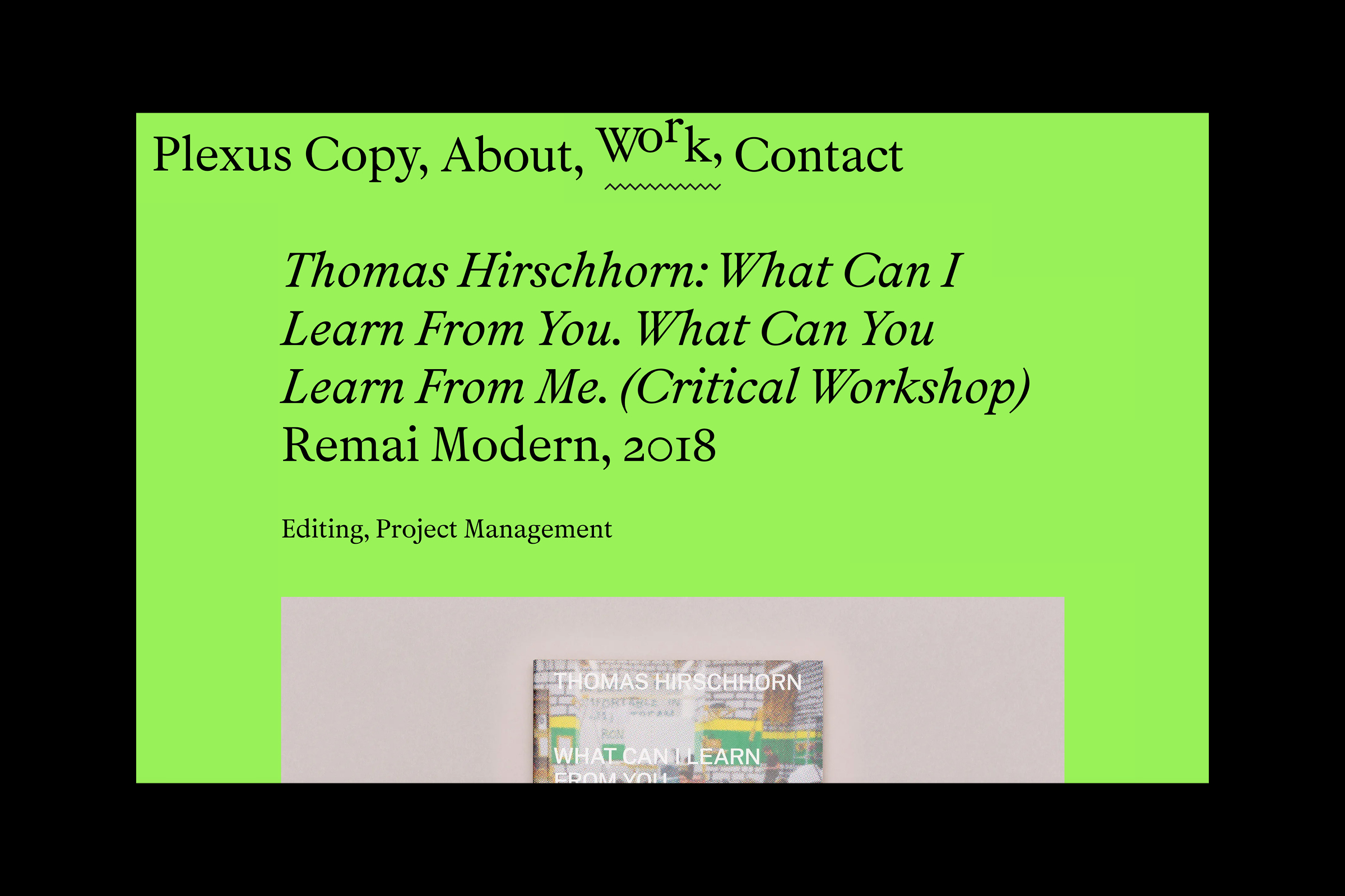Plexus Copy is a consultancy which offers editing, indexing and project management for publishing sectors including fine arts, science and technology, as well as brand and marketing copywriting. Daly & Lyon designed three websites for Canadian artist Rebecca La Marre, each with a focus on a specific area of her practice. Common fundamental elements are carried across the sites, but adopting their own treatments and behaviours in each case. La Marre’s interest in text and language form the basis of the sites’ identities (Daly & Lyon).