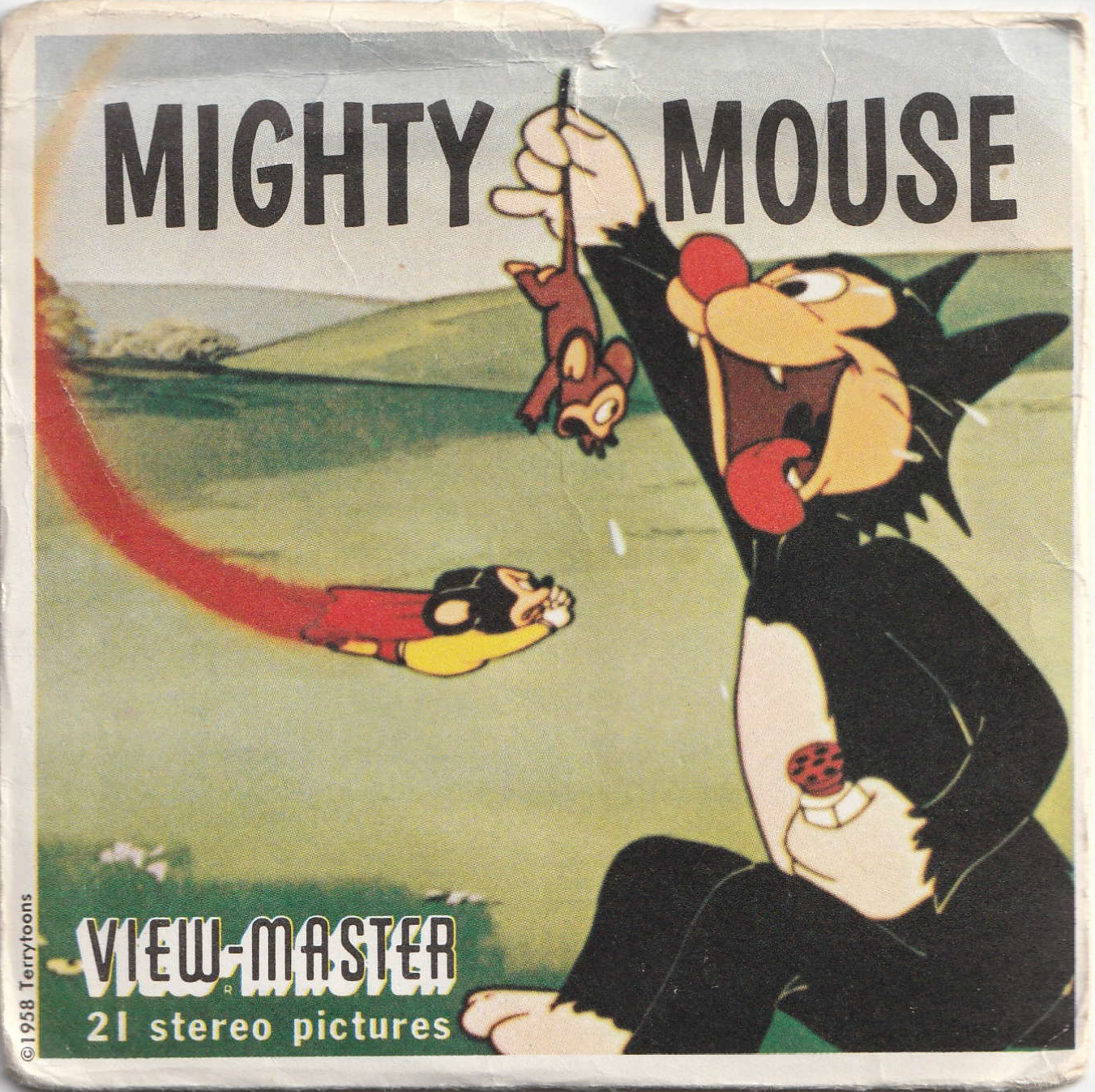 Sleeve for a set of 21 stereo pictures featuring the Mighty Mouse character, licensed from Terrytoons. “Mighty Mouse” is set in Filmotype Navy; a condensed, “free style-serif” film typeface, shown here in all caps. The View-Master logo appears to be based on Phenix American and is accompanied by Franklin Gothic below, in all lowercase, and with a capital I used in place of the numeral 1.