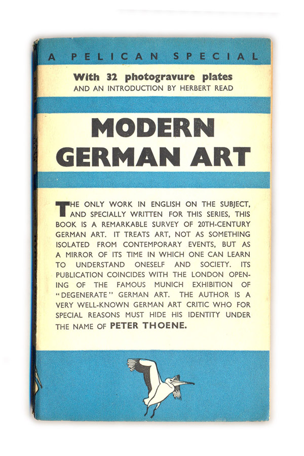 Modern German Art by “Peter Thoene” Contributed by Stephen Coles on Oct 1st, 2013. Artwork published in 1938. Source: www.thingsmagazine.net License: All Rights Reserved. “The author is a very well-known German art critic who for special reasons must hide his identity under the name of Peter Thoene.” Typefaces More about Gill SansGet Gill Sans Formats Books (6476) Topics Art (4633) Tagged withGermany (43)Pelican Books (5)justified text (1044)book covers (5817)all caps (7508)1930s (187) Artwork location United Kingdom (3263) In SetsClassic American Literature (Tessa van der Waals) (8) 1 Comment on “Modern German Art by “Peter Thoene”” Blythwood says: Mar 2nd, 2016 4:25 am Yes, I wondered too … Oto Bihalji-Merin, apparently; see also this pdf. Post a comment Name Email – will not be published Website Your response Submit Comment More Gill Sans in use Faces – “You Can Make Me Dance, Sing Or Anything” / “As Long As You Tell Him” German single cover1974unknownContributed by Florian Hardwig McDonald’s ads (1971)1971Contributed by Stephen Coles Staff Pick Snellen (Type) ChartBruno PonceanoContributed by Bruno Ponceano Sponsor More in Art GQ Korea magazine, December 2019, “Men of the Year”2019Kiyeol KimContributed by Altiplano Typefaces Staff Pick Rock Paper Pixel2019Mark NoadThe Lettering Arts TrustContributed by Jeremy Tankard Reflections by Daniel Eatockc. 2016Daniel EatockContributed by Swiss Typefaces Absolvent*Innen 2020/21/22 exhibition, AdBK Nürnberg2022Andreas WeltnerTobi FrankContributed by Murathan Biliktü More in Books Subjective Atlas of Pakistan2018Annelys de VetTaqi ShaheenNoortje van EekelenContributed by Jasper de Waard The Grain Kings by Keith Roberts (Hutchinson & Co.)1976Chris FossunknownContributed by Florian Hardwig Building Images: The Reconstruction of the Neues Museum2021Reinhard SchmidtContributed by Forgotten Shapes Essential Essays and Selected Poems by Adrienne Rich2018Yang KimContributed by Florian Hardwig Staff Pick More Fonts In Use American Psycho by Bret Easton Ellis (Picador first English hardcover edition)1998unknownMarshall ArismanContributed by Patrick Concannon Staff Pick BUTT magazine2001Jop van BennekomContributed by Andreas Kofler Staff Pick Kleines Blumen-ABCc. 1960Maul und Co.Photo(s) by altpapiersammler on Flickr. Staff Pick Pamoja Gallery poster1968Bill HowellContributed by Florian Hardwig Staff Pick