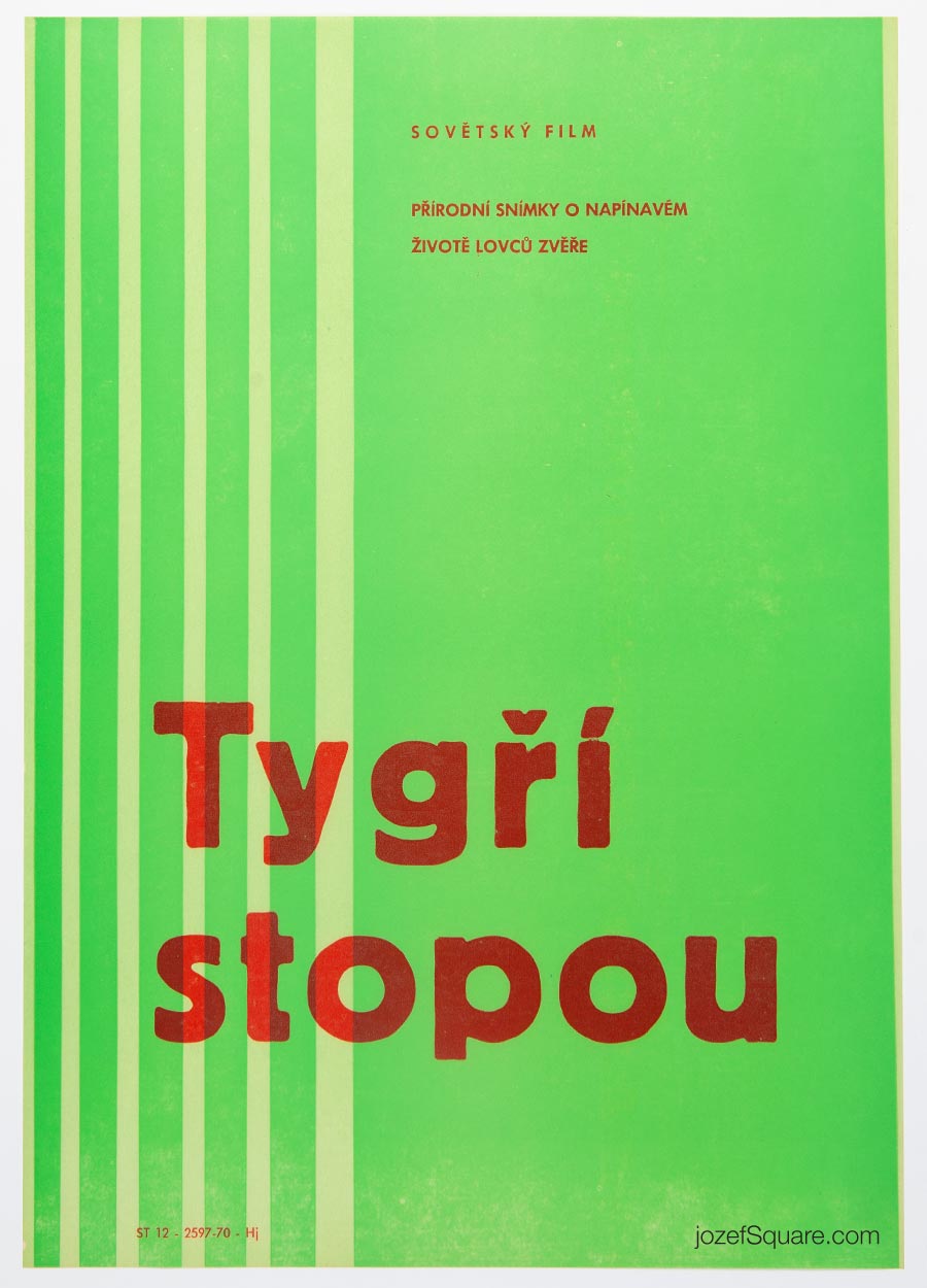 Berthold Block is put to use in this simplistic movie poster for an uncredited Czechoslovak poster from 1970 for the Soviet movie Hunting in Siberia from 1959. Directed by Gleb Nifontov, its original title is Zverolovy (“Beasts”). In Czech, it’s known as Tygří Stopou (“Tiger Track”). The smaller text appears to be using Futura (or a similar typeface).