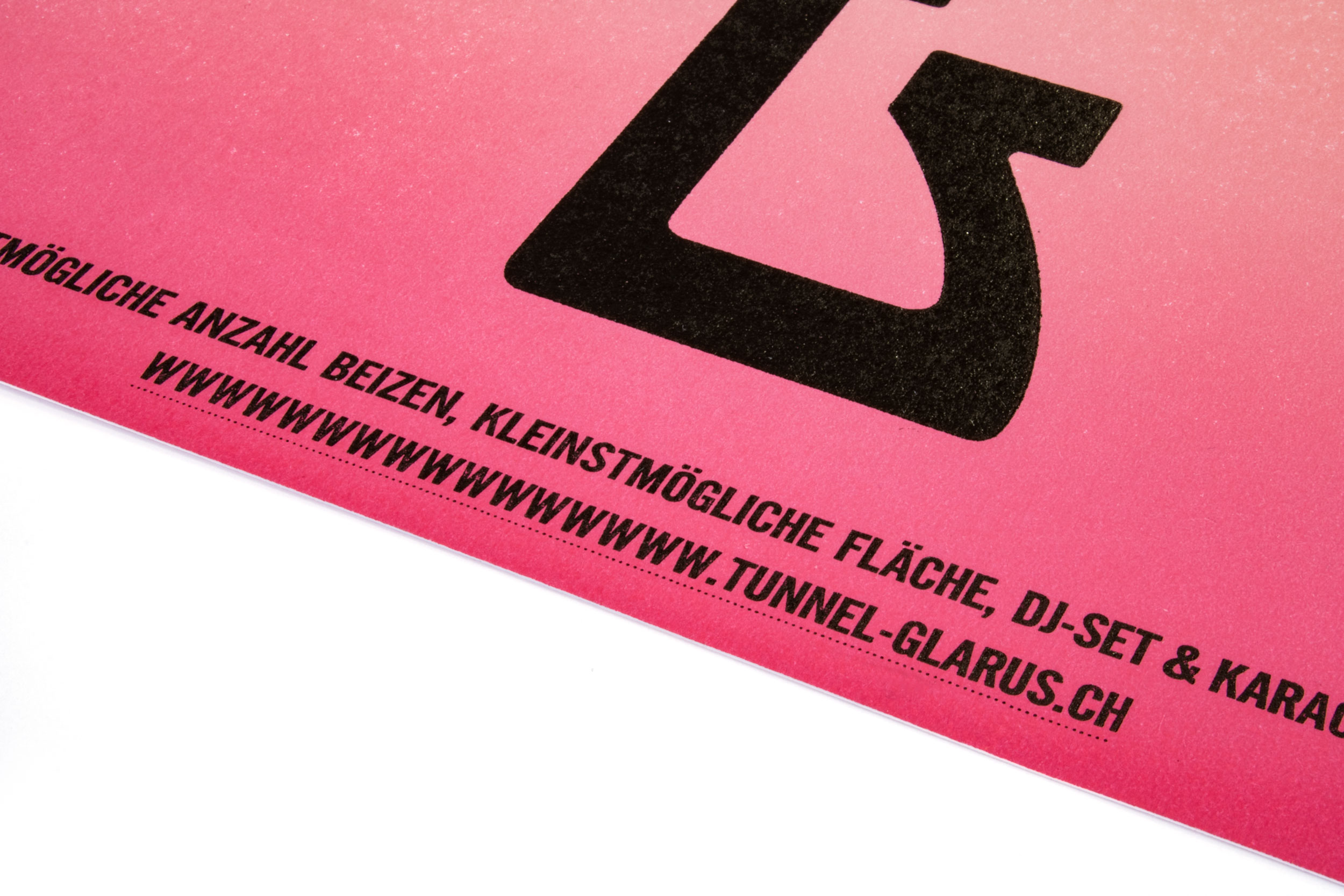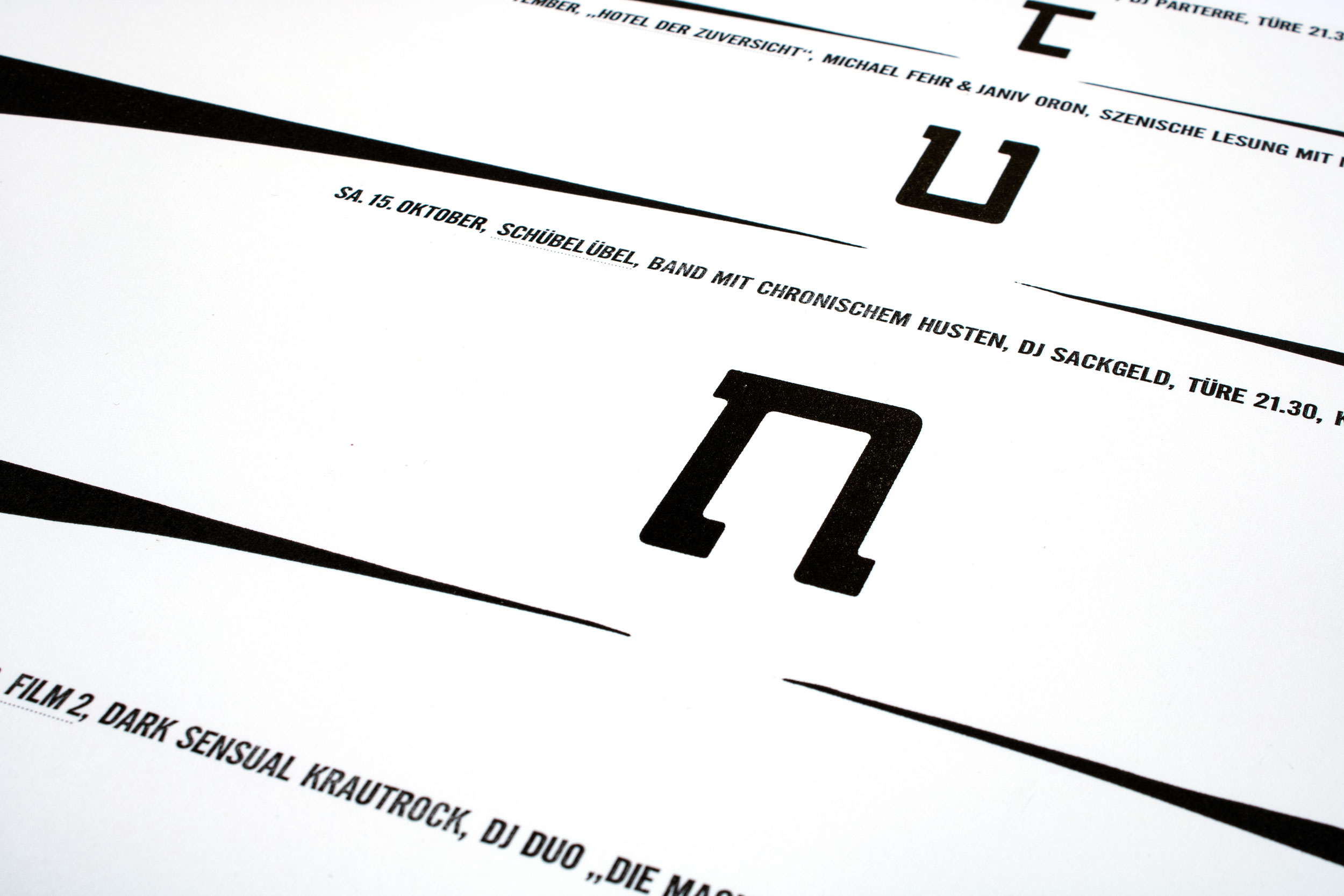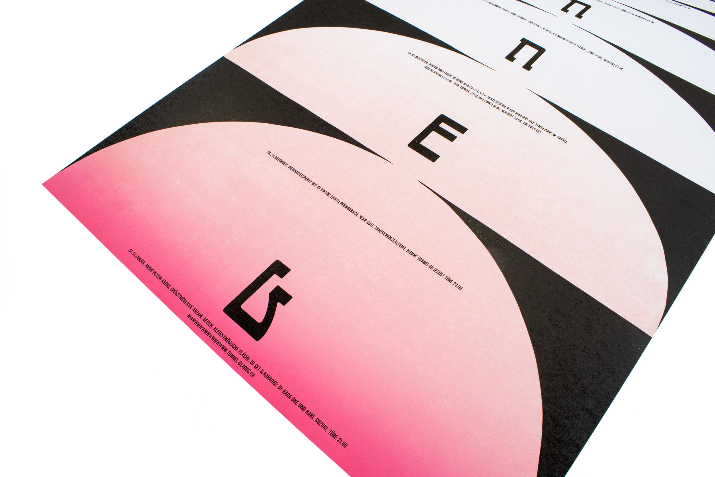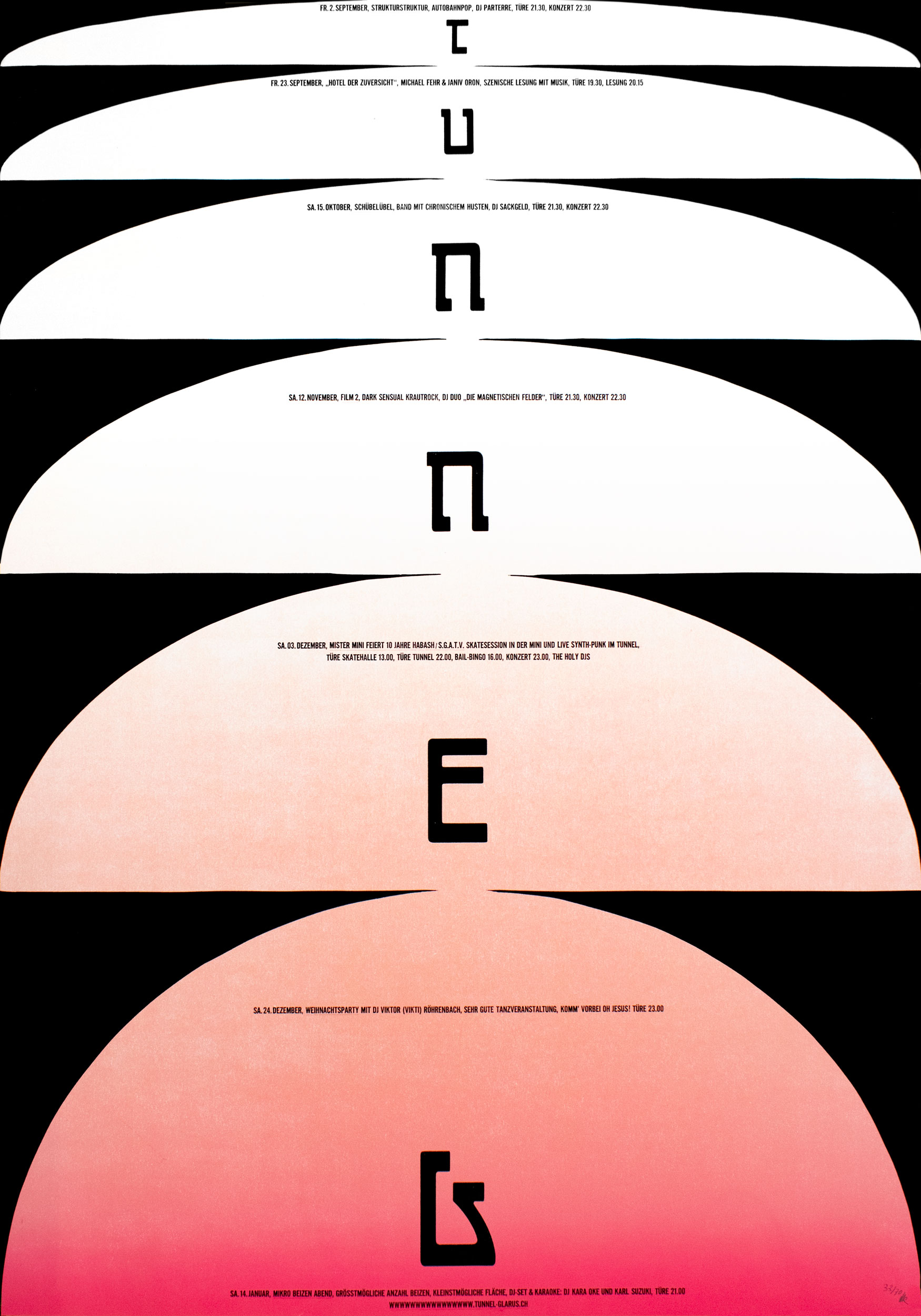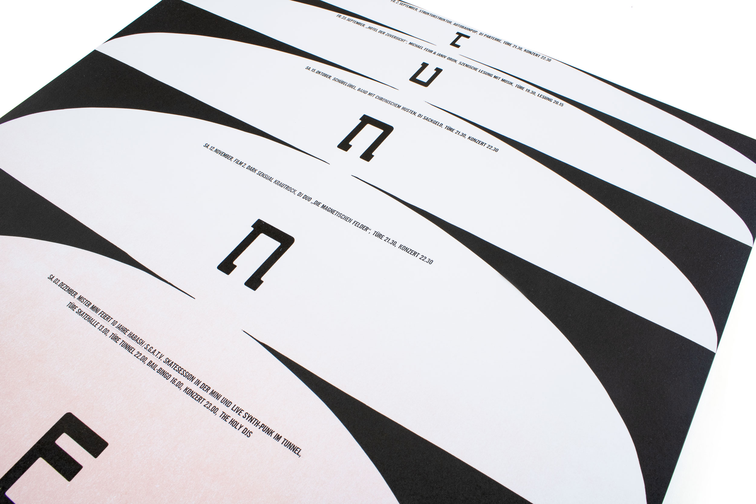 Program poster for Tunnel, a club in Glarus, Switzerland. Letterpress printed from hand-cut linoleum, cast Ludlow slugs (Ludlow Condensed Gothic) and wood type (Meier-Schrift).