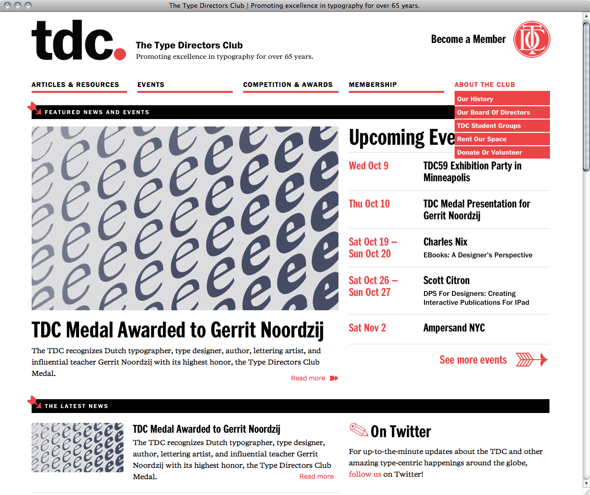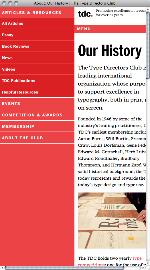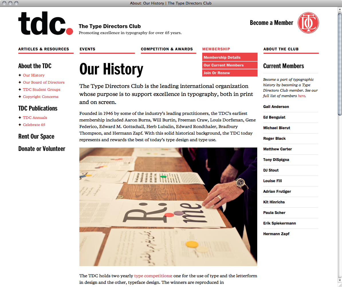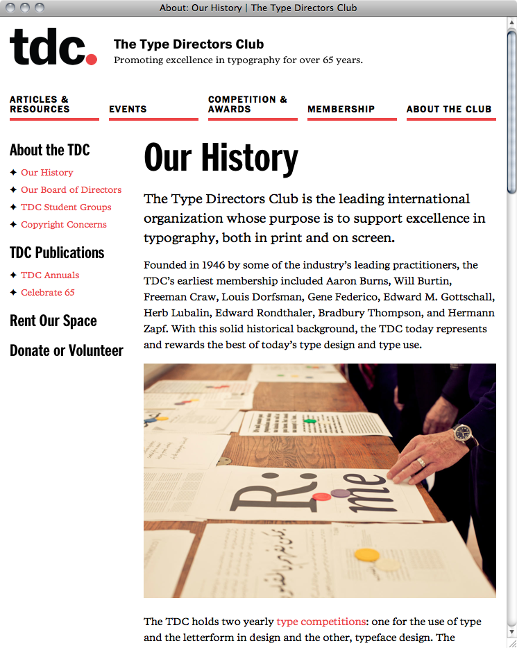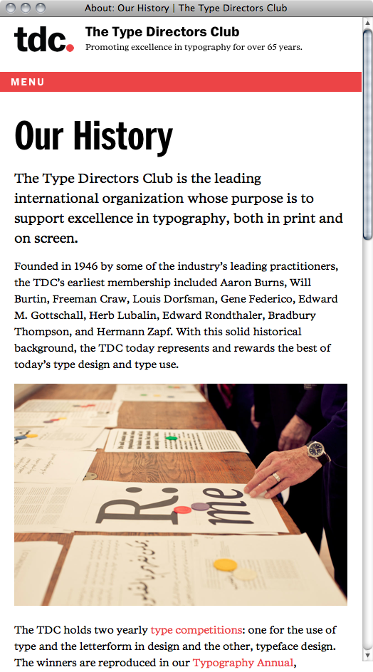 The fully responsive new Type Directors Club website, designed by tdc board members Jessica Hische and Nick Sherman, uses ITC Franklin Bold and Condensed Bold for headlines and menu, and Poynter Serif RE (roman, italic and bold) for body copy. Benton Sans RE makes an appearance at small sizes, for instance in the “Read more” links, accompanied by Zapf Dingbats (of which Sherman tried to sneak in as many as possible). ✌