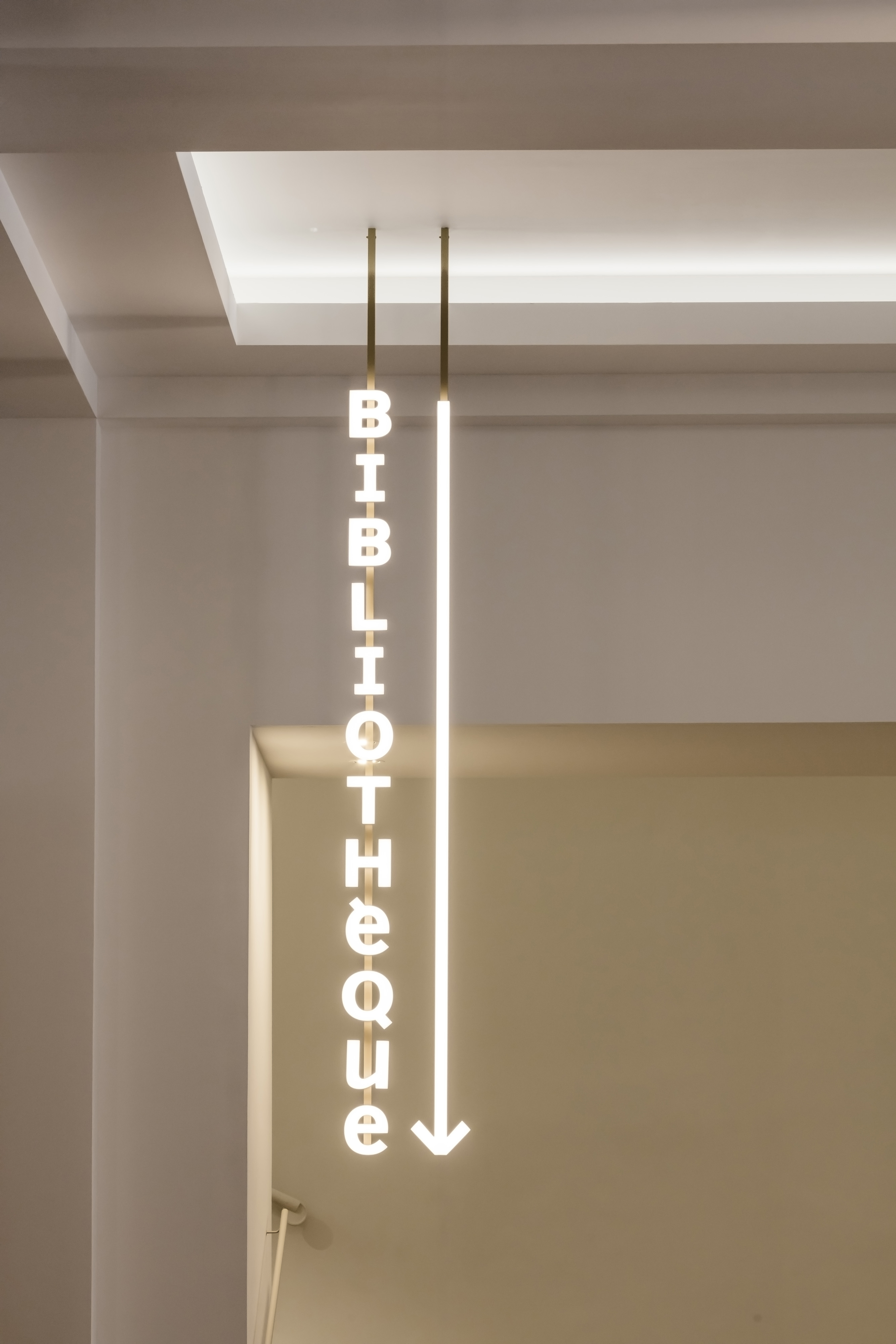 They asked graphic design studio Baldinger•Vu-Huu to design the hall signage and furniture. The idea was to bring the feeling of big cities and their emblematic centres and crossroads into the building. The vertical signage is inspired by vertical shop signs and is all visible from the centre of the entry hall, inviting visitors to discover the different parts of the building. They used BVH Newut for the signs, playing with the use of uppercase mixed with lowercase.