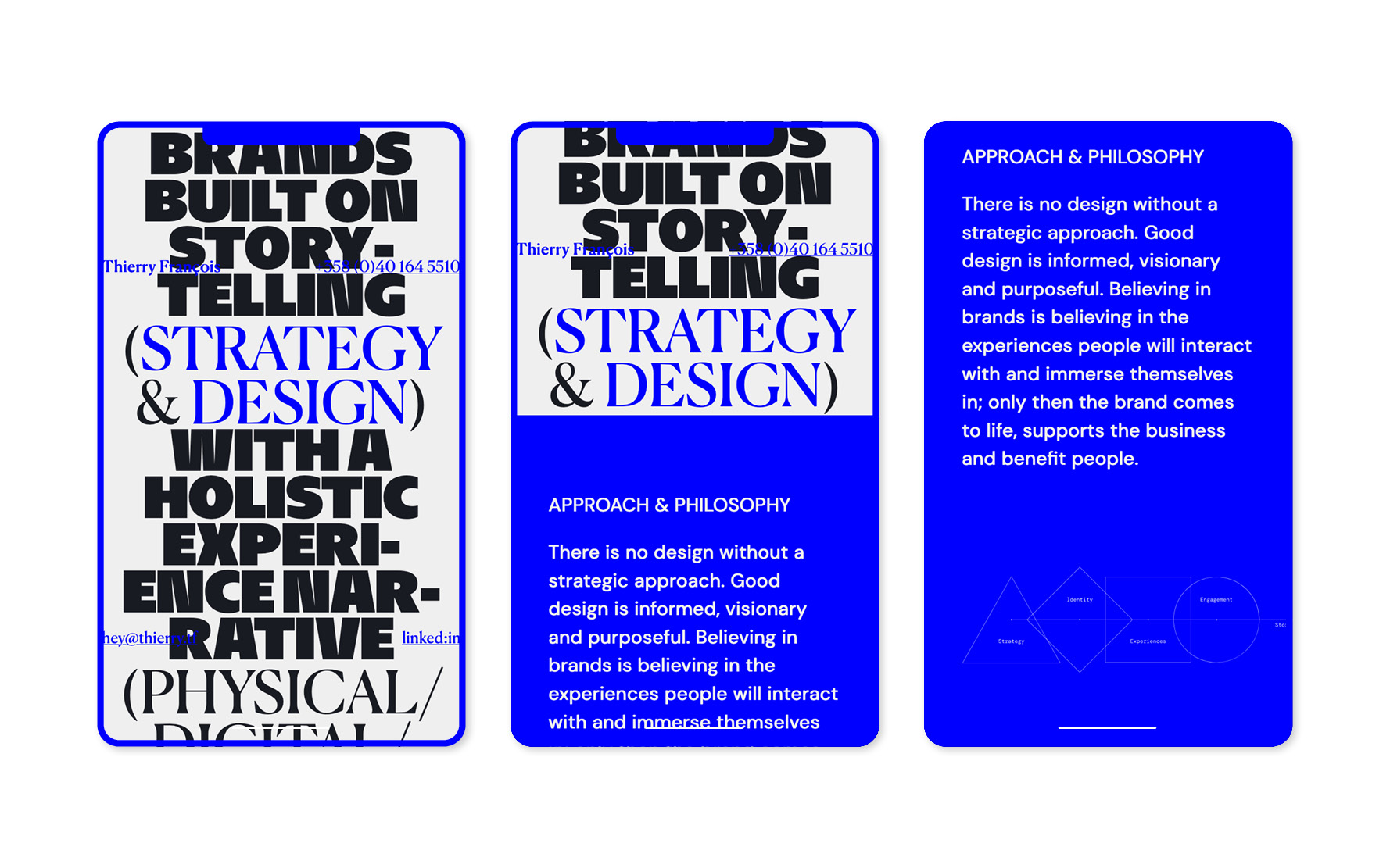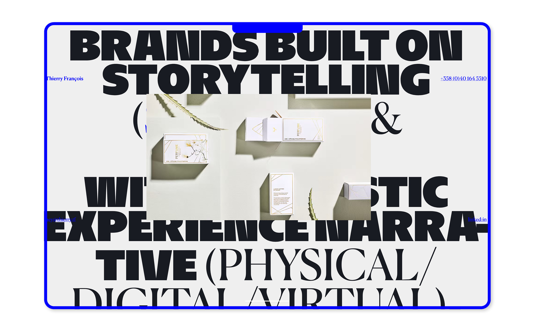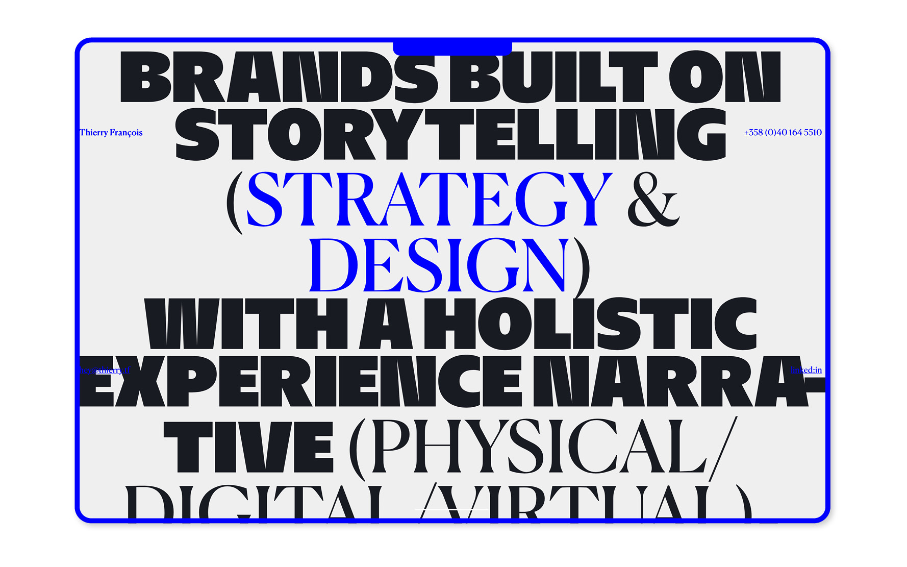 The website of art director Thierry François sports a delicate association of a lighter weight of Commercial Type’s Canela contrasting with Reymund Schröder’s NaN Hyena Noon Black. This association is based on an extreme contrast in weight, contrast, and serif presence between the two typefaces, somewhat only brought together by their use at the same size and color in an all-caps paragraph. We could add that Hyena’s humanist skeleton increases its kinship with Canela.