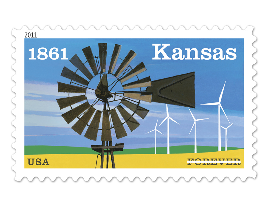 “On January 27, 2011, in Topeka, Kansas, the Postal Service™ issued a “Kansas Statehood (Forever)” commemorative stamp. This stamp commemorating the 150th anniversary of Kansas statehood features artwork by renowned commercial and fine-art painter Dean Mitchell, Tampa, Florida and designed by Howard E. Paine, Delaplane, Virginia.” — USPS