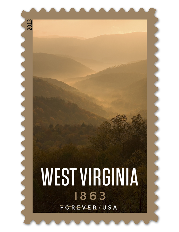 “The stamp features a photograph by West Virginia photographer Roger Spencer showing an early morning view looking east from the Highland Scenic Highway (Route 150) in Pocahontas County, West Virginia, within Monongahela National Forest. Greg Breeding [of Virginia] served as art director.” — USPS