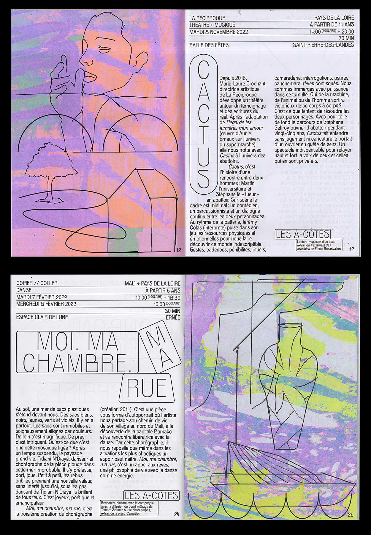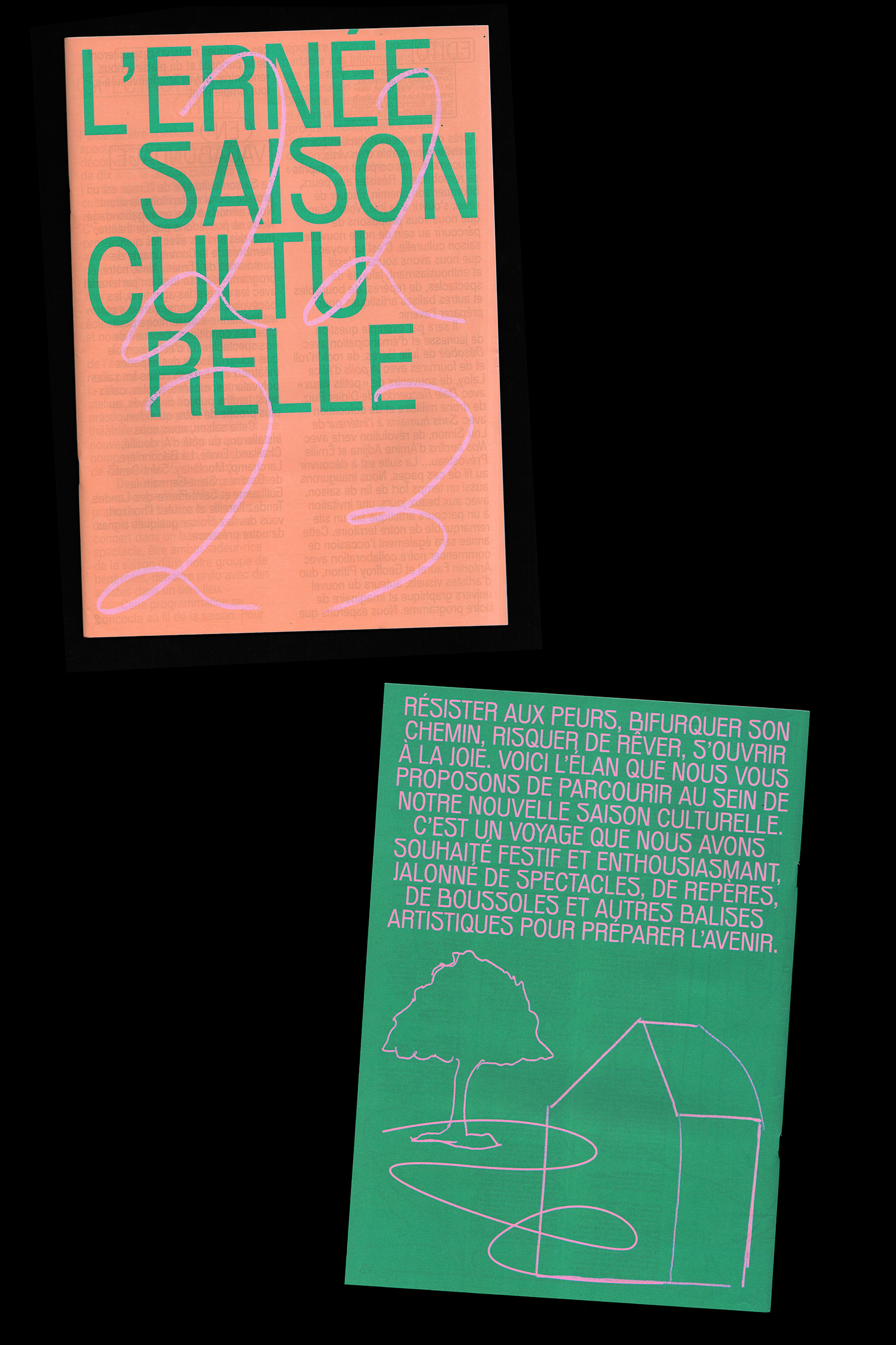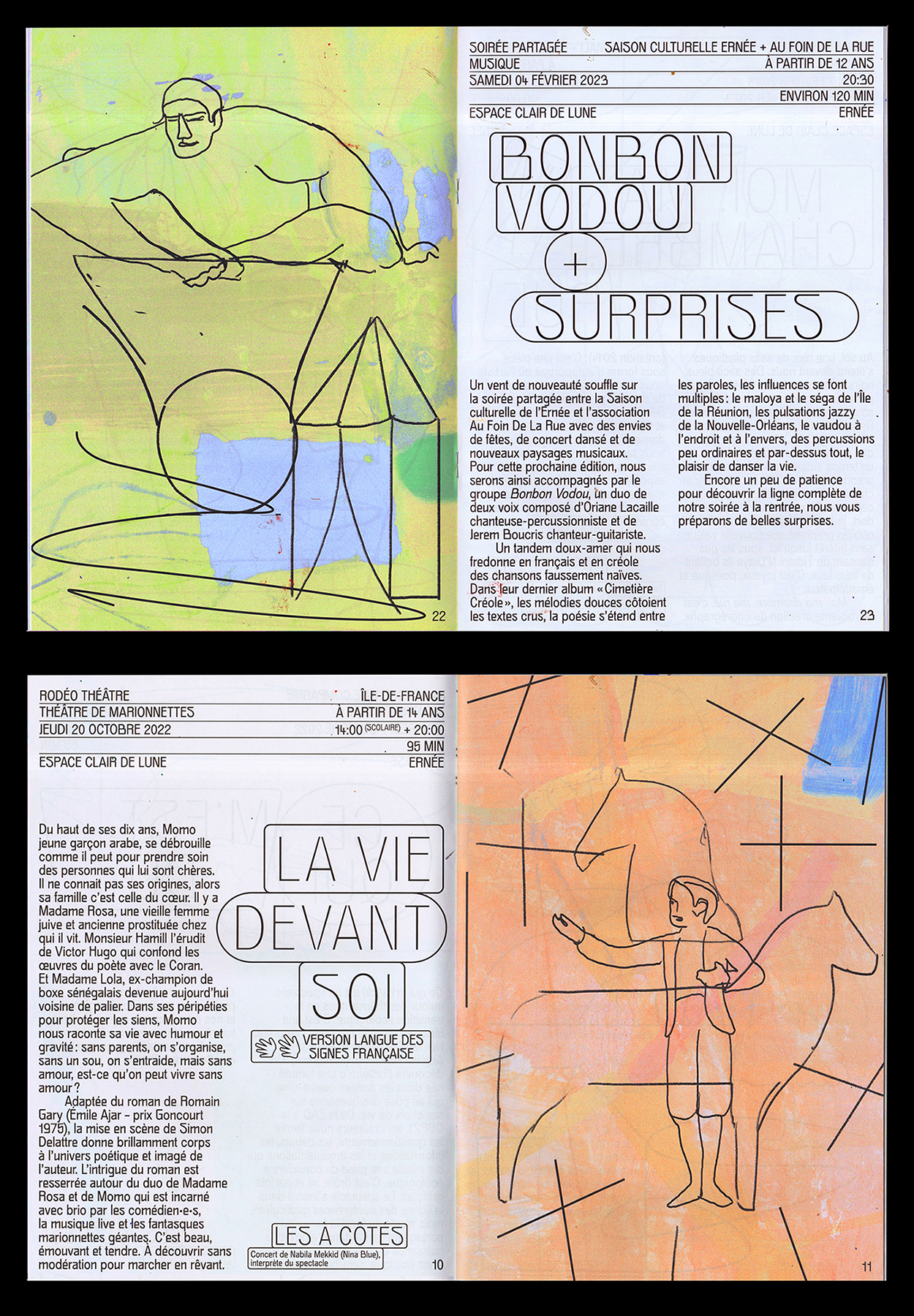 The program of the cultural season of Ernée, a commune in the Mayenne department in north-western France, was designed by Geoffroy Pithon and Antonin Faurel. The typeface Gröb, designed by Benoît Bodhuin, is featured throughout the book; for titles, the designers made it slightly thinner by applying a stroke to its outlines.