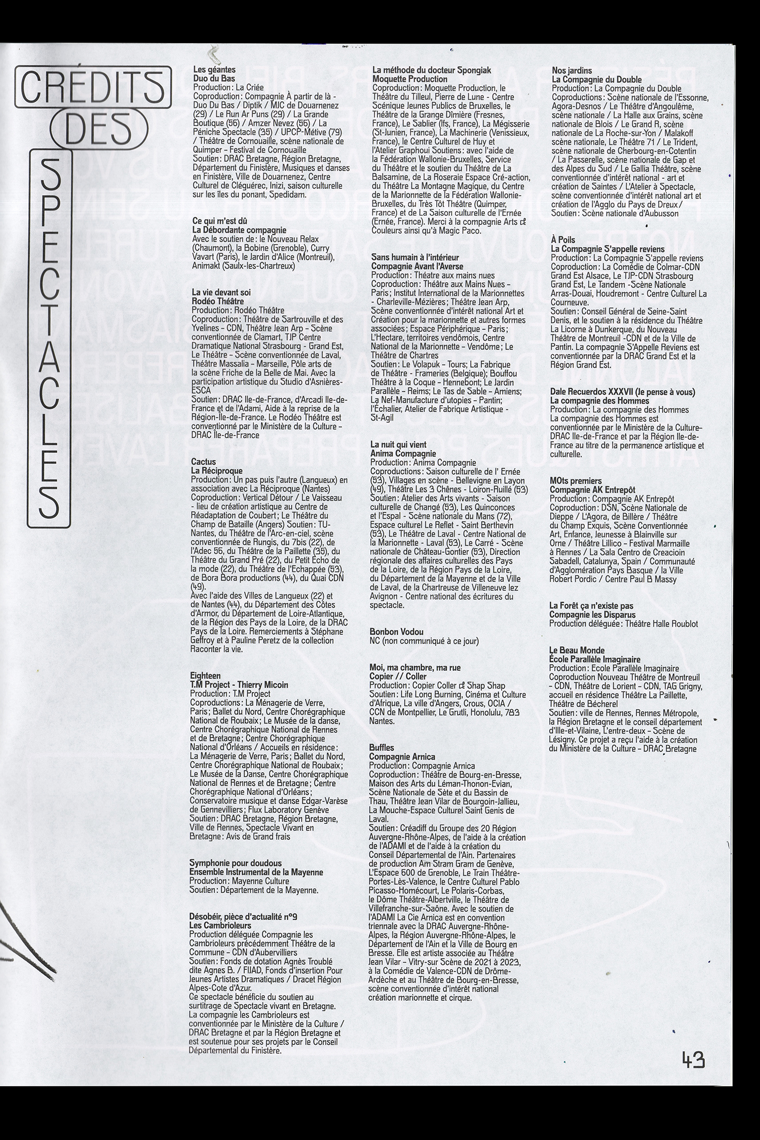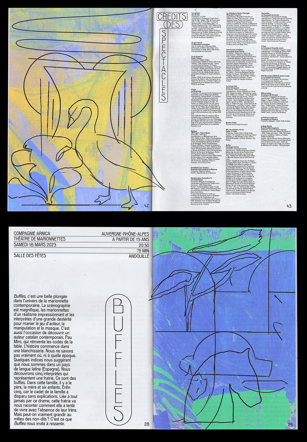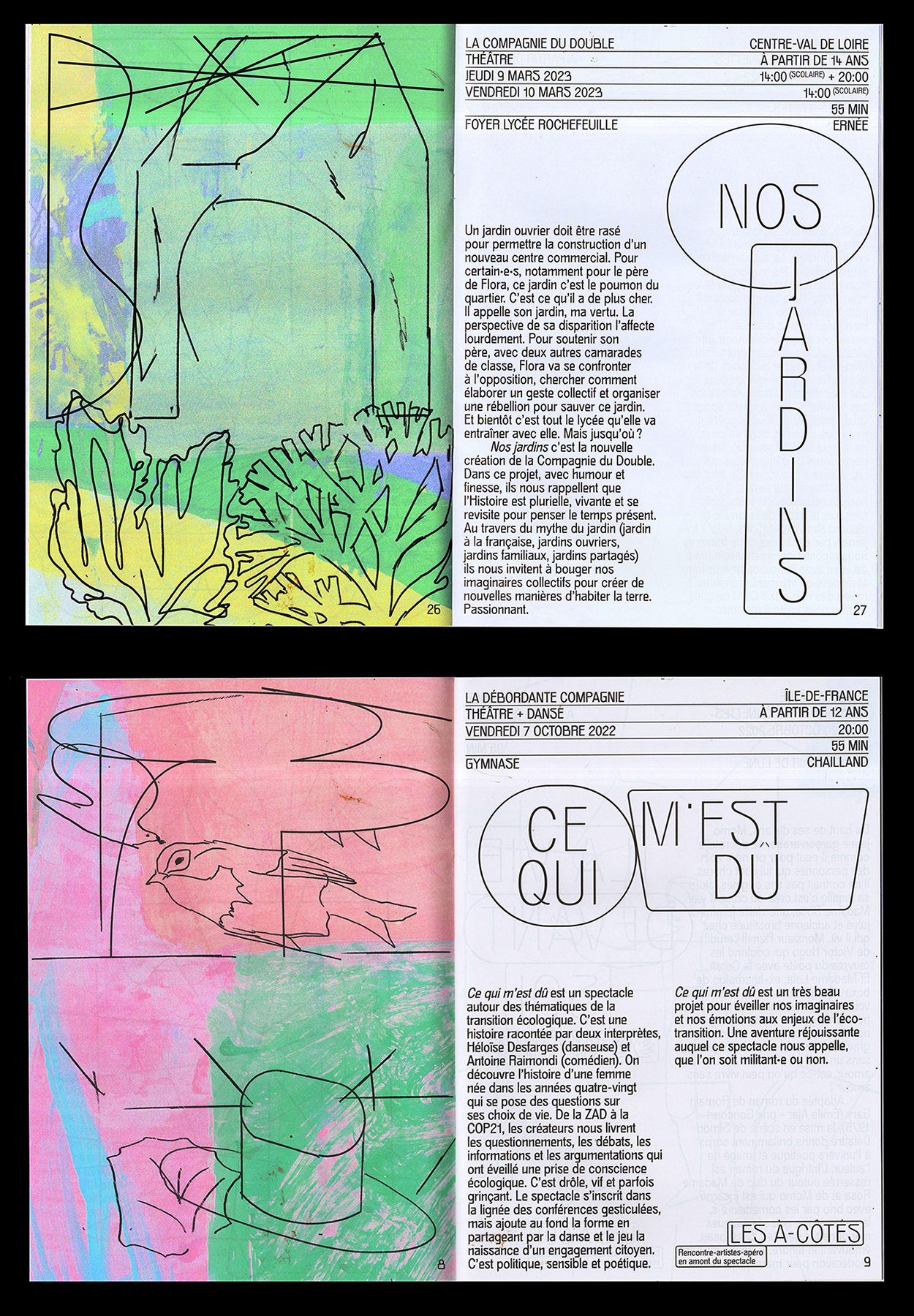 The program of the cultural season of Ernée, a commune in the Mayenne department in north-western France, was designed by Geoffroy Pithon and Antonin Faurel. The typeface Gröb, designed by Benoît Bodhuin, is featured throughout the book; for titles, the designers made it slightly thinner by applying a stroke to its outlines.