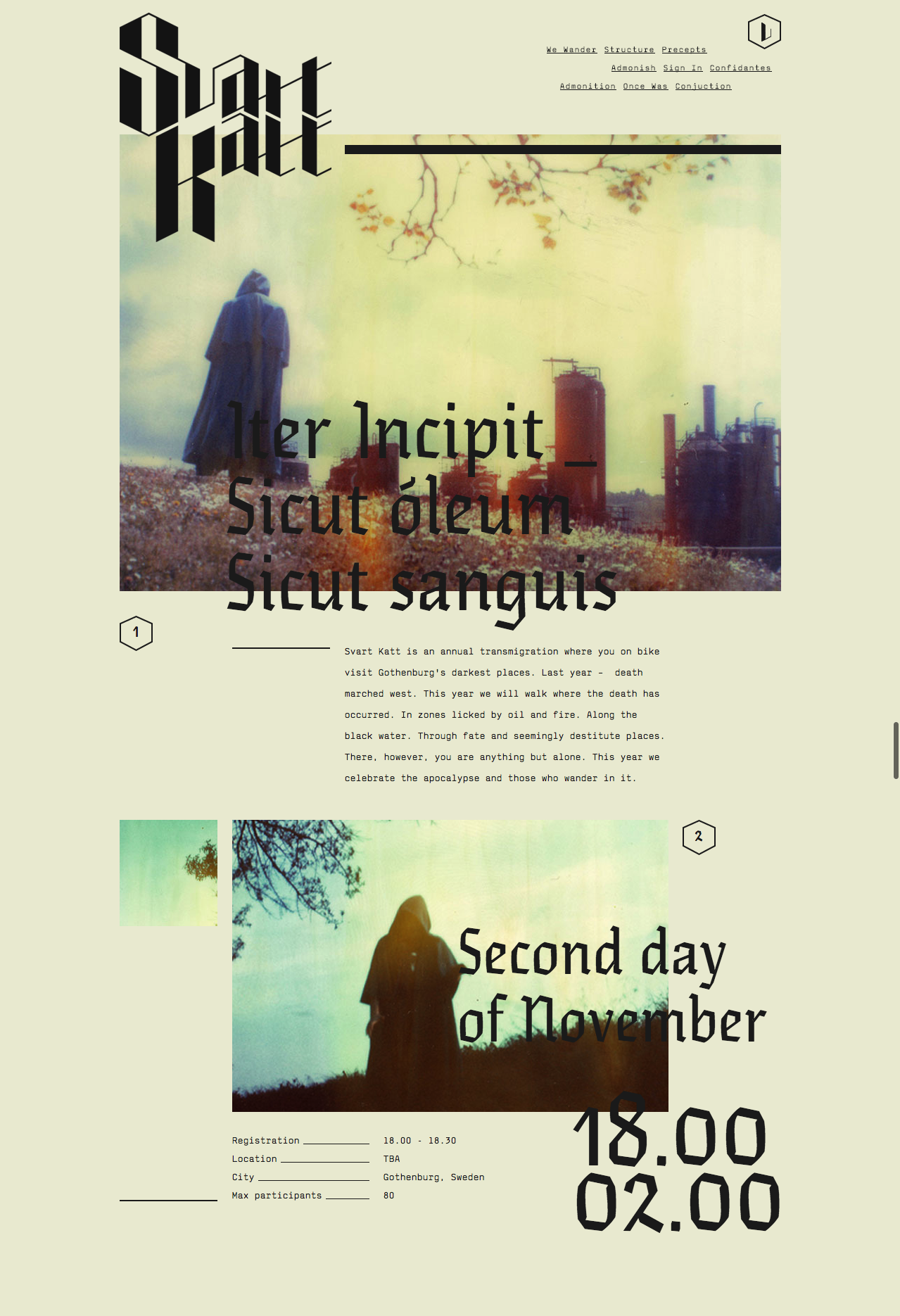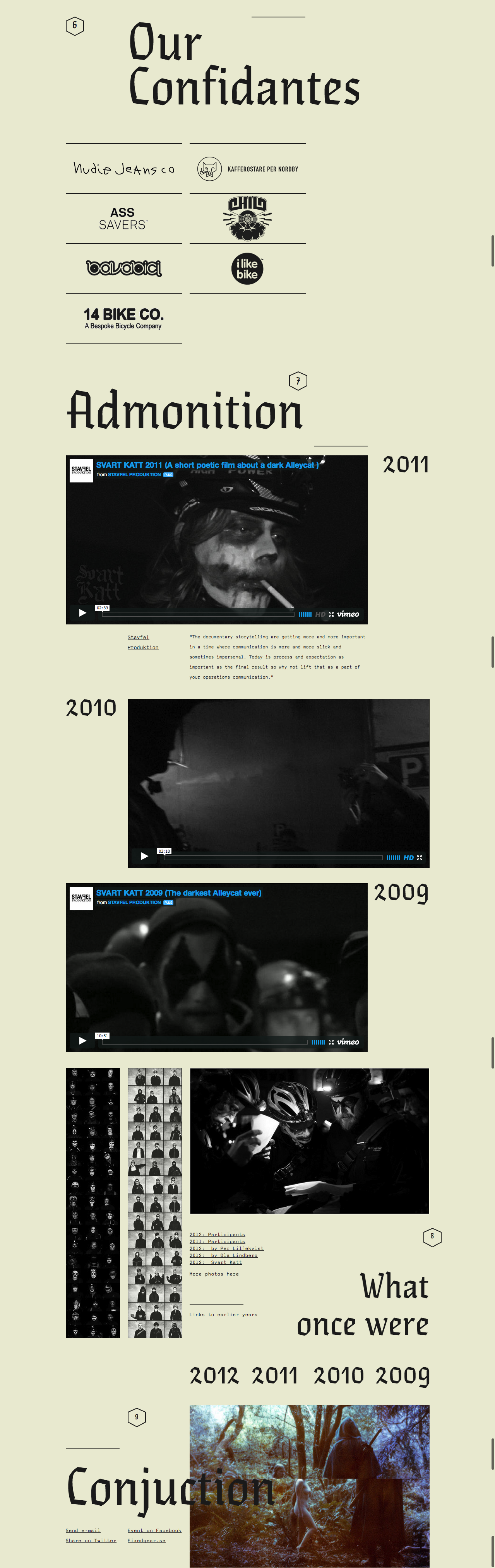 Svart Katt Alleycat Contributed by Patch Hofweber on Oct 16th, 2013. Artwork published in 2013. Source: svartkatt.info © Kristian Hallberg 2013. License: All Rights Reserved. Sweden’s darkest and largest alleycat bike race in its fifth annual edition – Svart Katt V Art Direction: Notropic All photos by: Brandon C Long Web development: Liten Fågel Soundtrack/Music: Æther Illustration: Alexander Andersson Source: svartkatt.info © Kristian Hallberg 2013. License: All Rights Reserved. Source: svartkatt.info © Kristian Hallberg 2013. License: All Rights Reserved. Source: svartkatt.info © Kristian Hallberg 2013. License: All Rights Reserved. Typefaces More about Eskapade FrakturGet Eskapade FrakturMore about Sax Mono Formats Web (5621) Topics Entertainment (1540) Event (3213) Sports (783) Designers/Agencies Notropic (1) Kristian Hallberg (1) Liten Fågel (1) Tagged withbicycling (95)webfonts (449)racing (19) Artwork location Sweden (442) In SetsType Designs by Women (Fonts In Use Staff) (1887) Post a comment Name Email – will not be published Website Your response Submit Comment More Eskapade Fraktur in use Forêts en Trièves2011Maison du Mont Aiguille Vercors-TrièvesSébastien DégeilhContributed by TypeTogether Blasphemy by Olly Wood2024Olly WoodContributed by Olly Wood Staff Pick Prawdziwe wyobrażenie trojga dzieci [...], Second Edition Project2020Ada PawlikowskaContributed by Ada Pawlikowska Staff Pick Sponsor More in Event Mirage Machine2022Ahora StudioGabriel MafféïsContributed by Production Type Staff Pick Alkantara Festival 20182018Ana Teresa AscensãoContributed by R-Typography Staff Pick Montréallez 20102010unknownContributed by Florian Hardwig Joe & Jo wedding blessing invitation2017Joe ElwellContributed by Joe Elwell More in Web Sabrina Lucas2021TwistudioContributed by Vanille Twistudio H/Advisors2022BrandBoxRobin De HaroContributed by BrandBox TYPO Berlin 2013, “Touch”2013studio adhocContributed by Florian Hardwig You Creative Media websitec. 2023Giulia BoggioYou Creative MediaContributed by Giulia Boggio More Fonts In Use Cino tribacchettac. 2017ZirkumflexGregory CadarsContributed by Florian Runge Staff Pick Ark Life website2021Other OfficeShauna BuckleySimon SweeneyContributed by Max Phillips Staff Pick Ernst Barlach stamp2020Thomas MayfriedContributed by Florian Hardwig Staff Pick Fluxus, Cranbrook Art Museum1989Katherine McCoyContributed by Stéphane Darricau Staff Pick