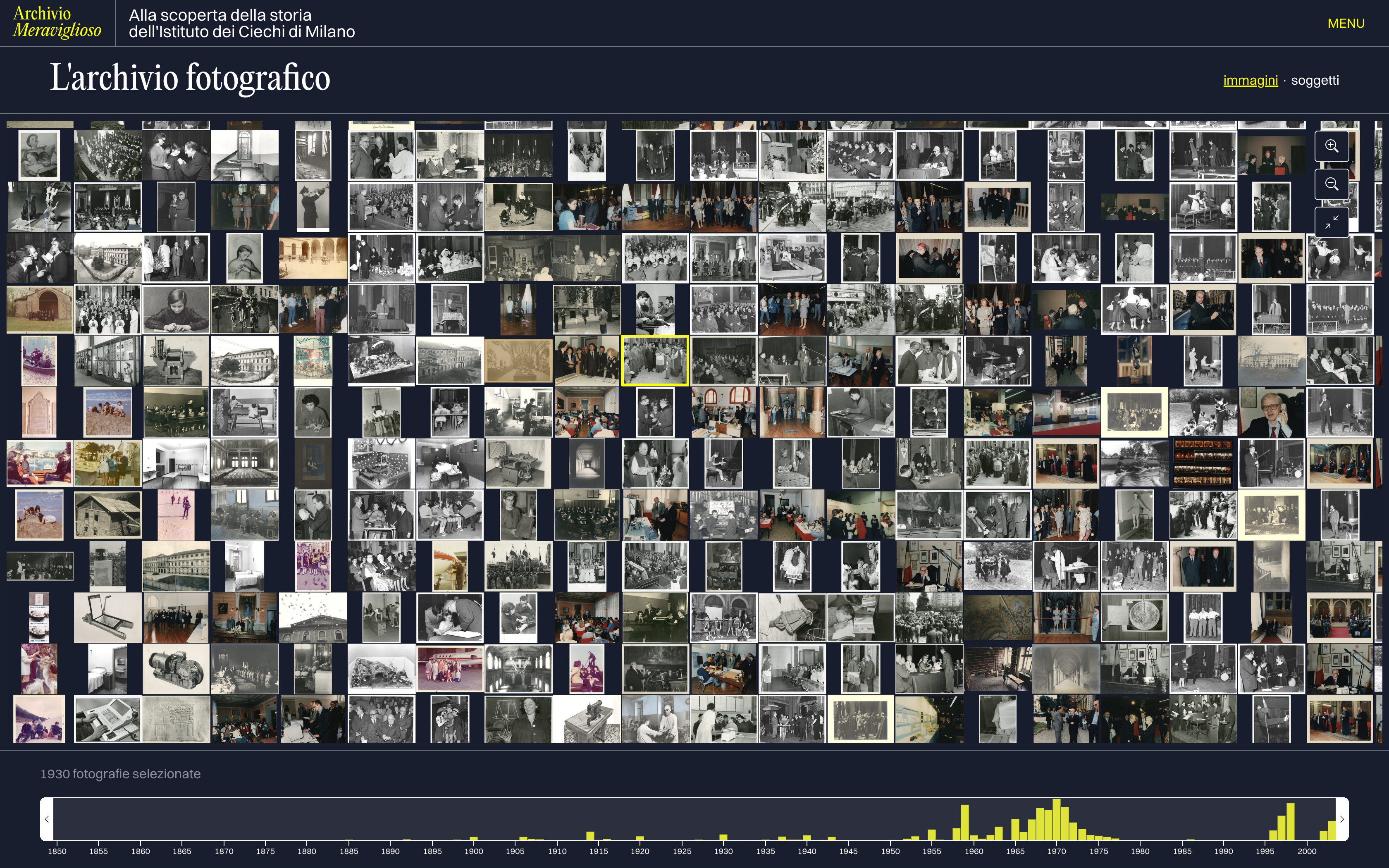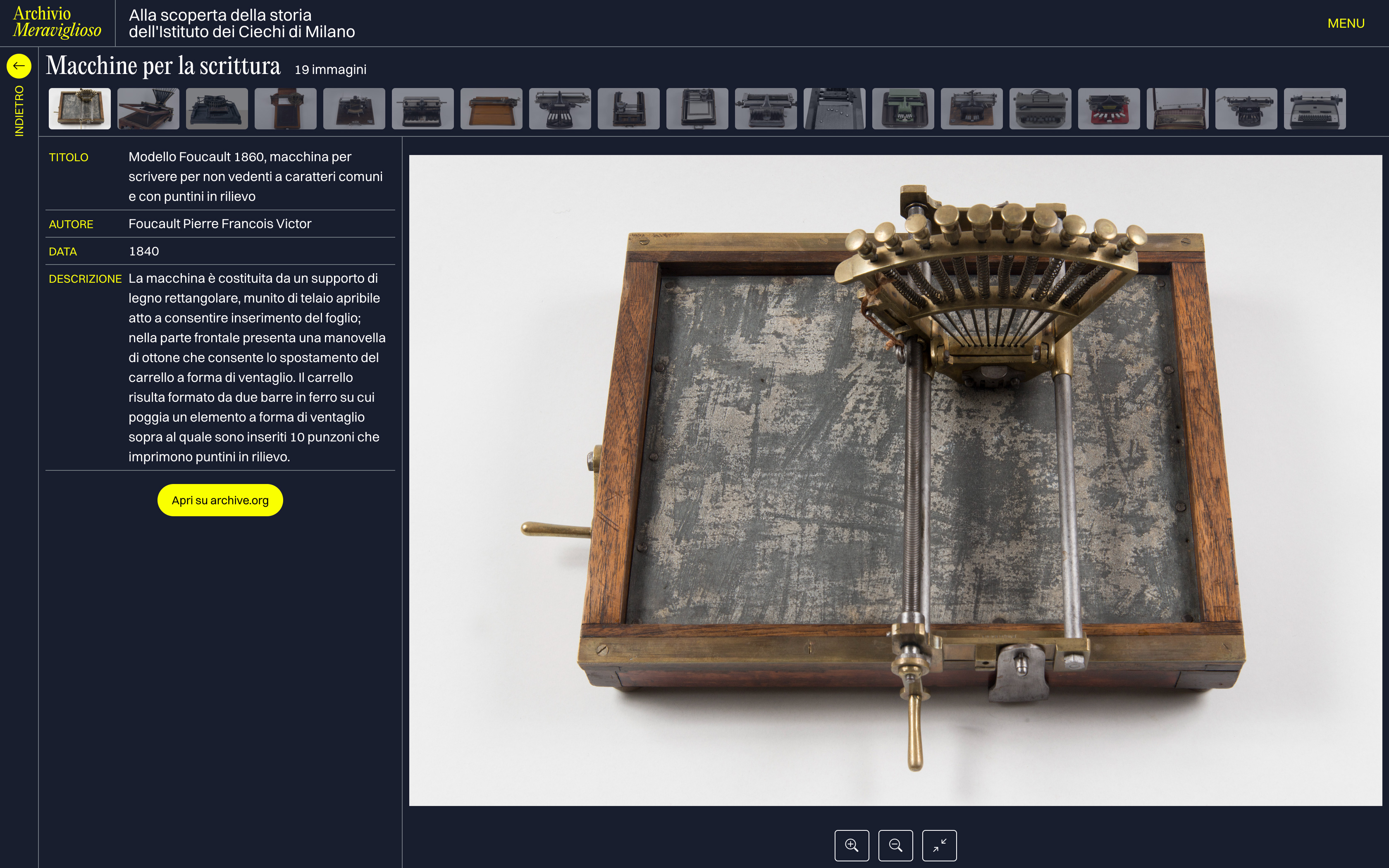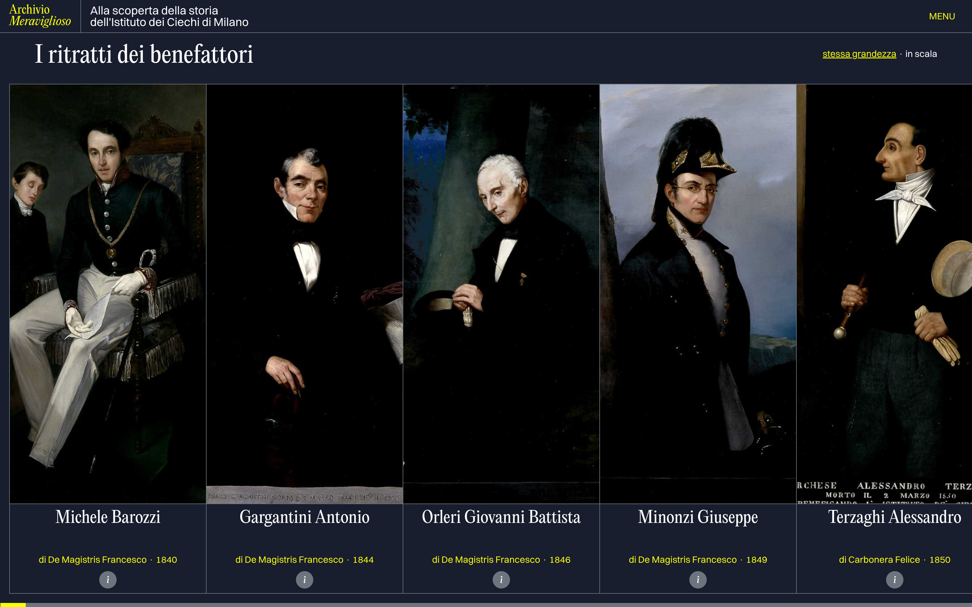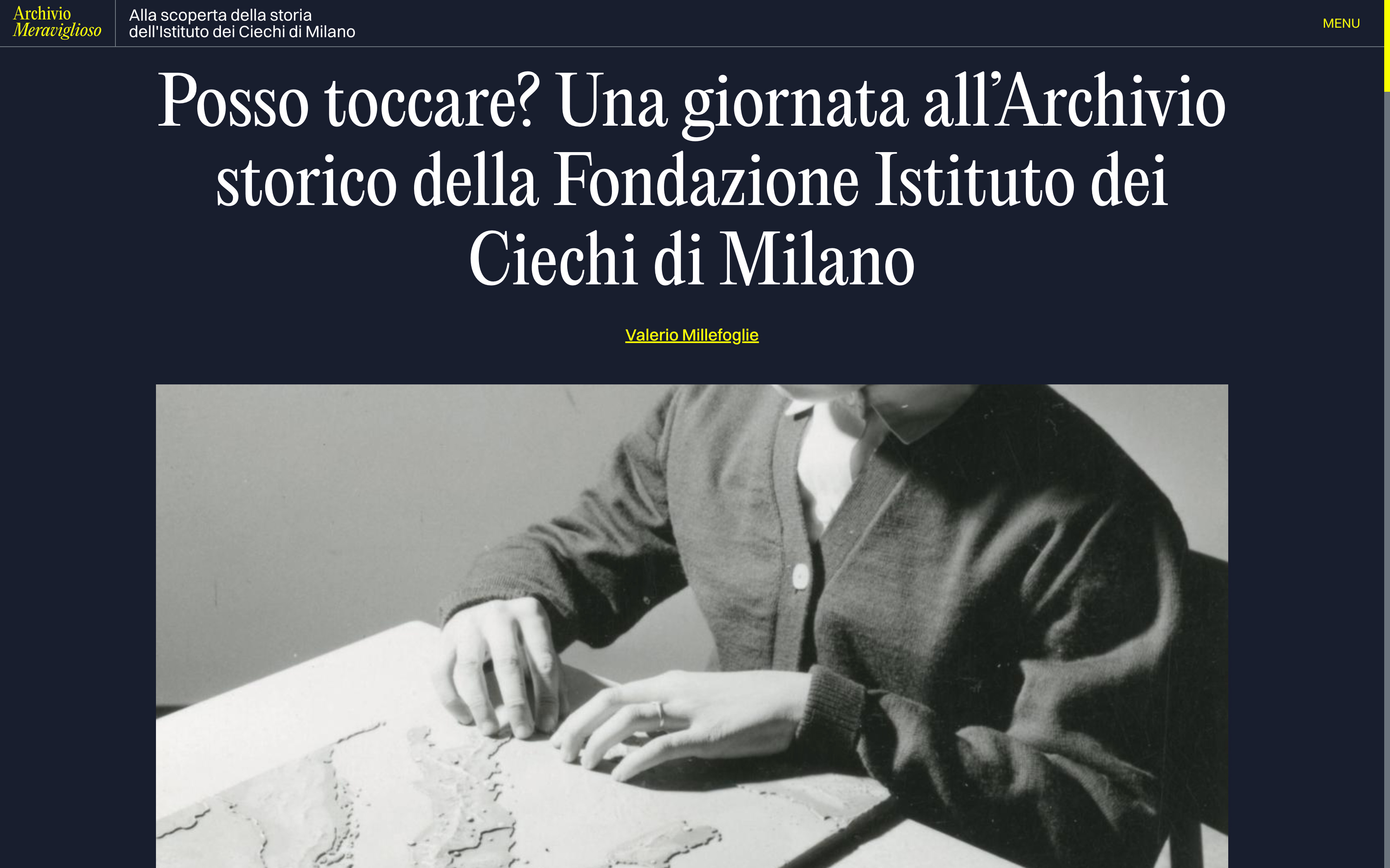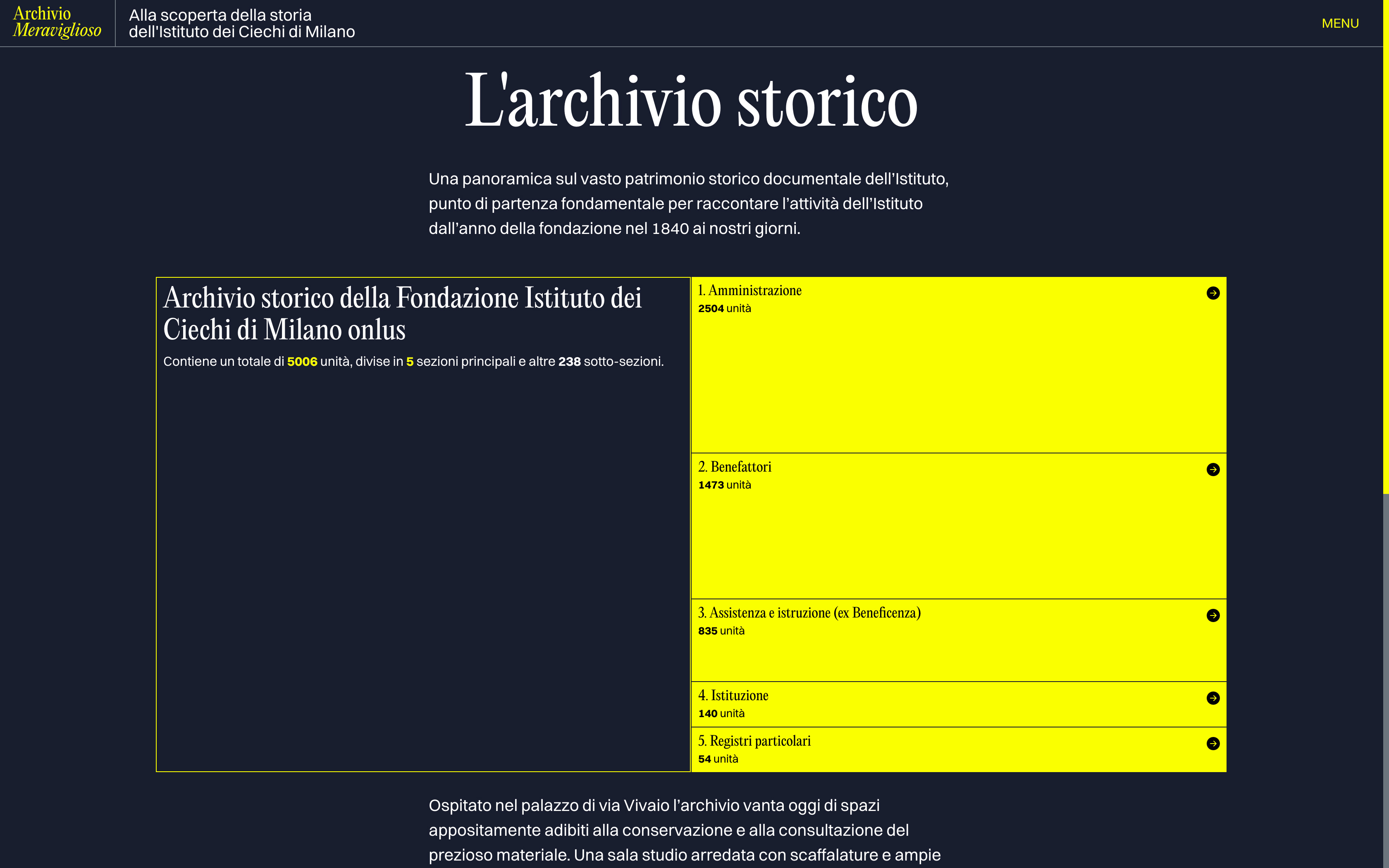 Archivio Meraviglioso is a digital platform focused on the history of Fondazione Istituto dei Ciechi, a 182 years old organization devoted to the social and cultural inclusion of the visually impaired. The website was designed and developed by Calibro, a studio based in Milan, focused on data driven digital experiences and research, while other partners of the project are cheFare and Wikimedia Italia.